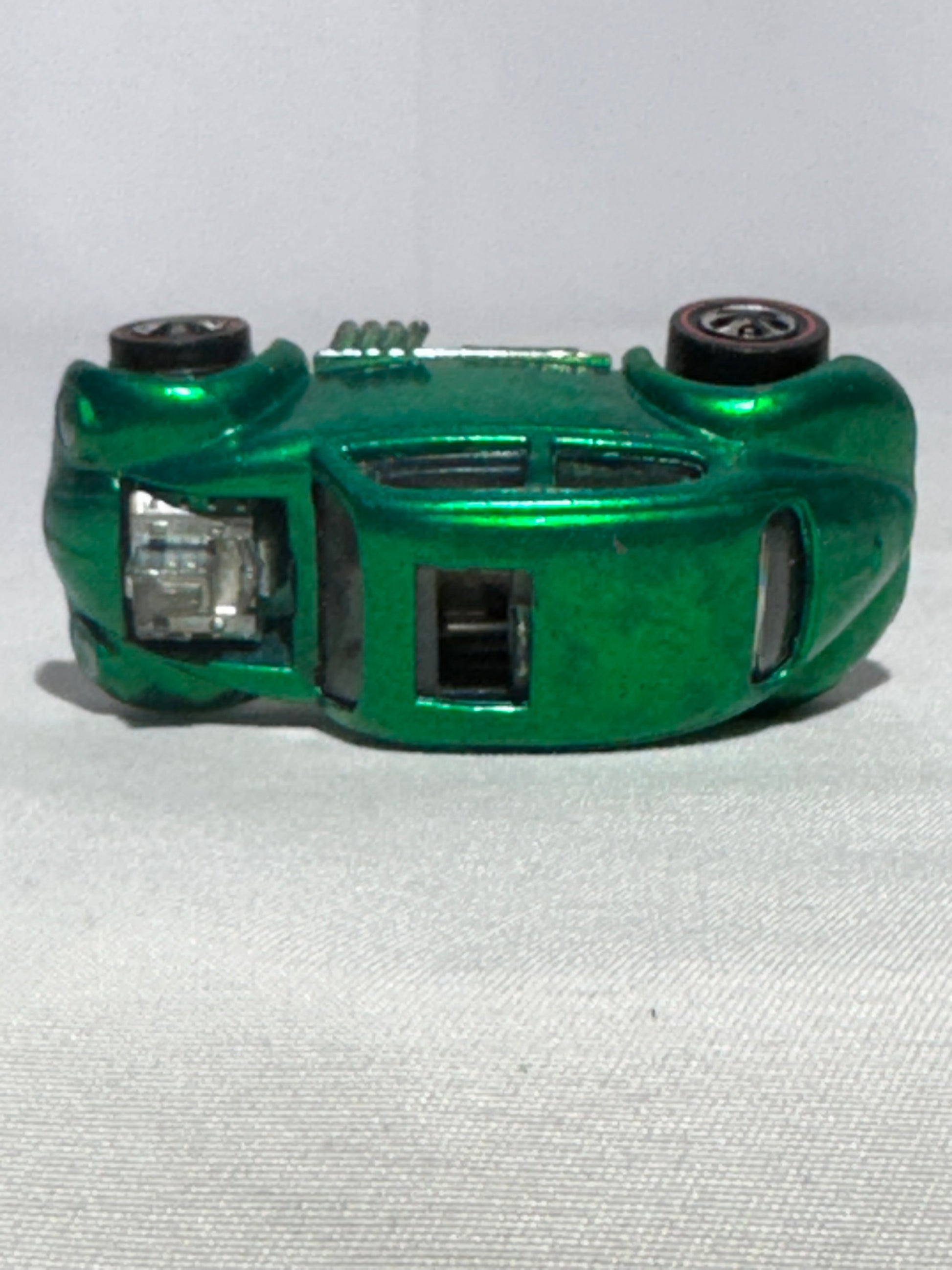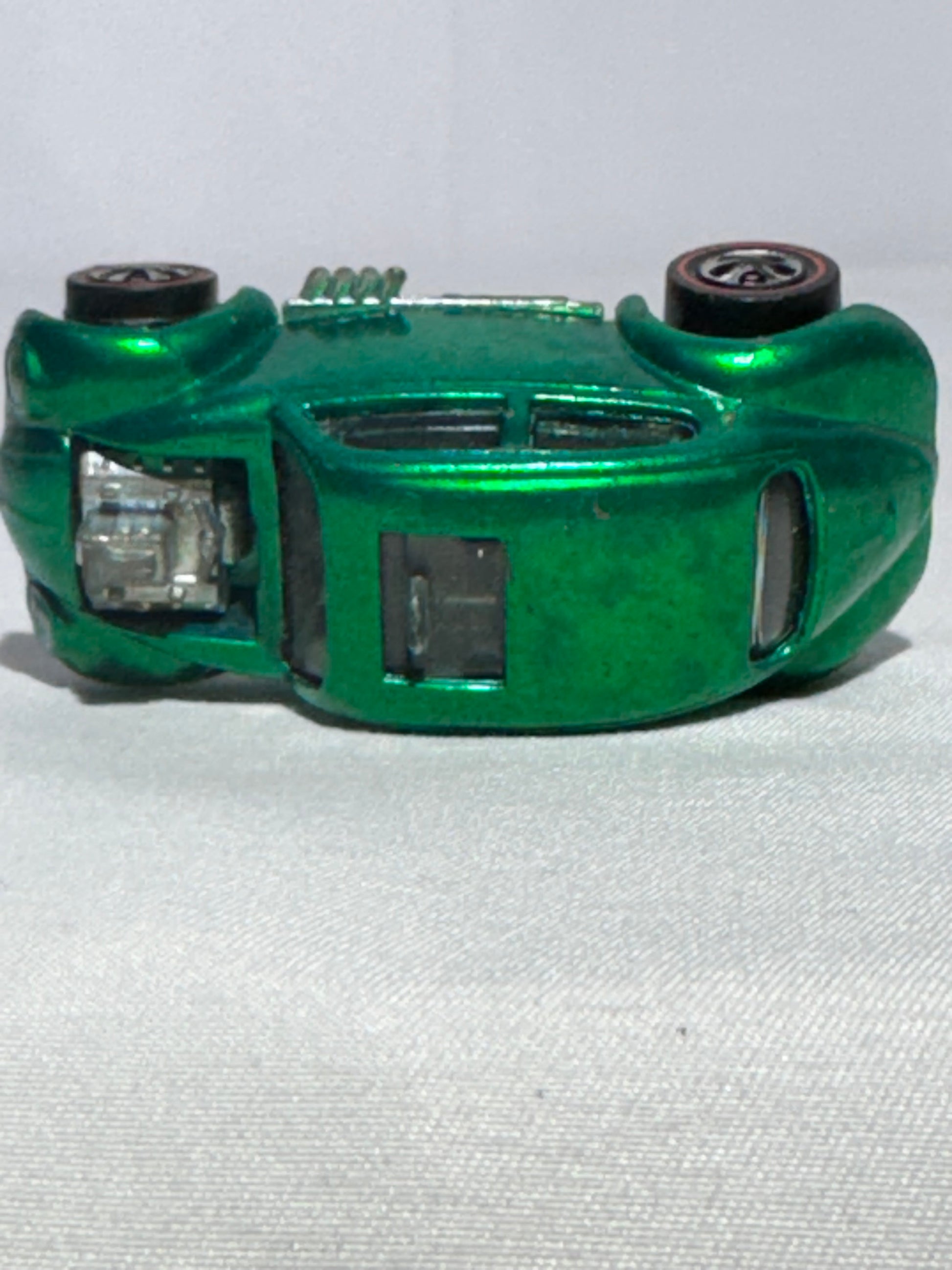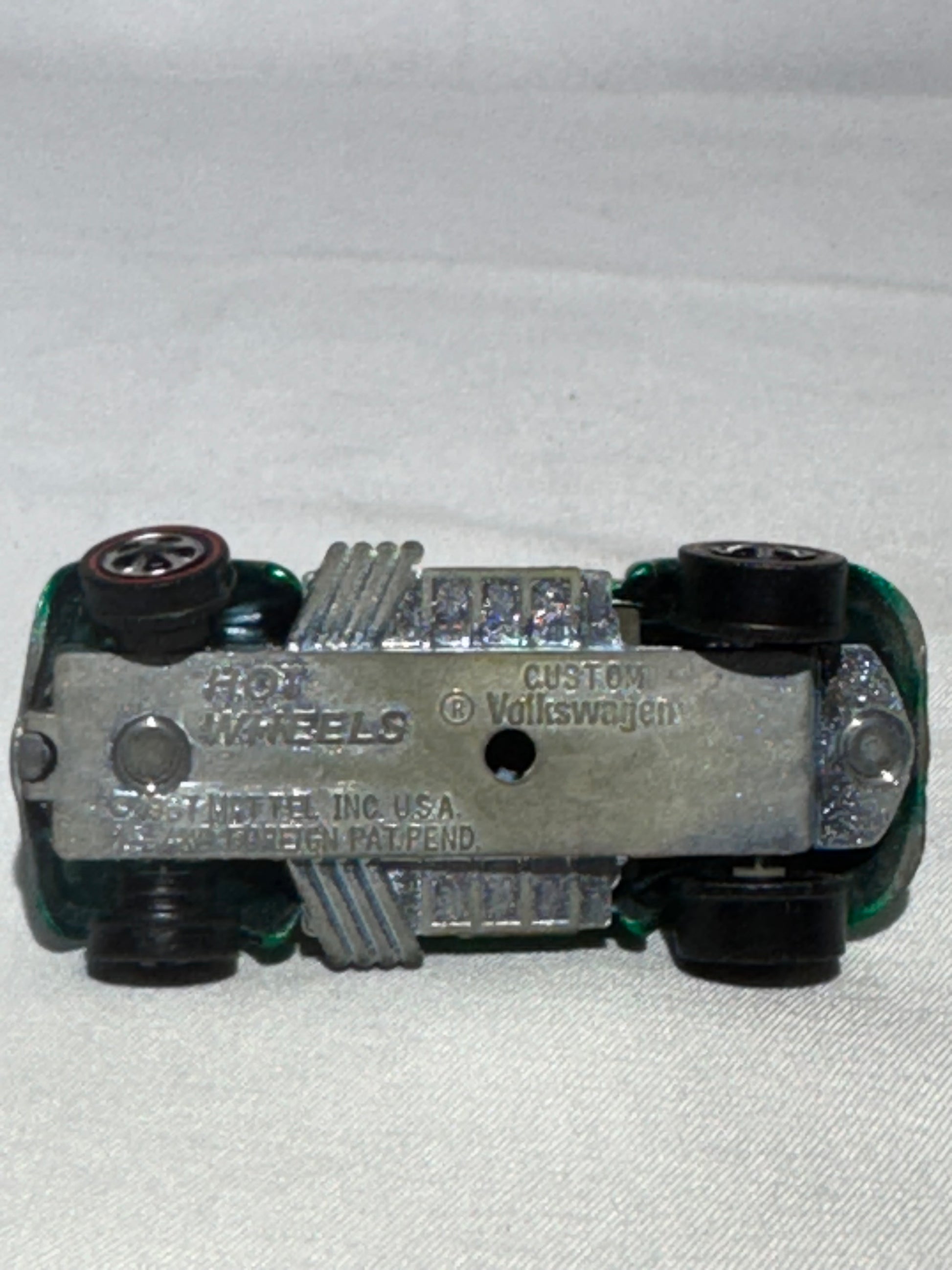 I’m offering a 1967 mold, 1968 release Redline Custom Volkswagen from the Sweet 16 series. This classic piece features a visible V8 engine in the front and comes in Spectraflame metallic green with a black interior. It was produced by Mattel Inc., marked “USA and Foreign Patent Pending.”