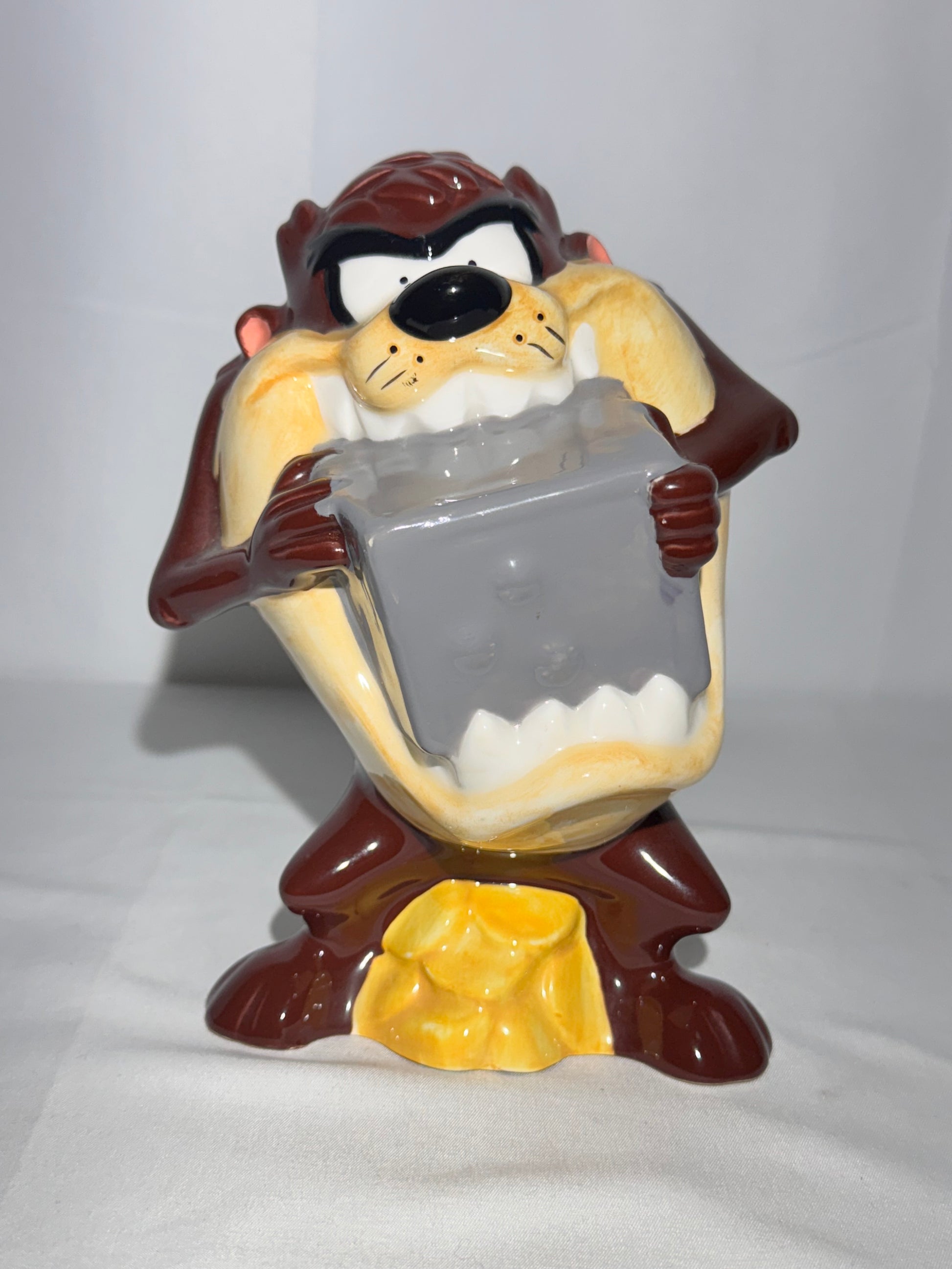 Add some classic Looney Tunes character to your collection with this vintage 1996 ceramic Taz piggy bank. Taz is shown chomping down on a safe while sitting on a big pile of money—fun, detailed, and full of that iconic Tasmanian Devil attitude!