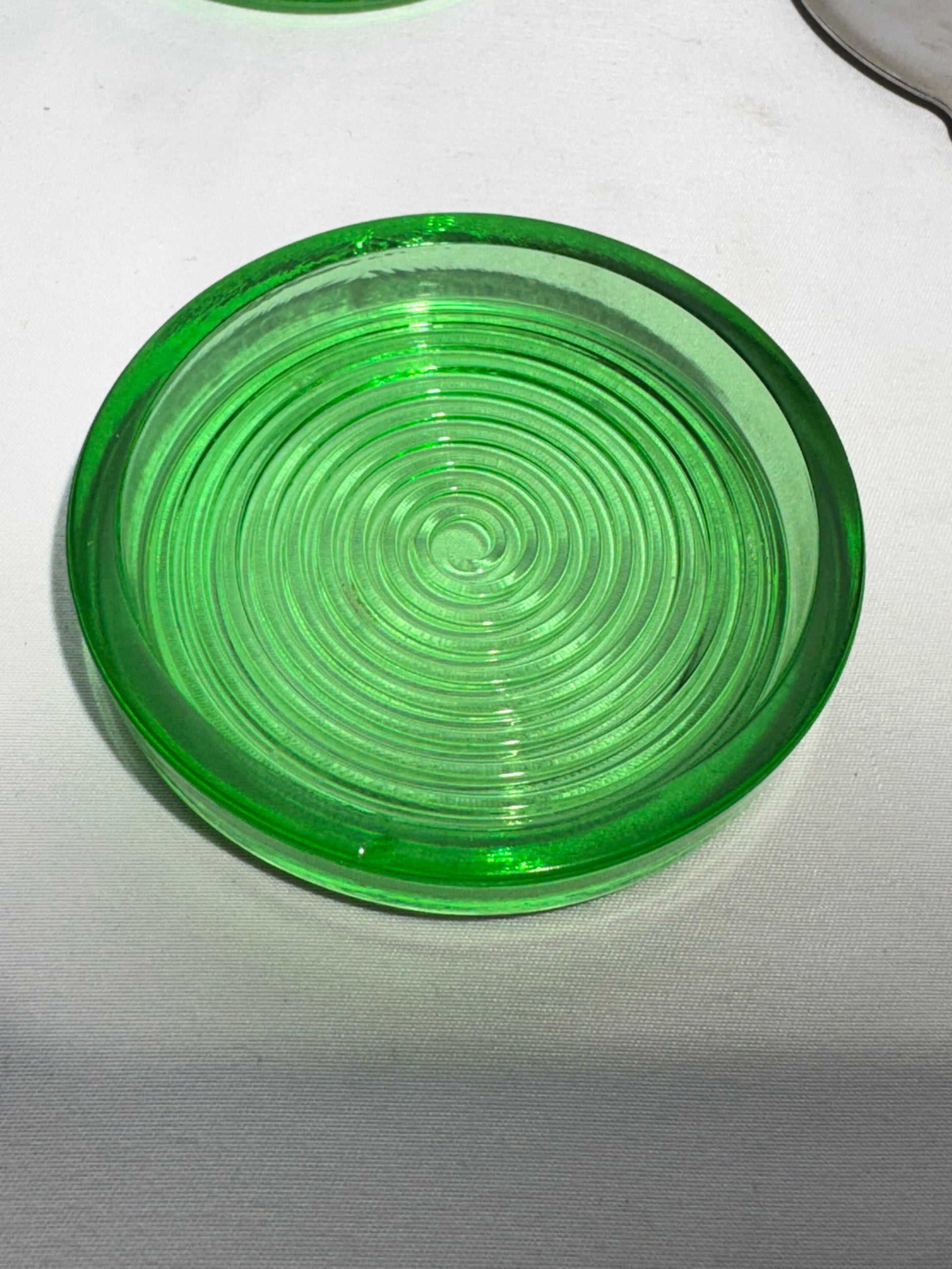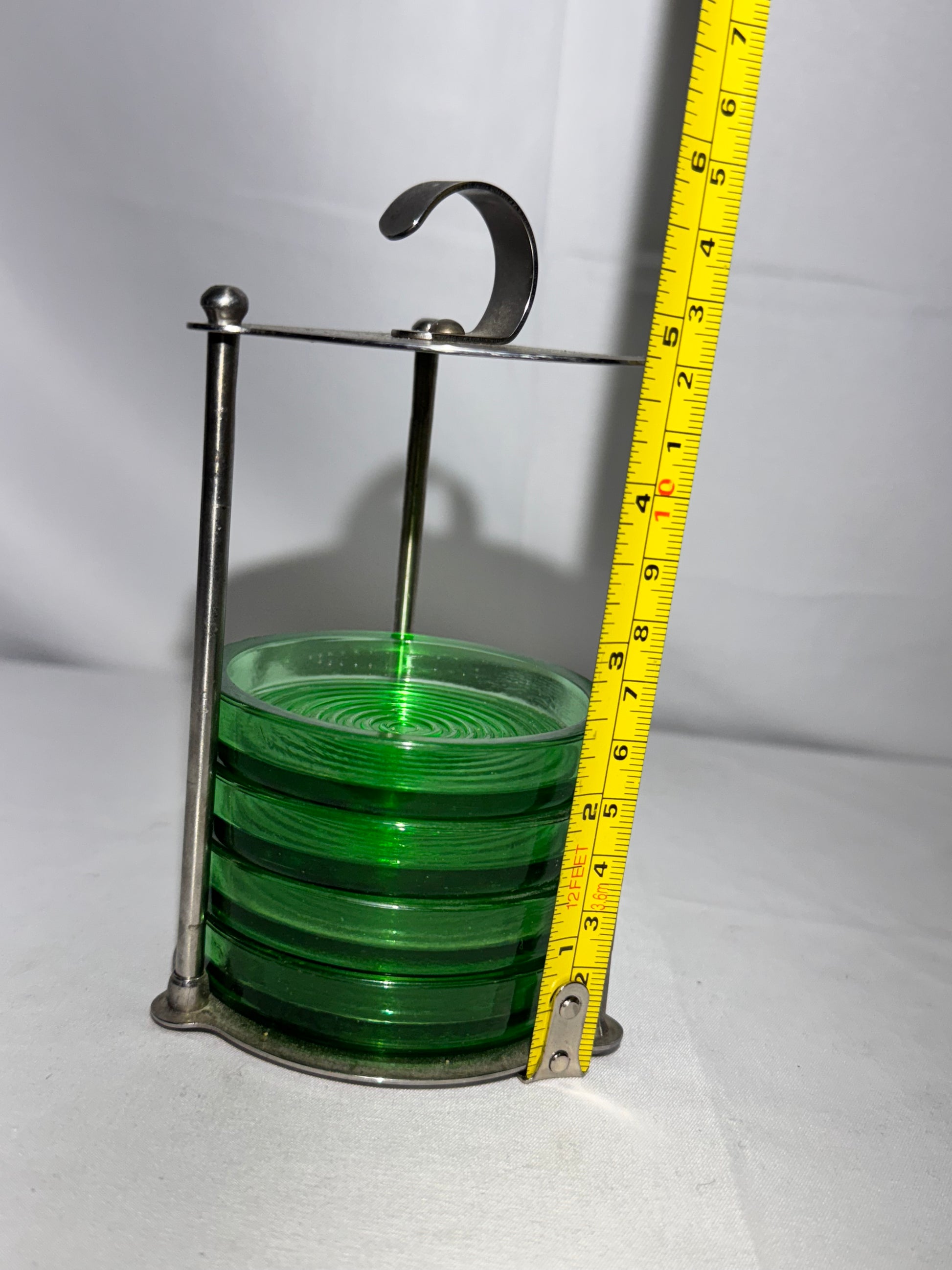 4 coasters with metal stand - Green glass- portable - one coaster has minor chip - noted in picture