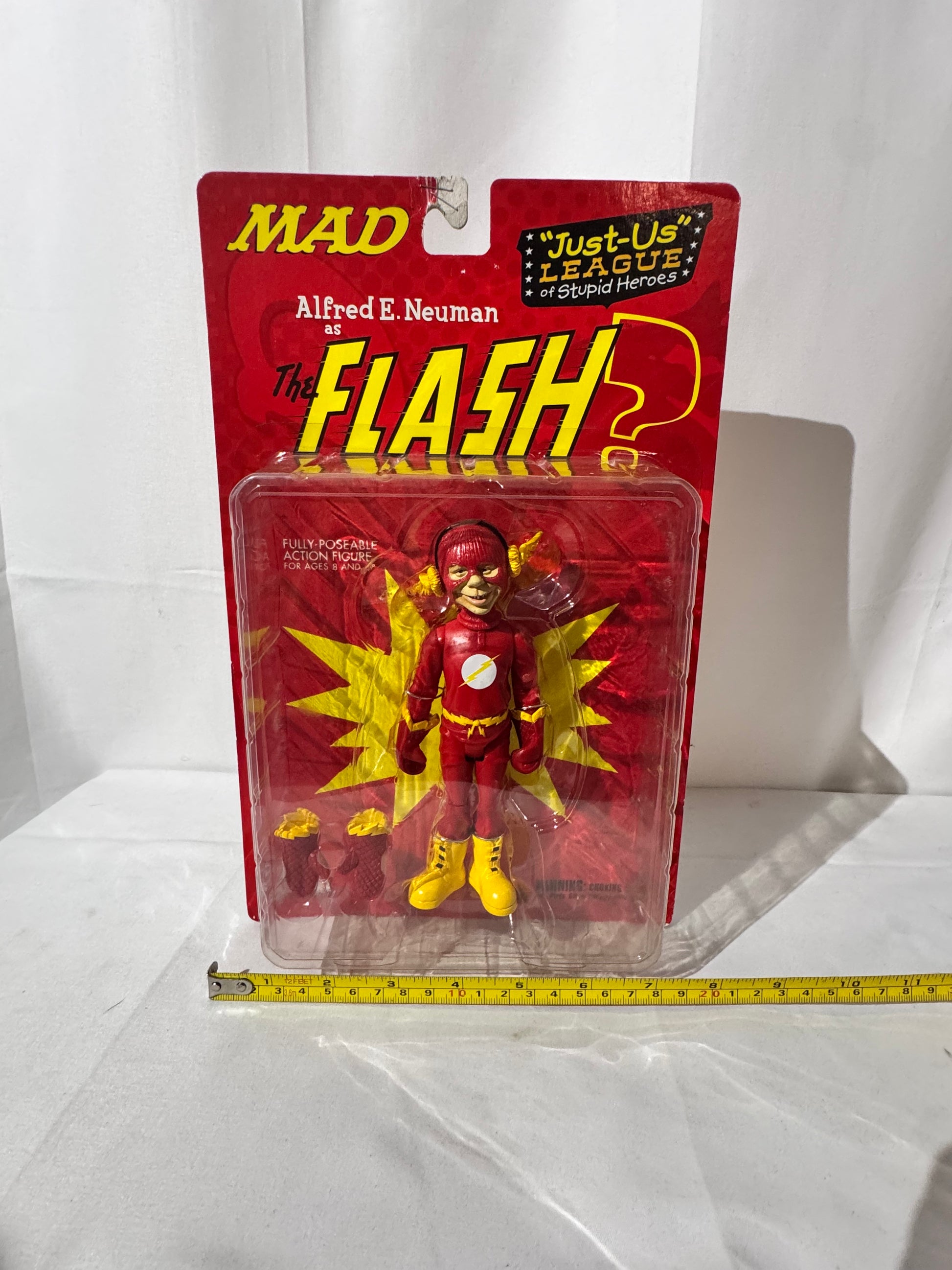 This listing features a fully poseable Alfred E. Neuman as The Flash action figure, part of the “Just Us League of Stupid Heroes” series from DC Collectibles. A fun mashup of MAD Magazine’s iconic mascot and DC’s Scarlet Speedster, this figure is a humorous and collectible addition to any collection.