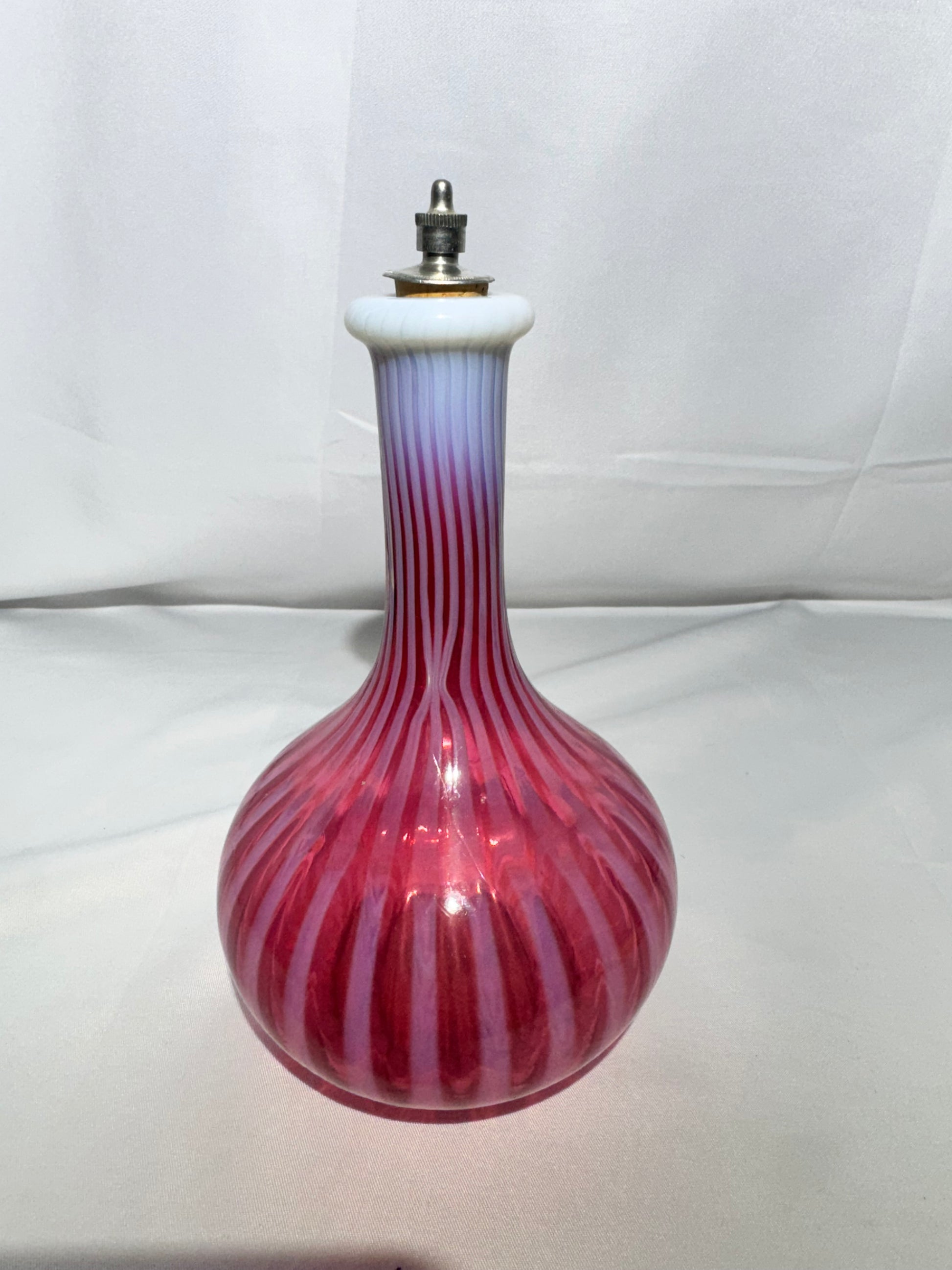 This beautiful antique barber bottle features a striking cranberry pink and white opalescent pattern with elegant vertical ribbing. Crafted from hand-blown art glass, this style was popular in the late 19th to early 20th century and is highly sought after by collectors.