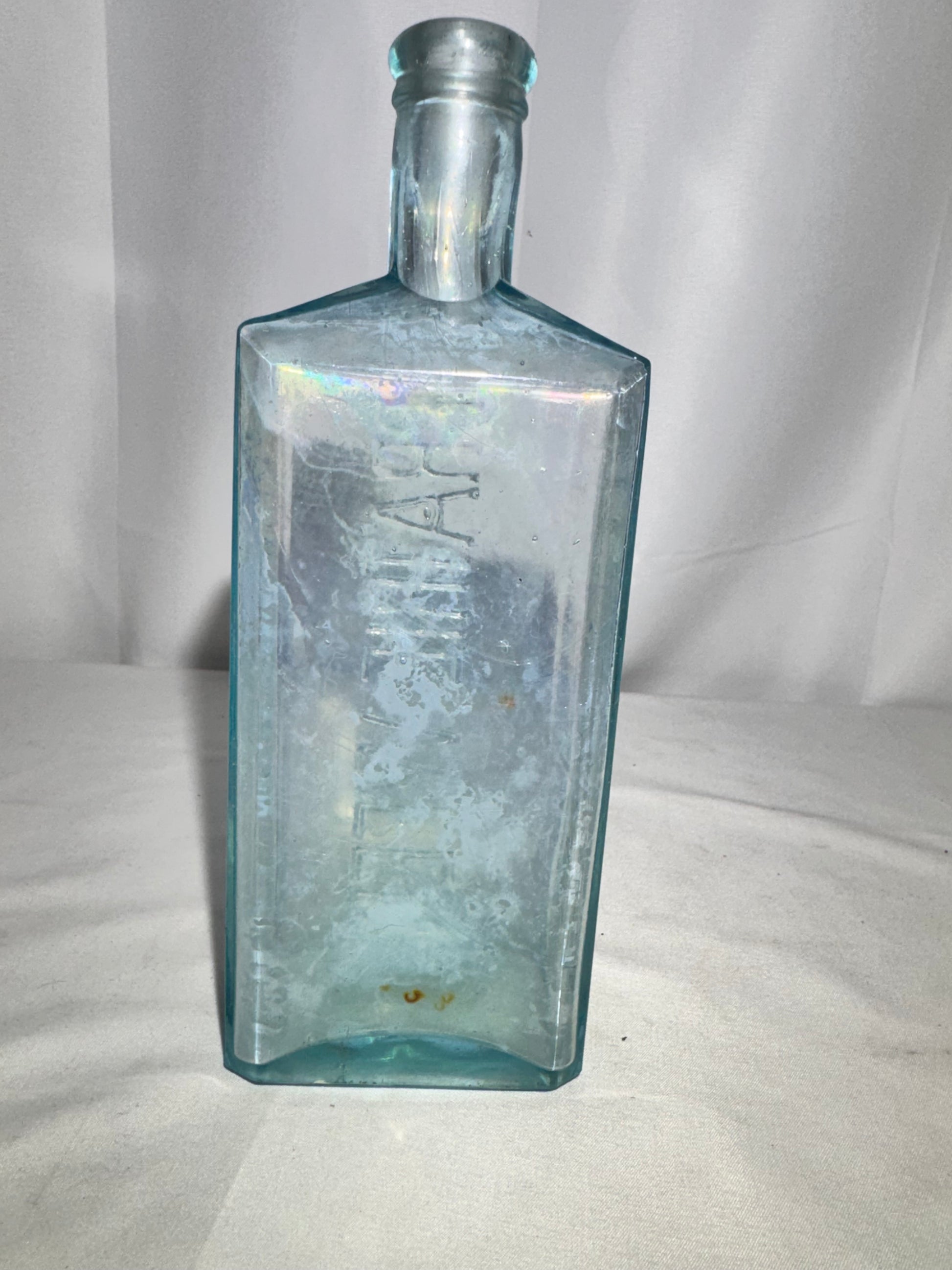 The piece showcases a classic sunk panel design, a style often seen in early “remedy” bottles, and has a beautiful light aqua tone with a subtle iridescent sheen that adds to its display appeal.
