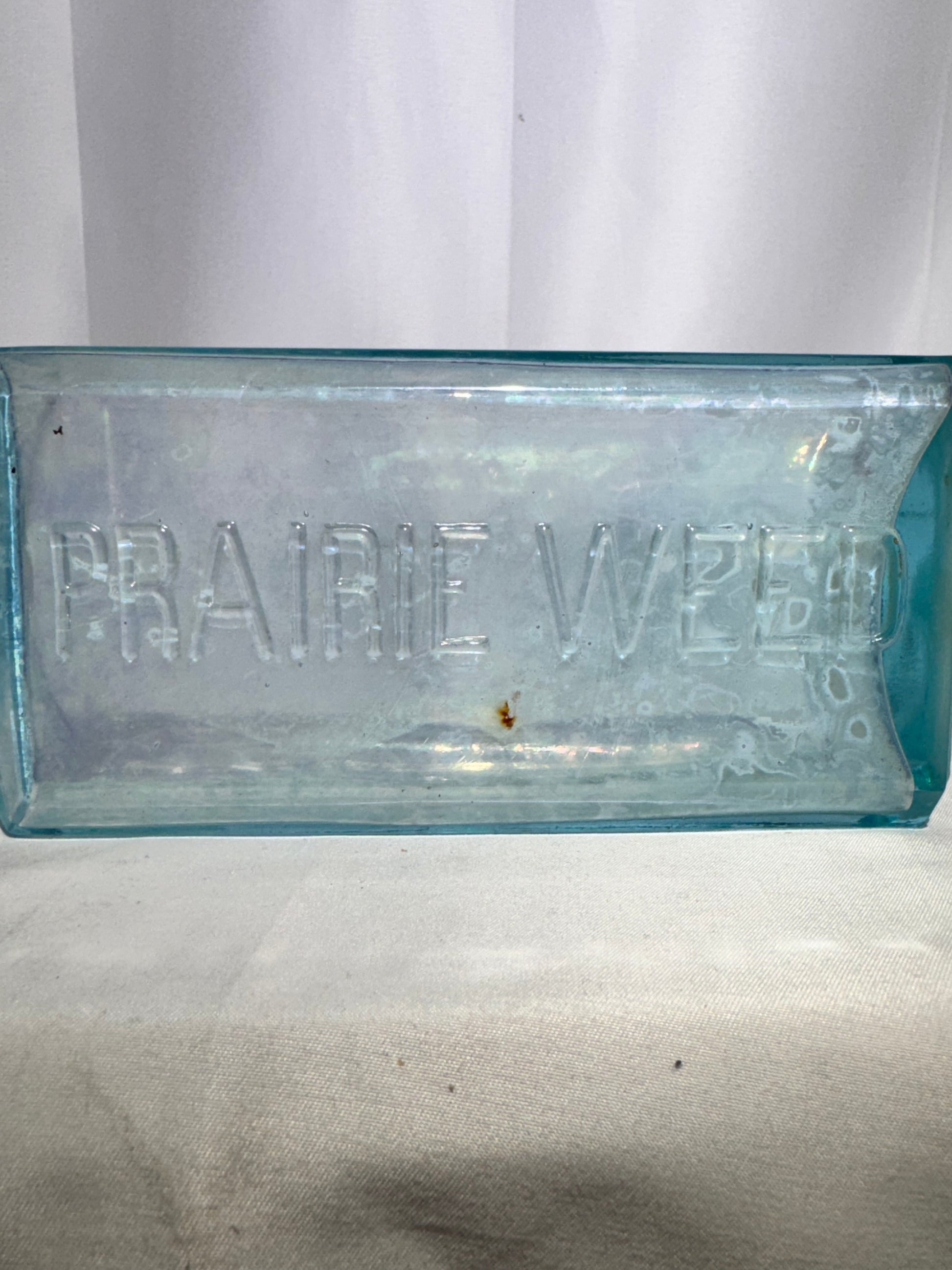 This is a unique antique aqua-colored glass medicine bottle featuring the embossed wording “PRAIRIE WEED” on one side. Bottles like this were commonly used for patent medicines during the late 19th and early 20th centuries.