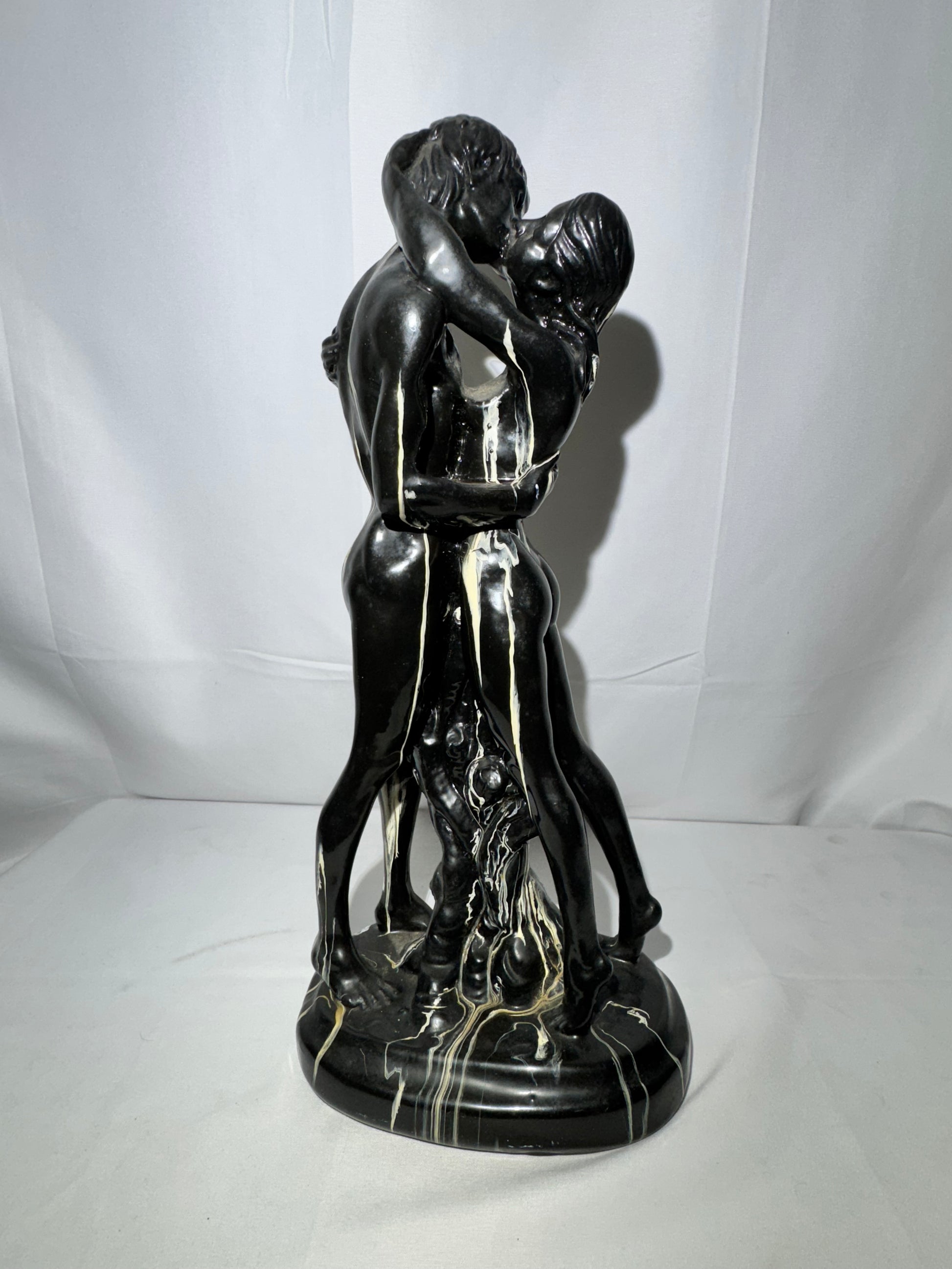 Art Deco Ceramic Sculpture “Lovers Embrace” / “The Kiss” – Black & White Marbled – 15.5” Tall