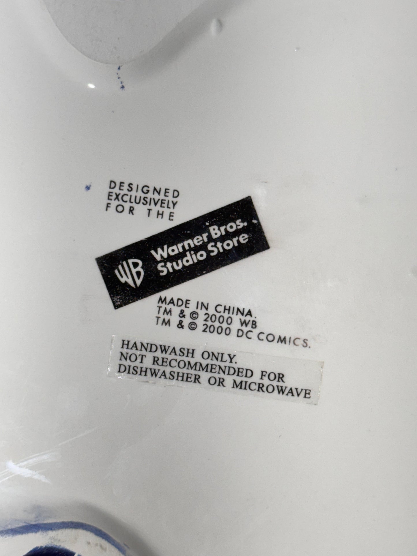 Add a heroic touch to your kitchen with this bold and nostalgic Batman cookie jar, officially licensed by Warner Brothers and dated 2000. This striking ceramic jar features the Caped Crusader in a classic fighting stance, with vibrant detailing in black, blue, and yellow. Batman’s iconic chest emblem and intense expression make this a standout piece for any DC Comics collector or superhero fan.