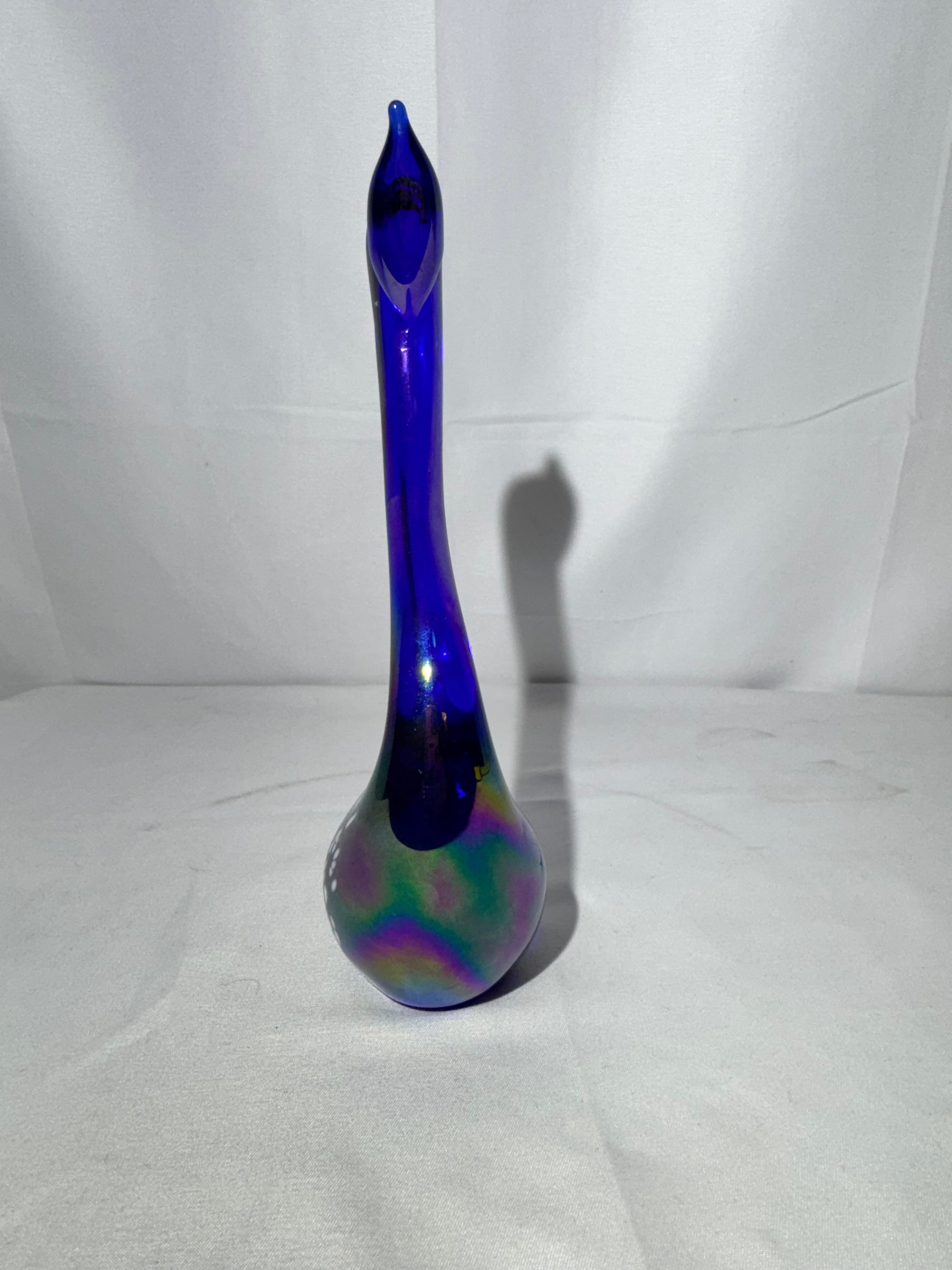 Add a touch of vintage charm to your collection with this stunning blue iridescent carnival glass swan. Measuring approximately 7½ inches long, this elegant piece features a dazzling rainbow sheen that shifts beautifully in the light. The swan’s wings are hand-painted with delicate white spotted details, adding a lovely artistic touch.