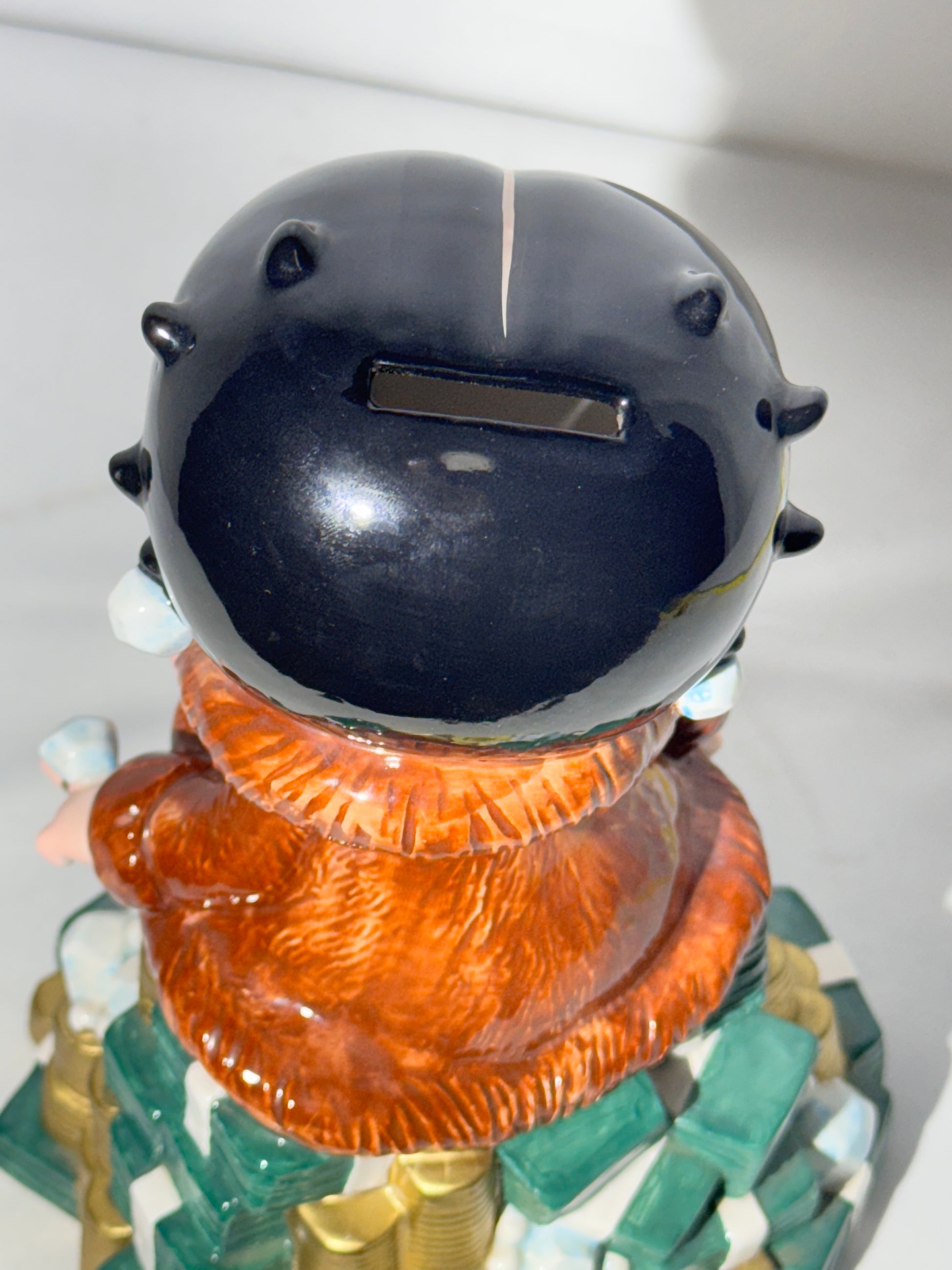 Add some vintage charm to your collection with this Betty Boop Piggy Bank from King Features Syndicate (2000). Betty is looking fabulous in her brown fur jacket, showing off her sparkling diamond rings as she sits confidently on a stack of money and jewelry — a true symbol of glamour and classic style!