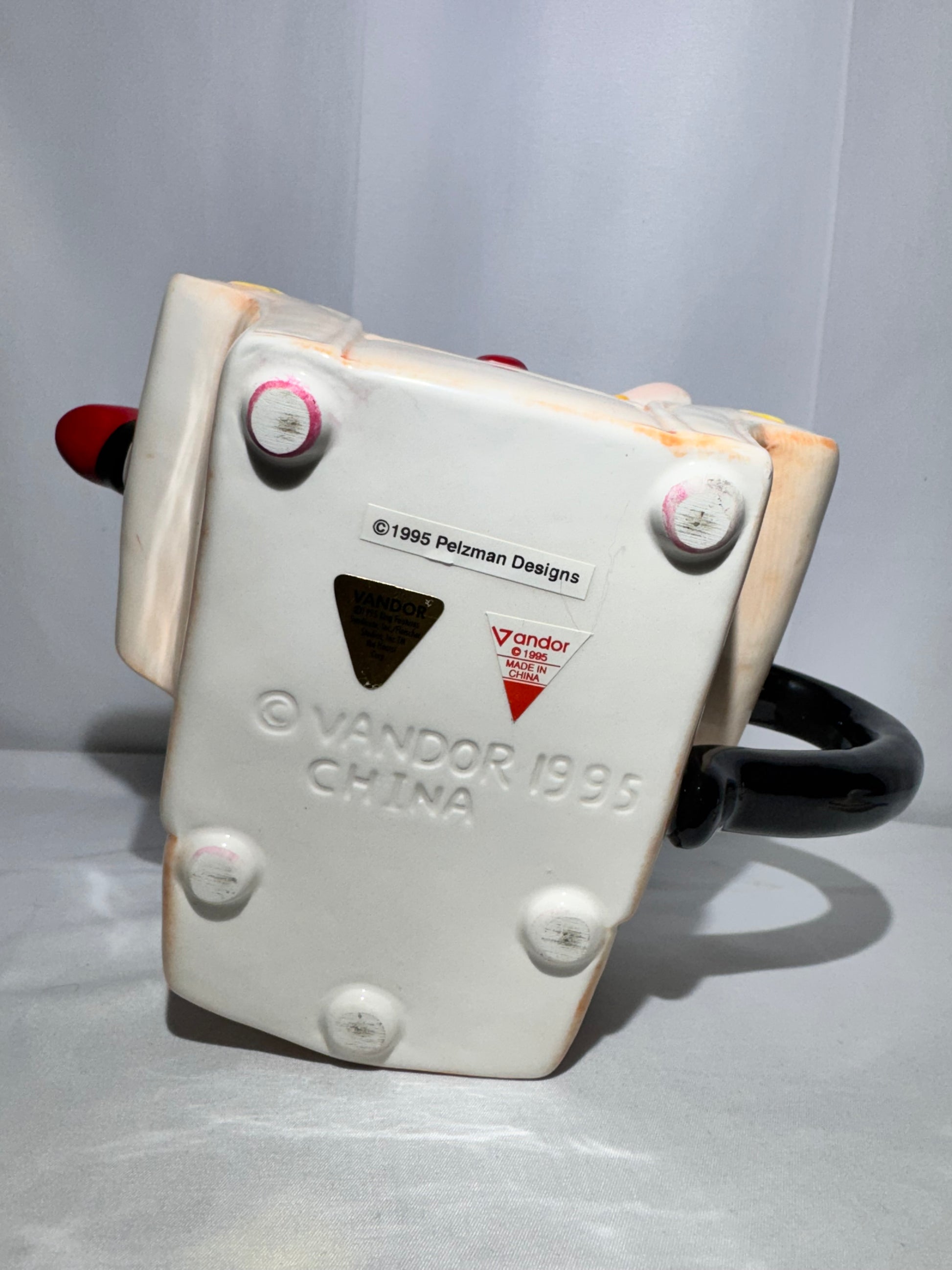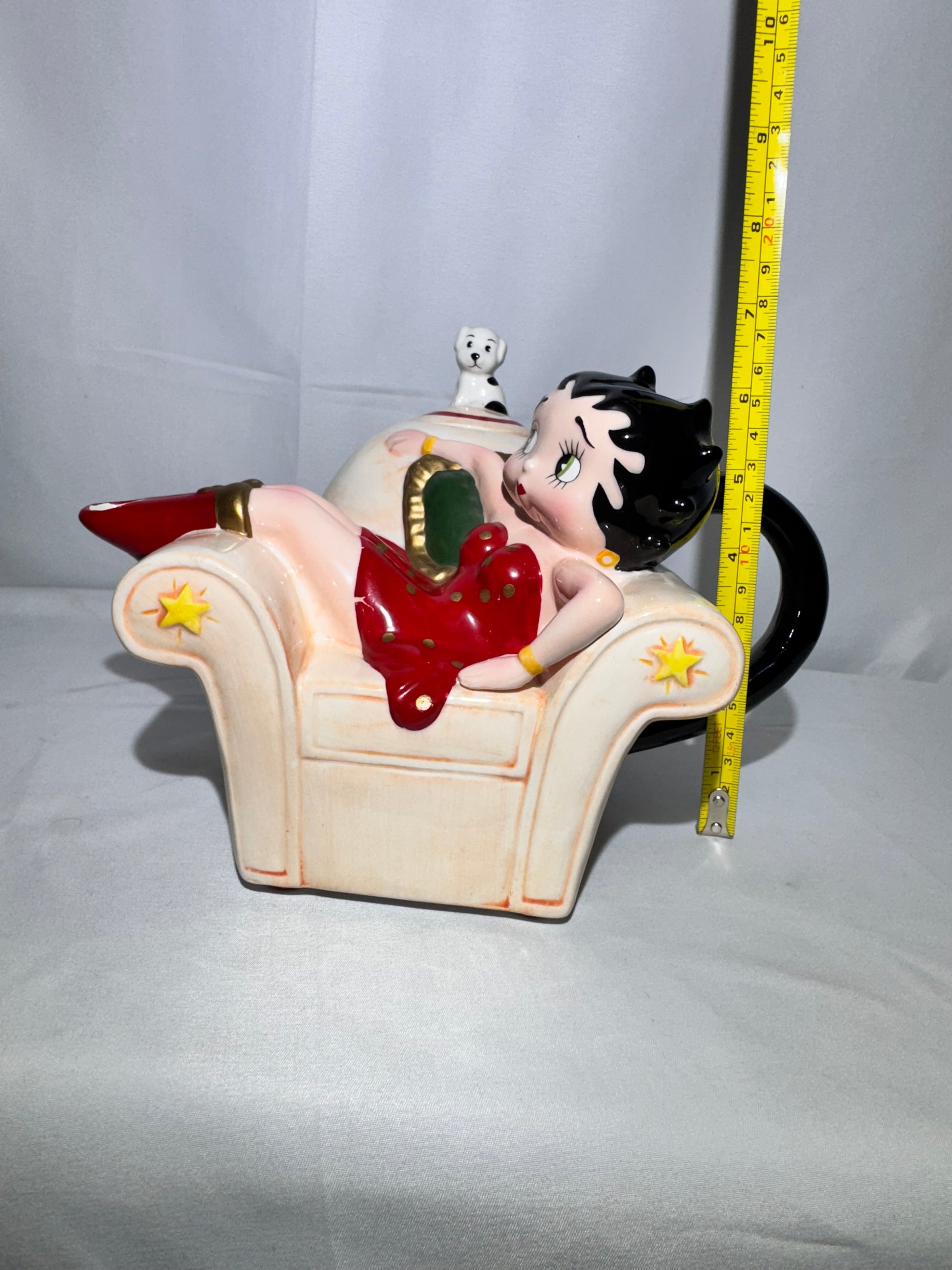 Add a touch of vintage charm to your collection with this Betty Boop teapot by Vandor (1995). This whimsical piece features Betty Boop lounging in a red sofa chair with her loyal pup Pudgy sitting on top, capturing the classic personality and playfulness of Betty herself.