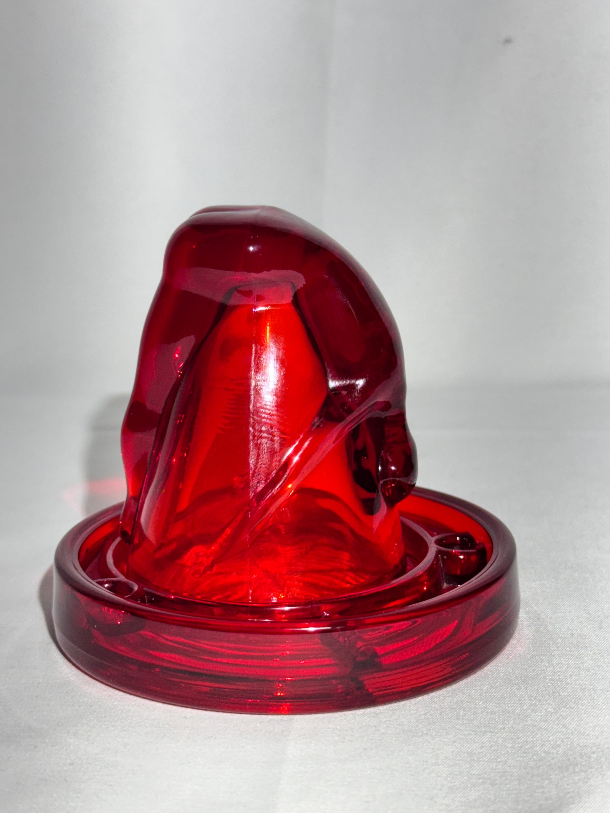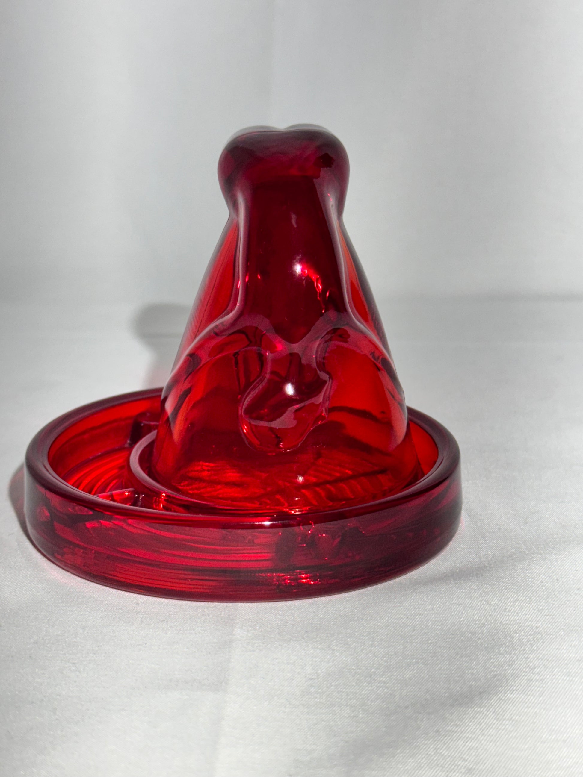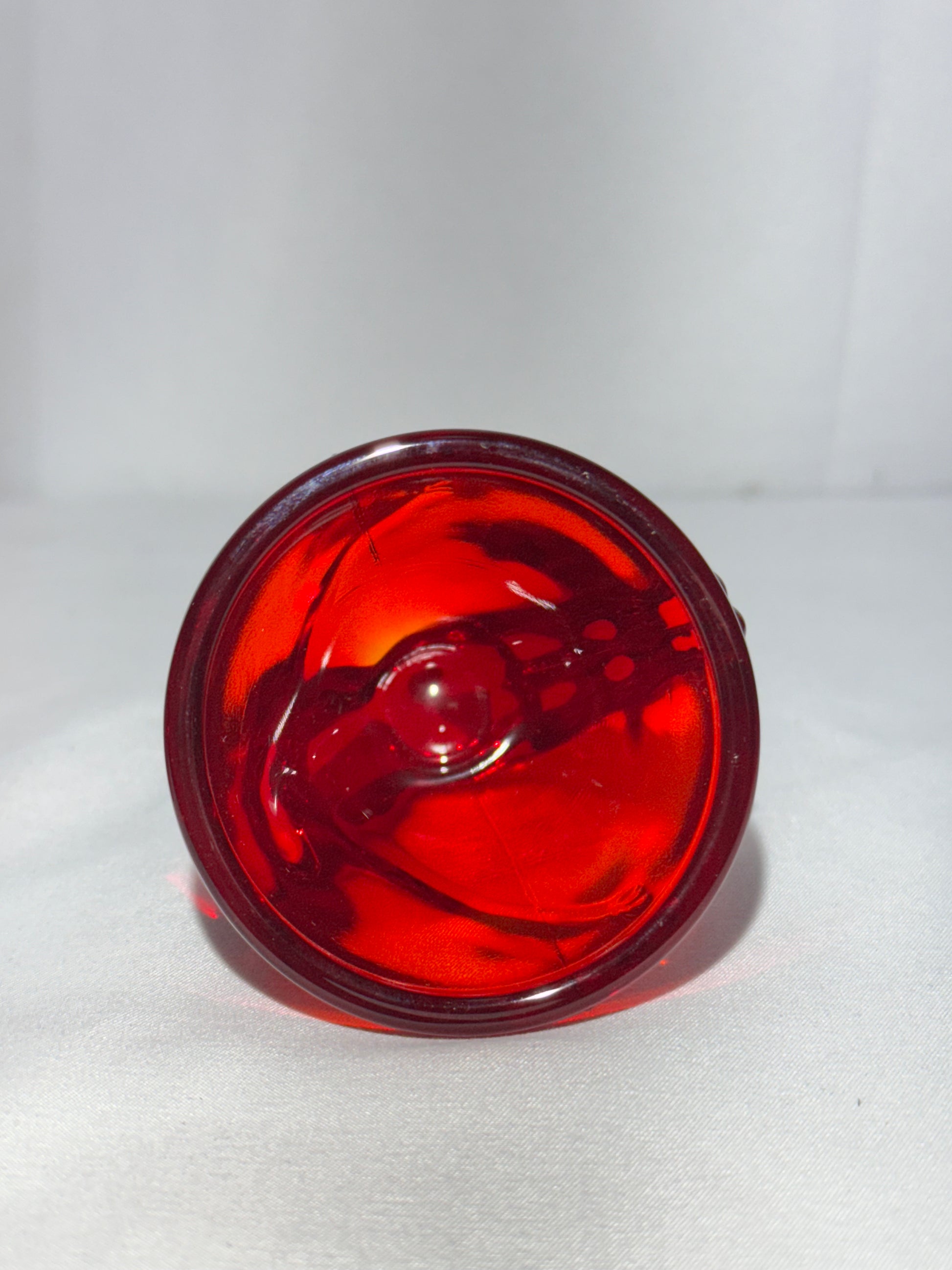 This vintage Art Deco Bottoms Up shot glass comes with its original matching coaster in stunning Amberina glass. Known for its rich red-to-orange tones, Amberina glass was produced with cadmium, giving it that distinctive fiery glow when lit. The coaster is stamped, adding authenticity and collectible value.