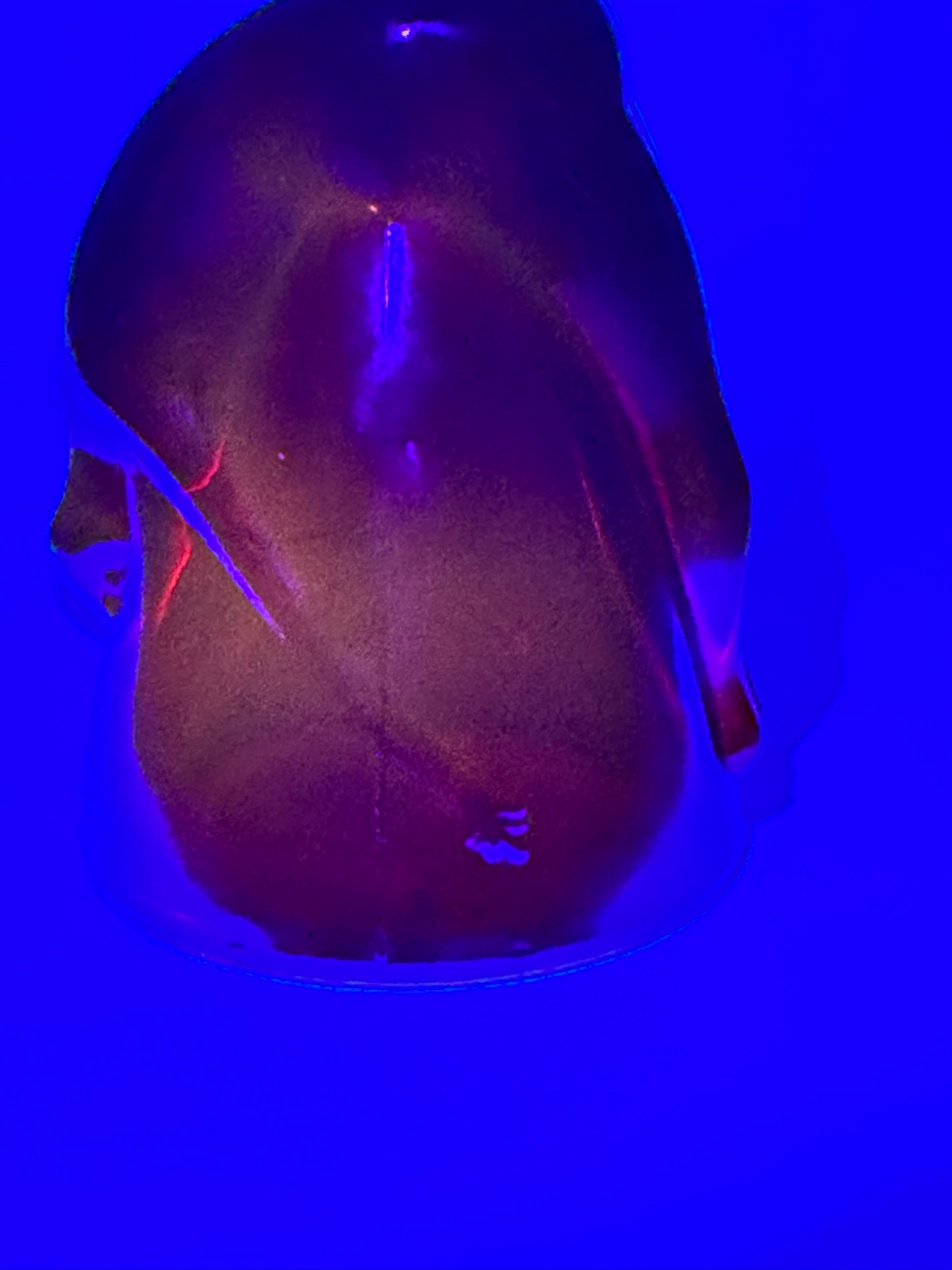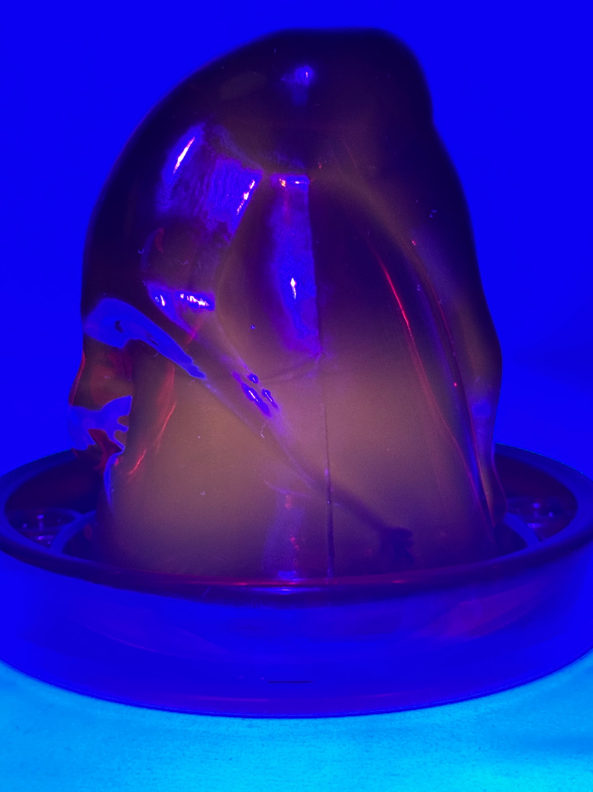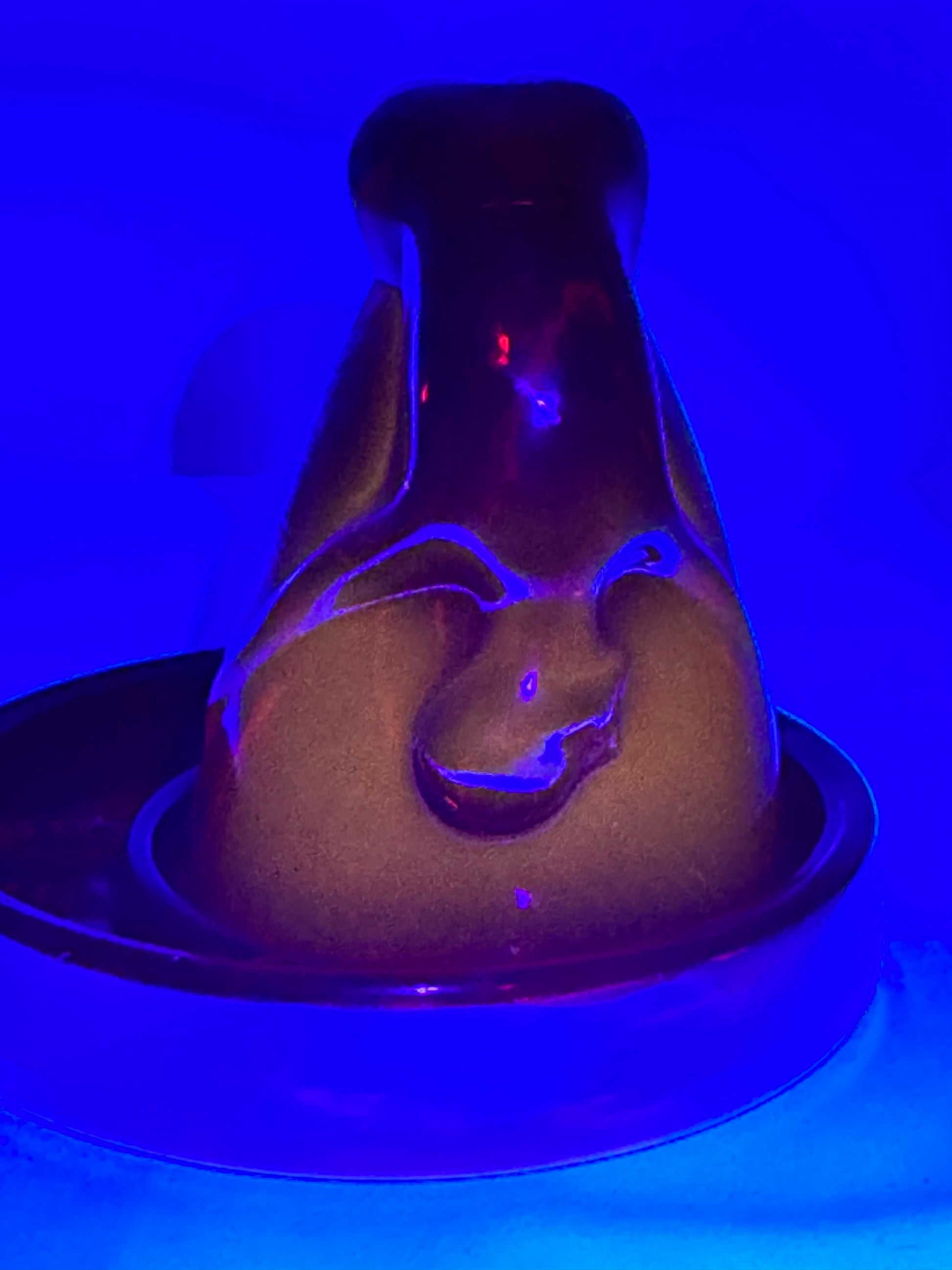 This vintage Art Deco Bottoms Up shot glass comes with its original matching coaster in stunning Amberina glass. Known for its rich red-to-orange tones, Amberina glass was produced with cadmium, giving it that distinctive fiery glow when lit. The coaster is stamped, adding authenticity and collectible value.