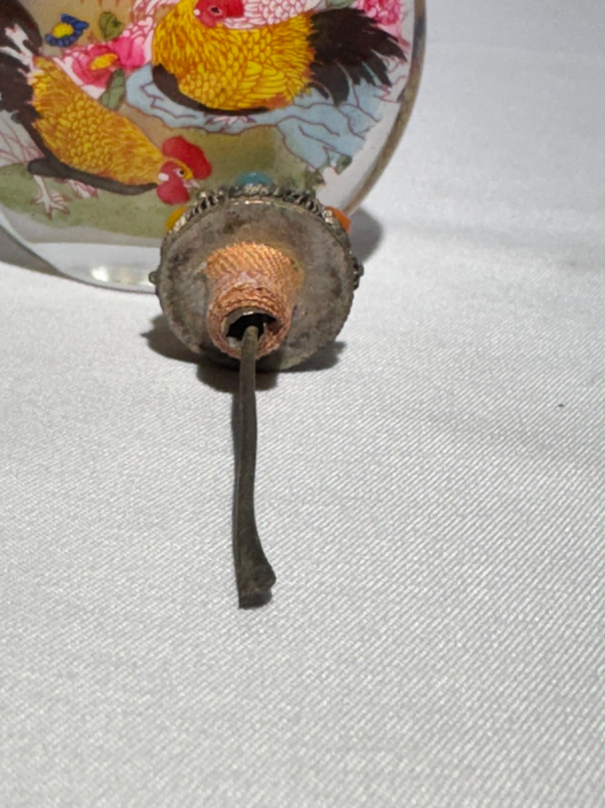 This beautiful Chinese reverse hand painted glass snuff bottle features intricate artwork on both sides. The oval-shaped bottle showcases detailed rooster scenes. The artistry is finely executed, capturing the traditional symbolism of prosperity and vigilance associated with roosters in Chinese culture.