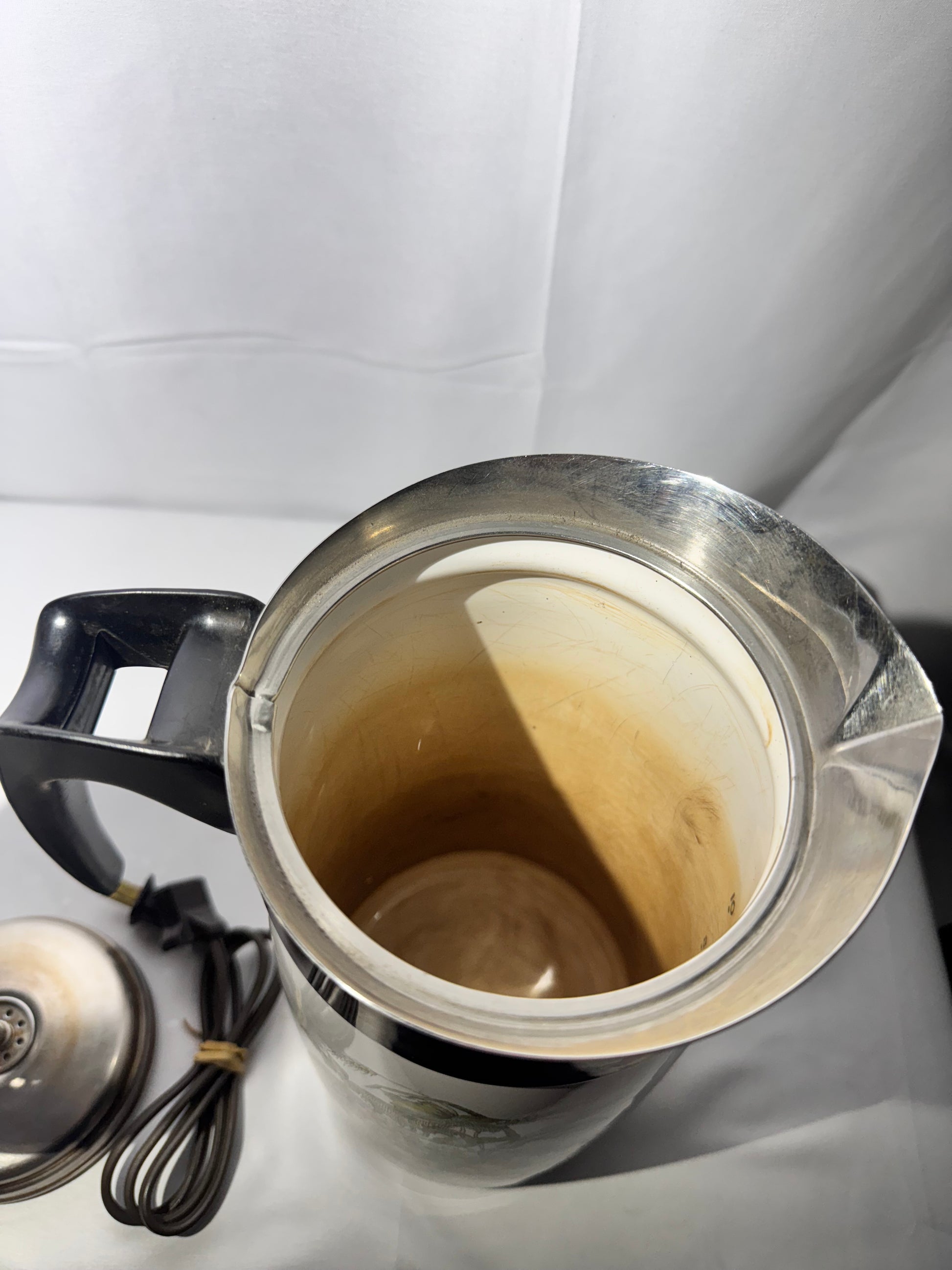The percolator shows minor scratches and wear consistent with age, all of which are clearly shown in the photos. The interior has coffee staining, indicating regular use, but this does not affect performance.