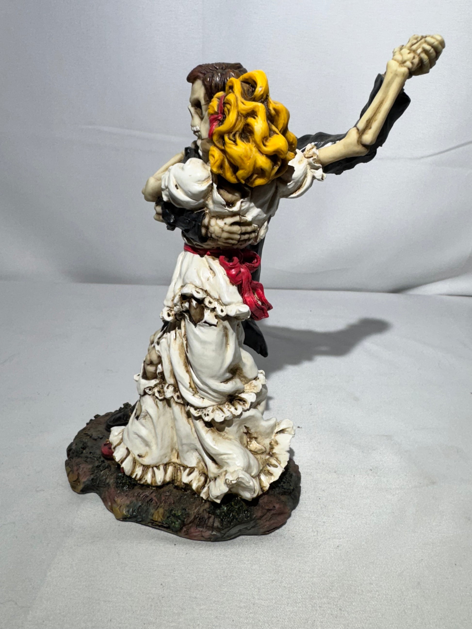This beautiful figurine features a skeleton bride and groom locked in a graceful dancing pose, often associated with Day of the Dead (Día de los Muertos) themes and romantic gothic décor. It’s a meaningful piece symbolizing everlasting love and partnership beyond time.