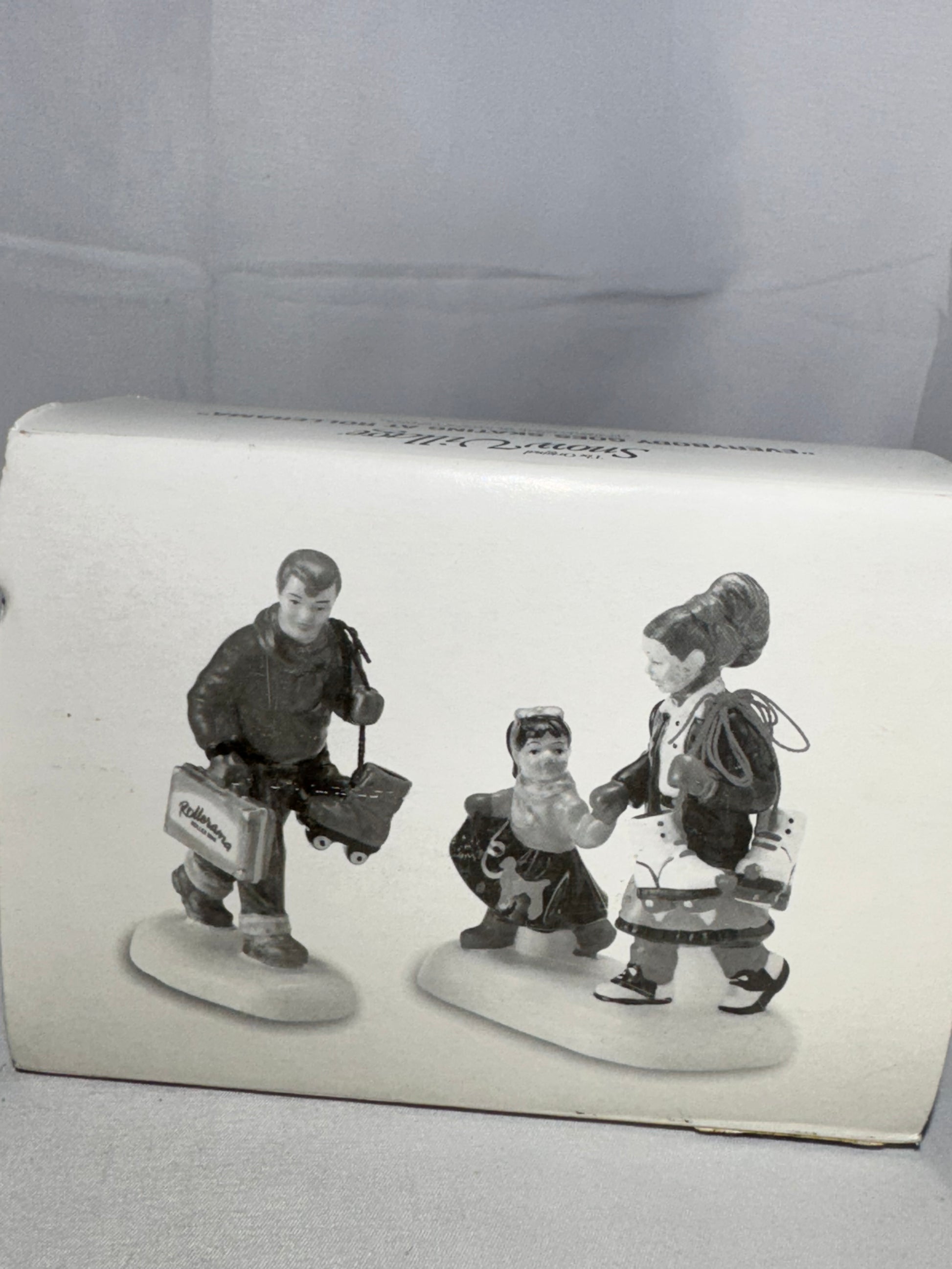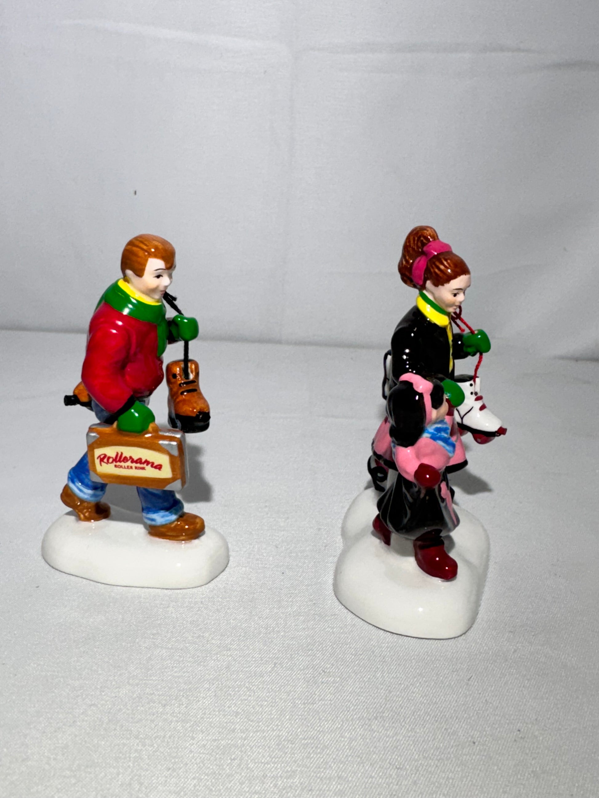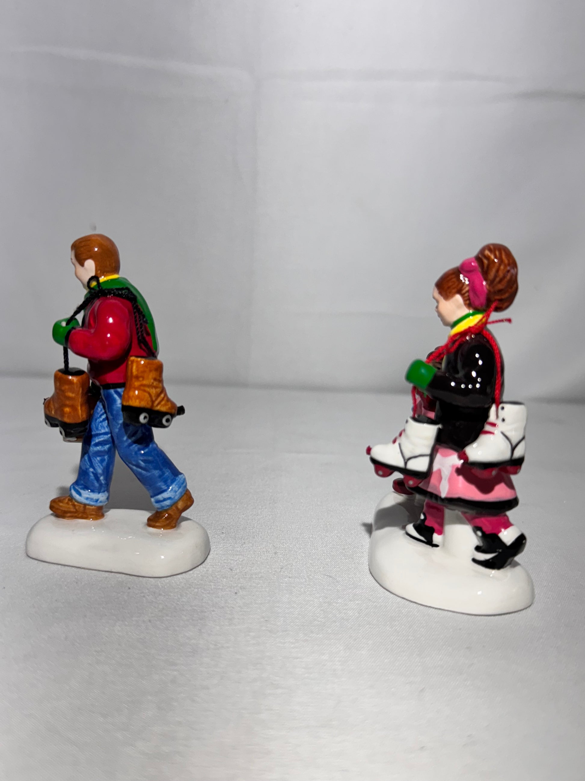 One figurine features a mom and daughter dressed in retro poodle skirts, ready for a day at the rink. The second depicts a gentleman carrying his skates over his shoulder and holding a roller briefcase. Both pieces are beautifully detailed and part of the Original Snow Village collection.