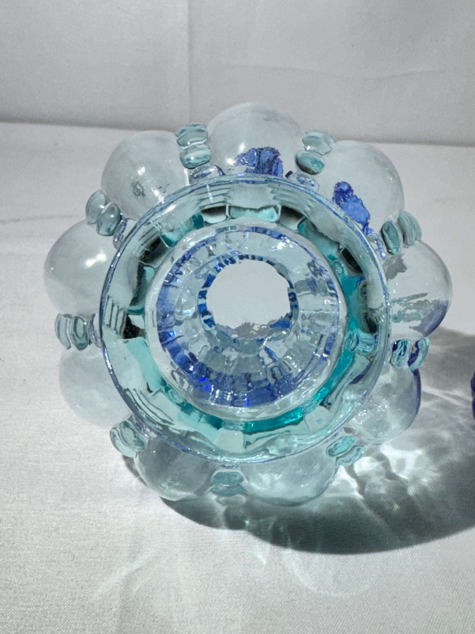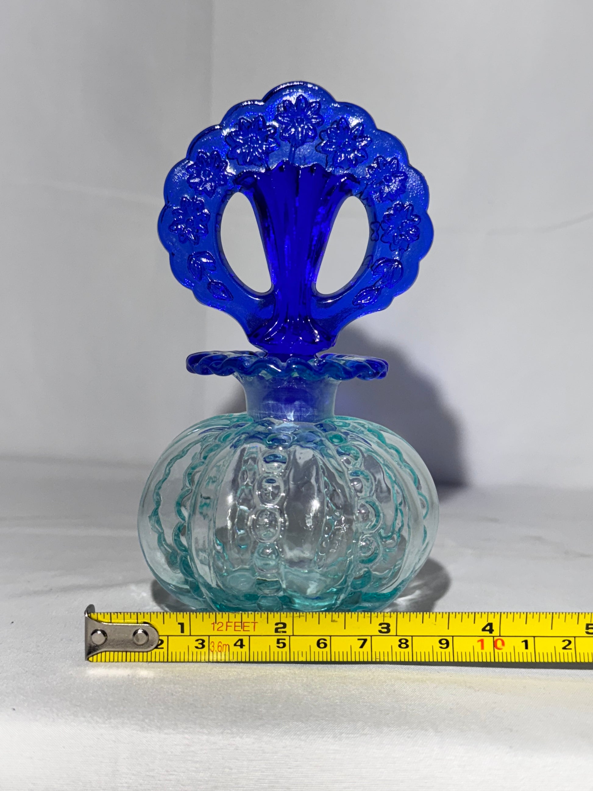 Add a touch of vintage elegance to your vanity or display cabinet with this stunning Fenton Art Glass perfume bottle. Featuring a clear aqua ribbed base and a striking cobalt blue floral stopper, this piece beautifully showcases Fenton’s signature craftsmanship and attention to detail.