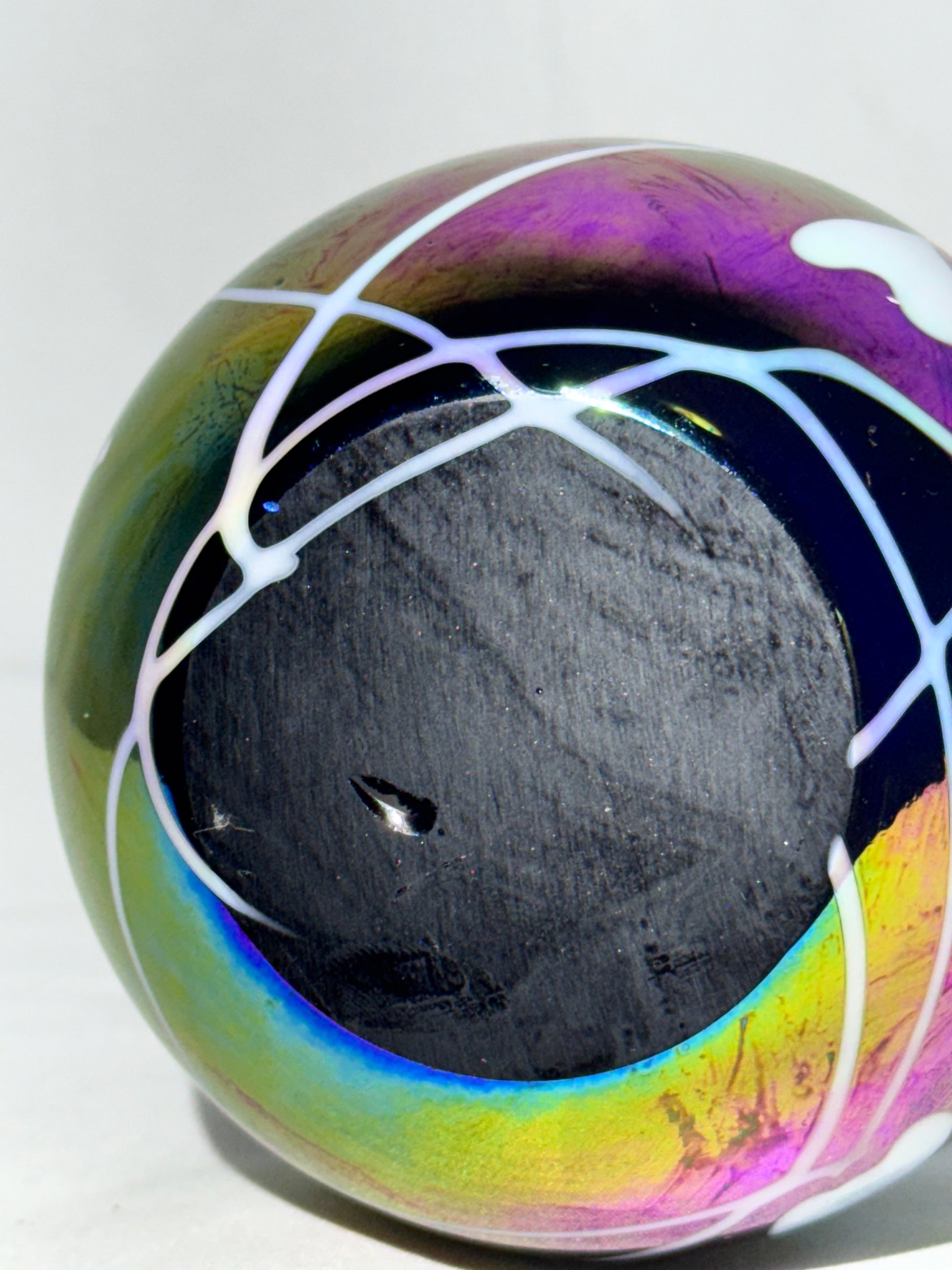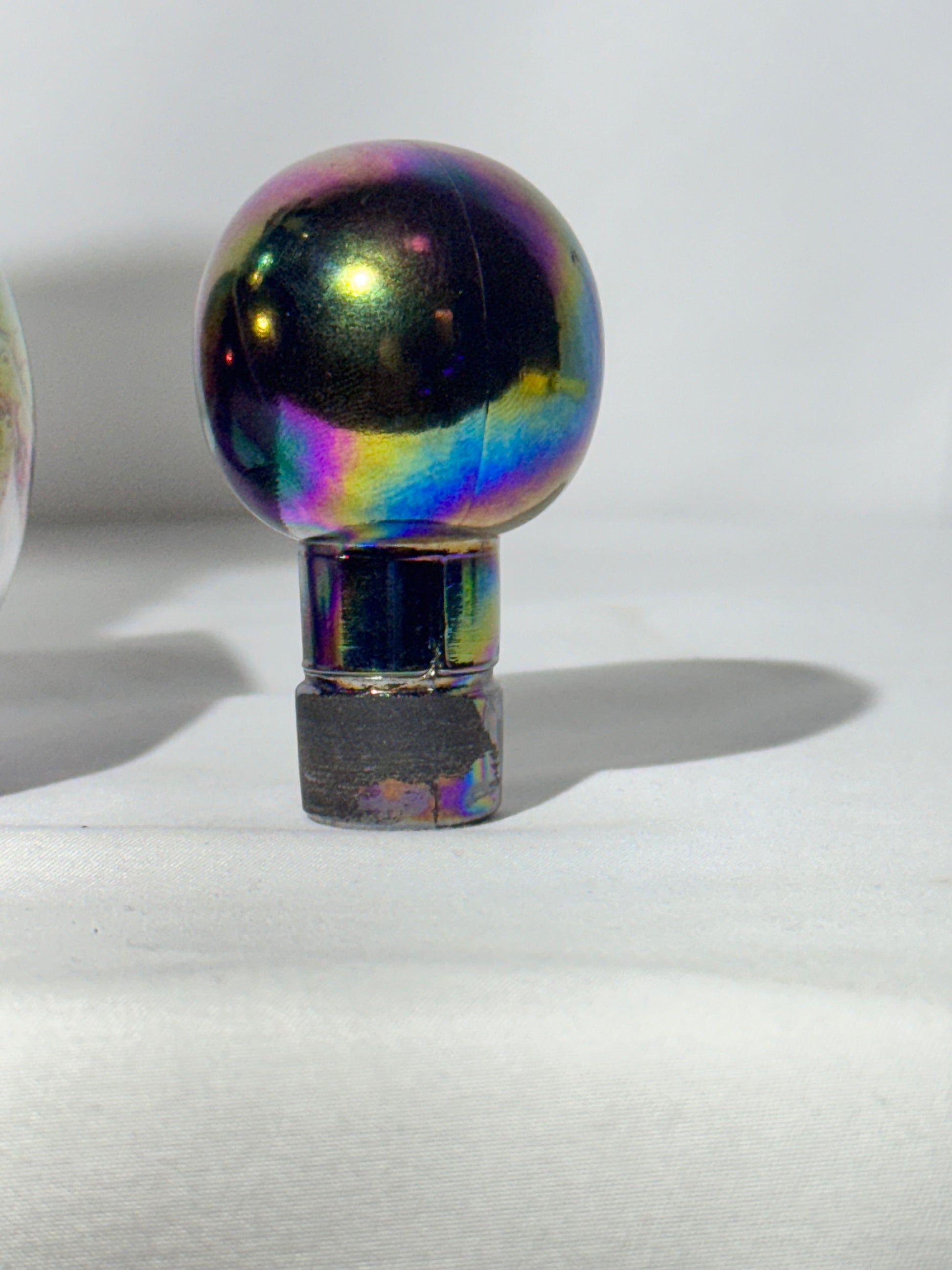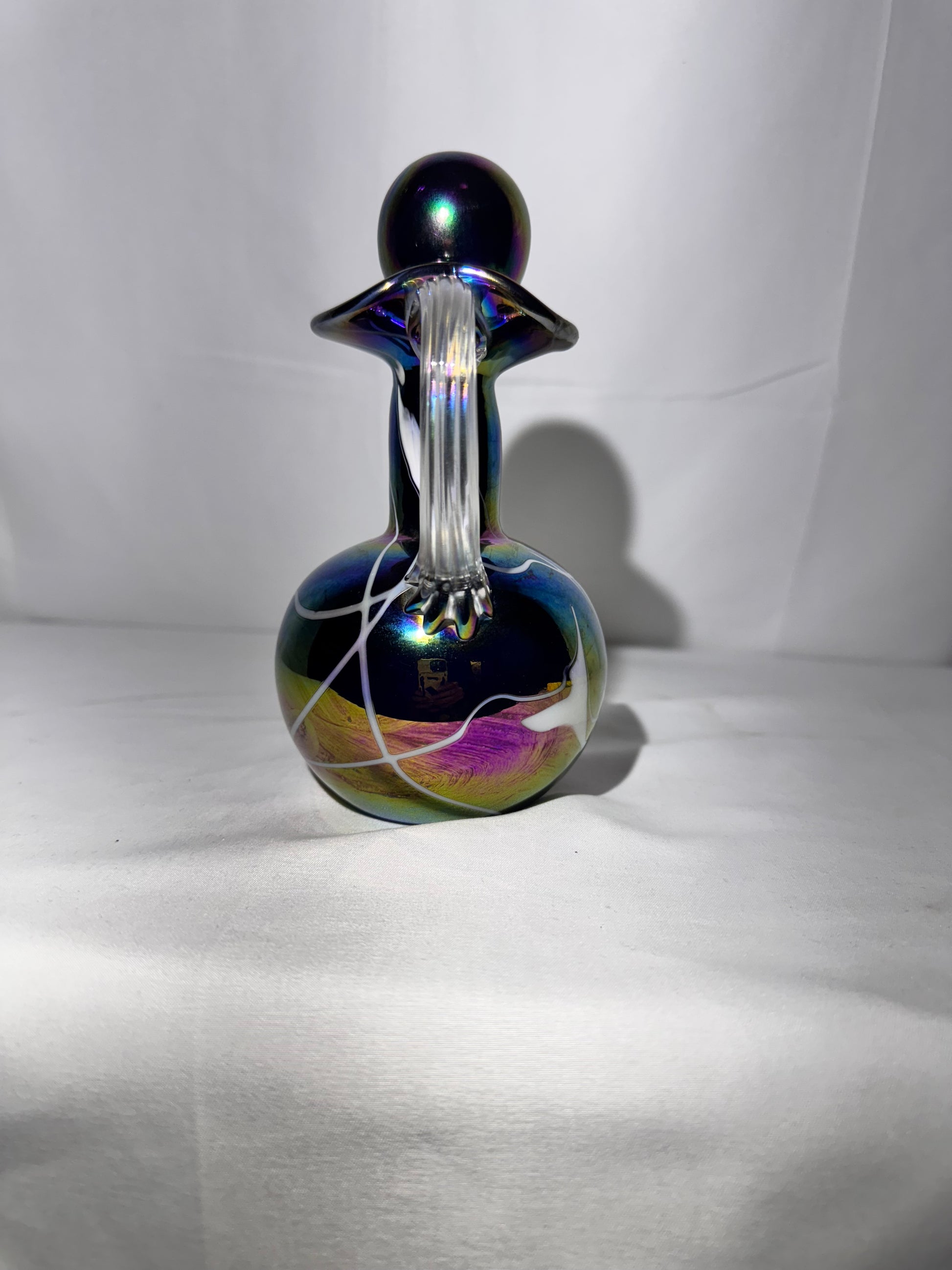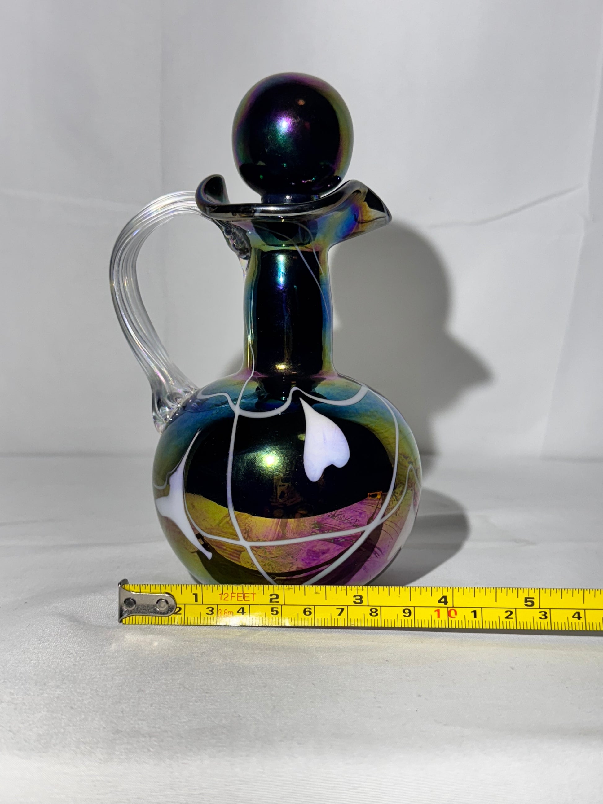 - Features: Iridescent carnival finish, clear handle, original stopper