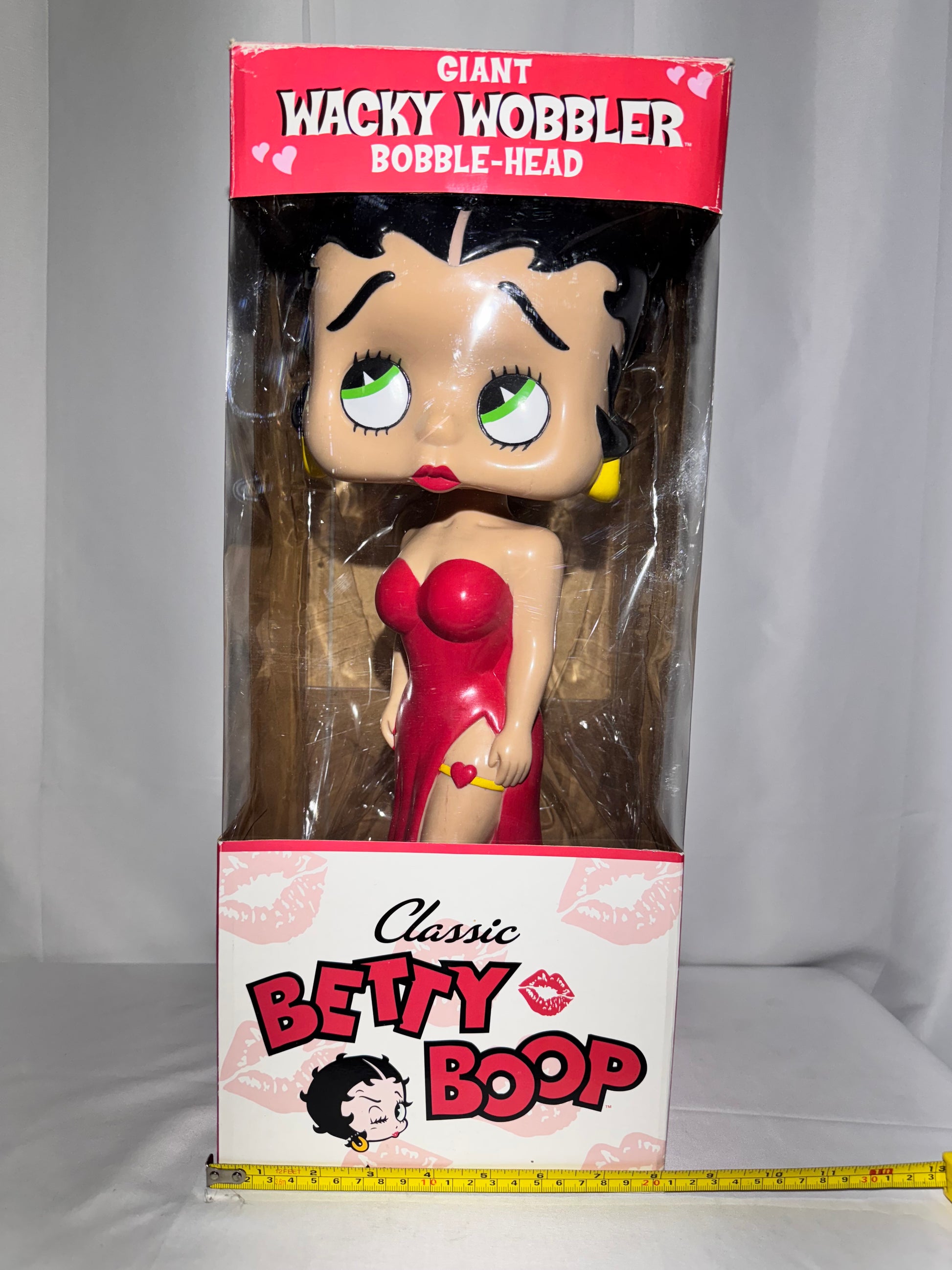 Add some vintage charm to your collection with this giant Wacky Wobbler bobblehead featuring the iconic Betty Boop. Standing an impressive 18 inches tall, this oversized figure showcases Betty in her classic red gown with a bright white base, capturing her timeless style.