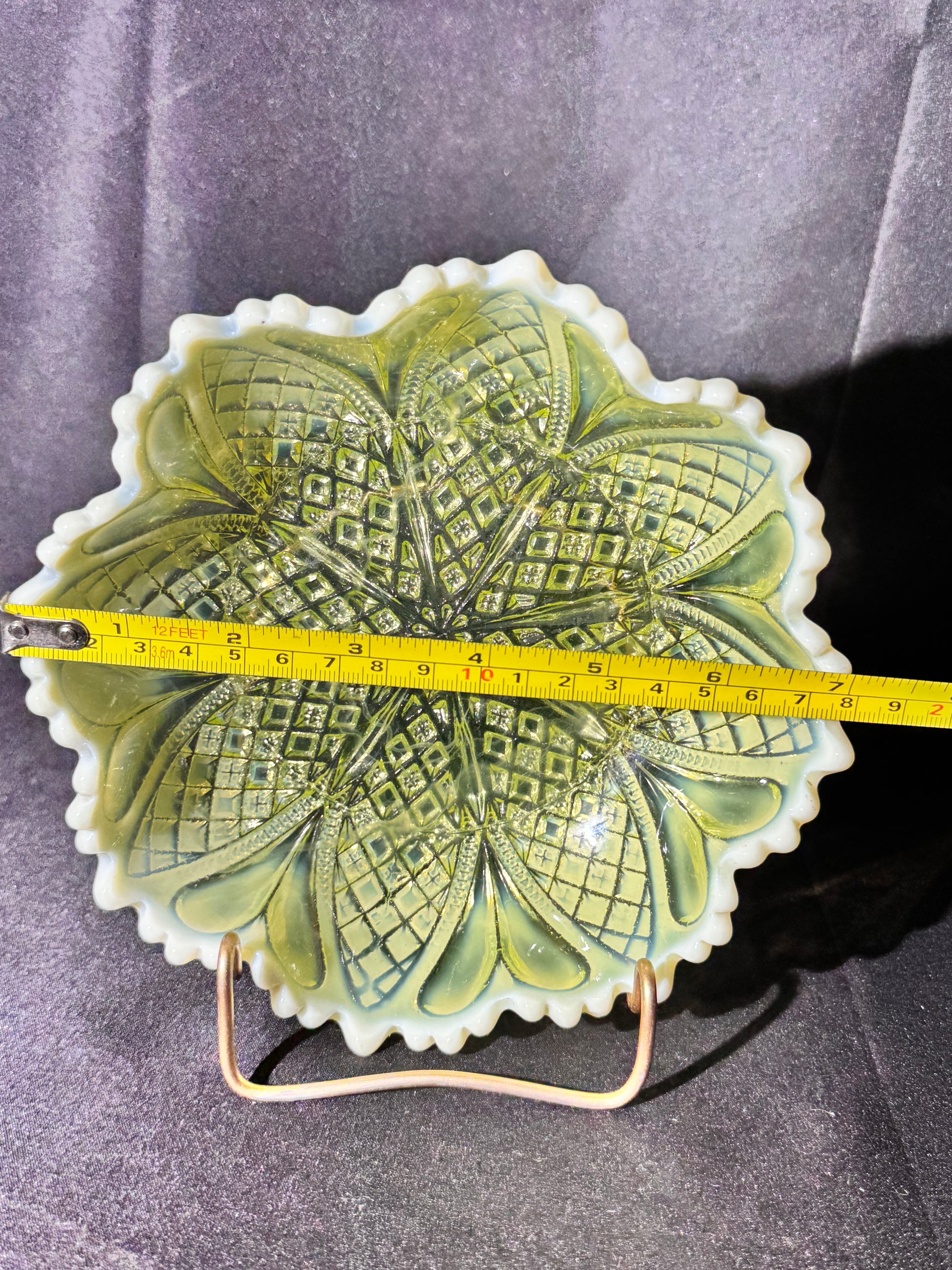 This George Davidson bowl, featuring the classic William & Mary pattern, is a rare collectible piece. Measuring approximately 7 inches in diameter, it is a charming candy dish or decorative bowl perfect for display or special use. Crafted in Uranium opalescent Pearline glass, it displays an iridescent opalescent glow under light — a true treasure for collectors of antique glassware.