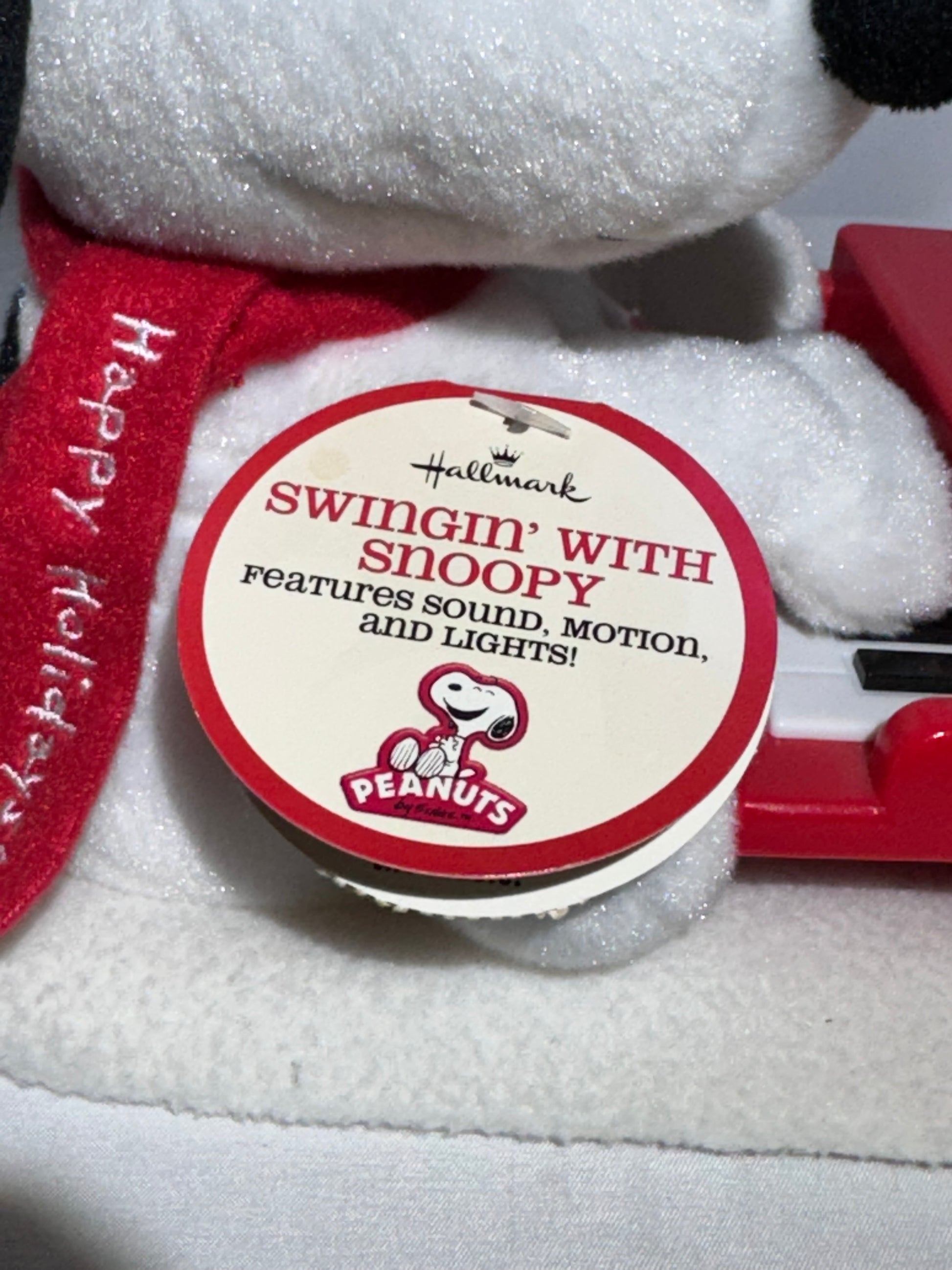 Add a touch of holiday charm with this delightful Hallmark Swinging with Snoopy feature piece. Measuring approximately 11” wide x 7” tall, this festive display lights up and plays music with the press of a button.