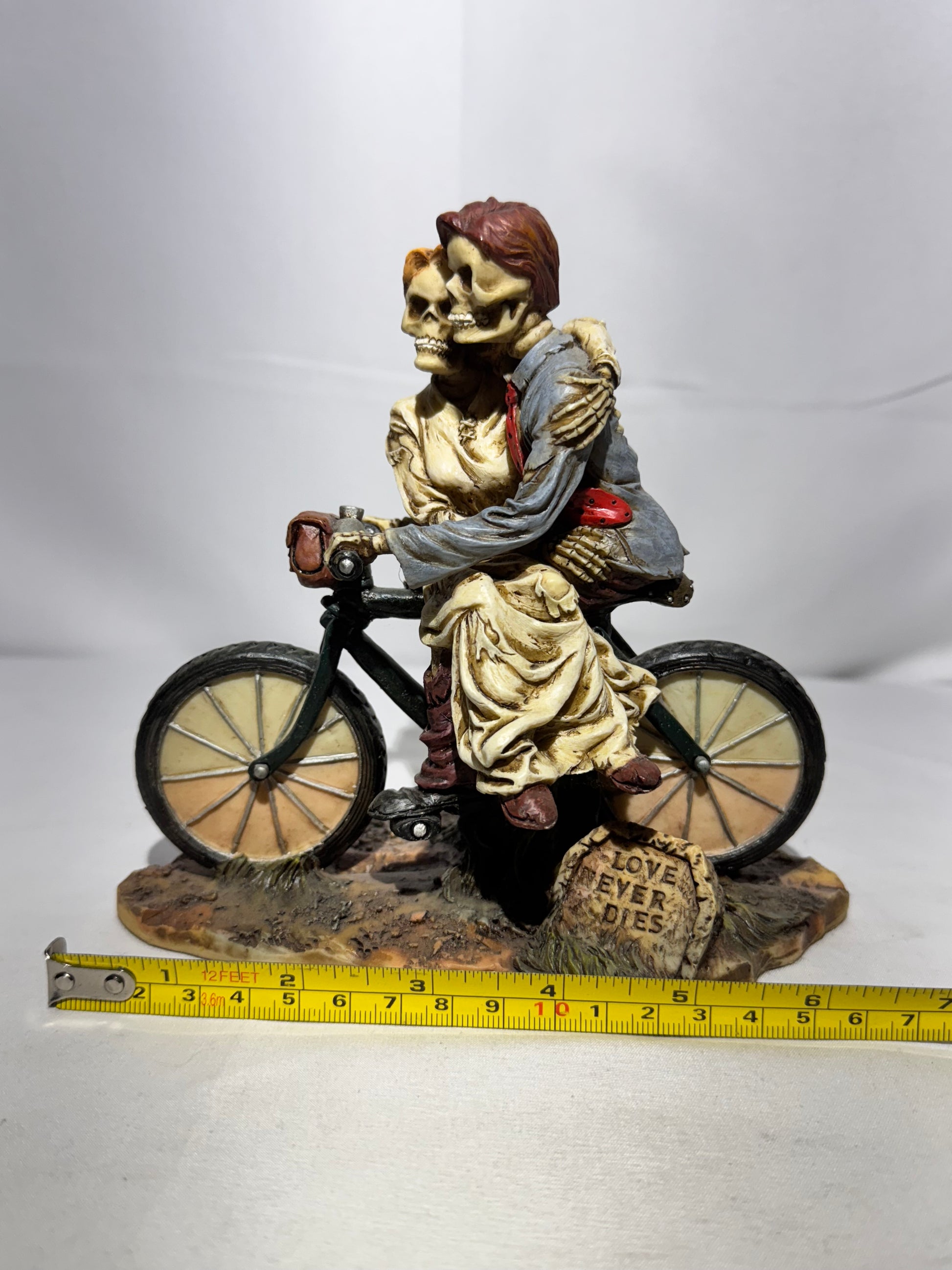 This charming and gothic-themed figurine features a skeleton bride and groom riding together on a bicycle, set atop a tombstone-style base inscribed with “LOVE NEVER DIES.” It’s a standout décor piece that blends romance, whimsy, and macabre artistry.