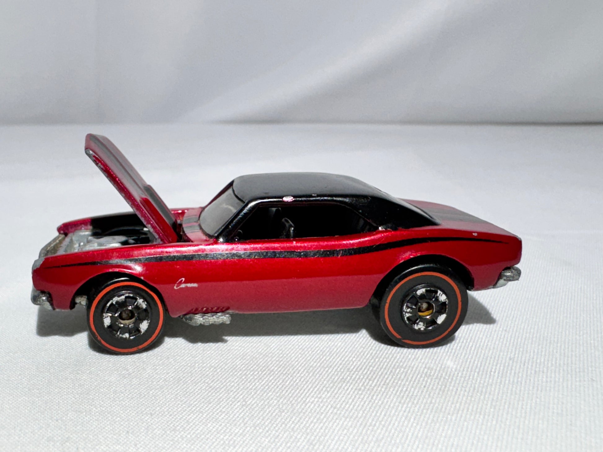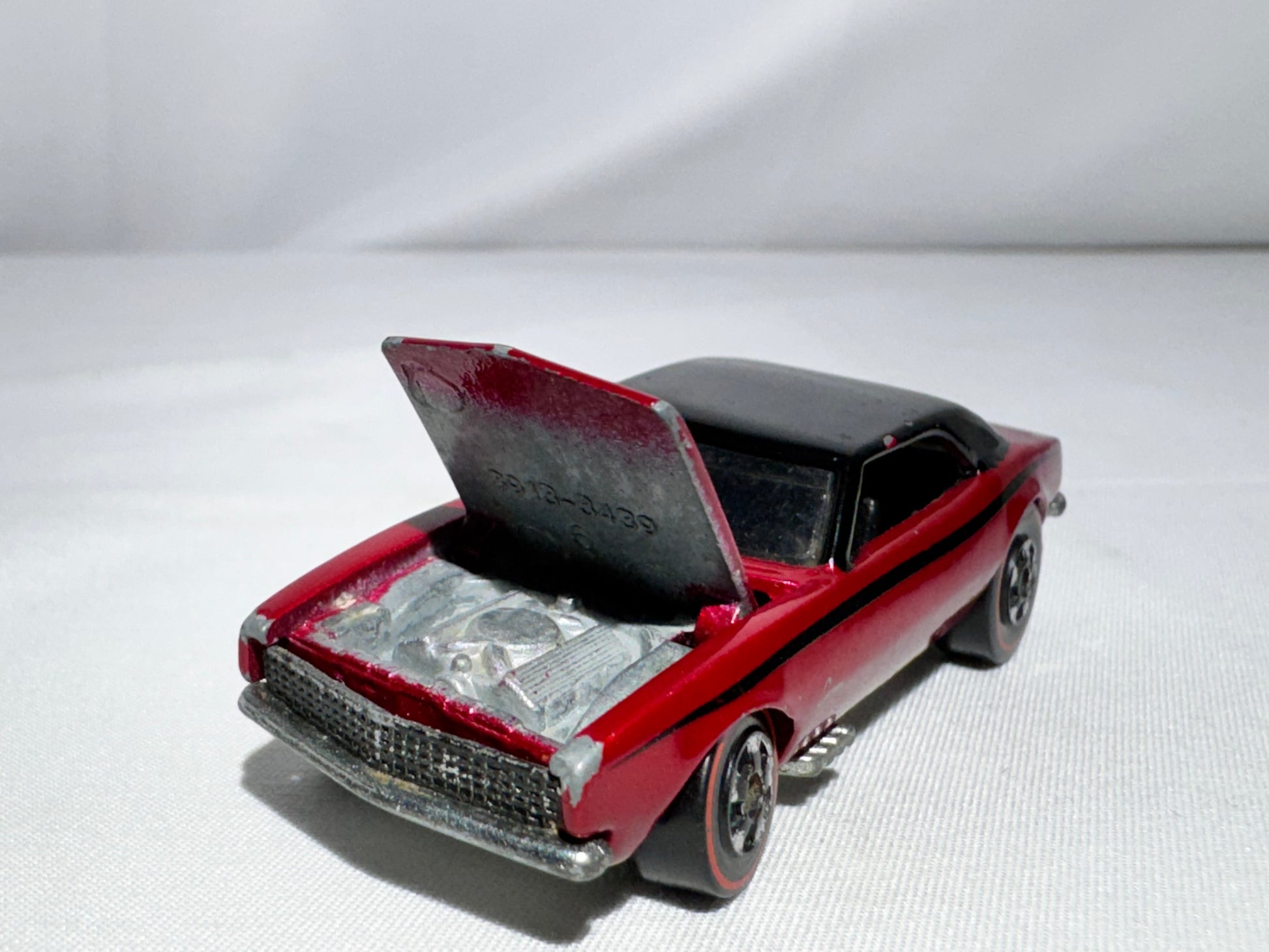 Offering a classic Hot Wheels 1968 Custom Camaro Redline. This vintage piece is in overall good condition with some minor paint chips consistent with age. All four redline wheels roll smoothly, and the hood opens cleanly, revealing the detailed engine inside. Features a black interior and the original classic stance collectors love.