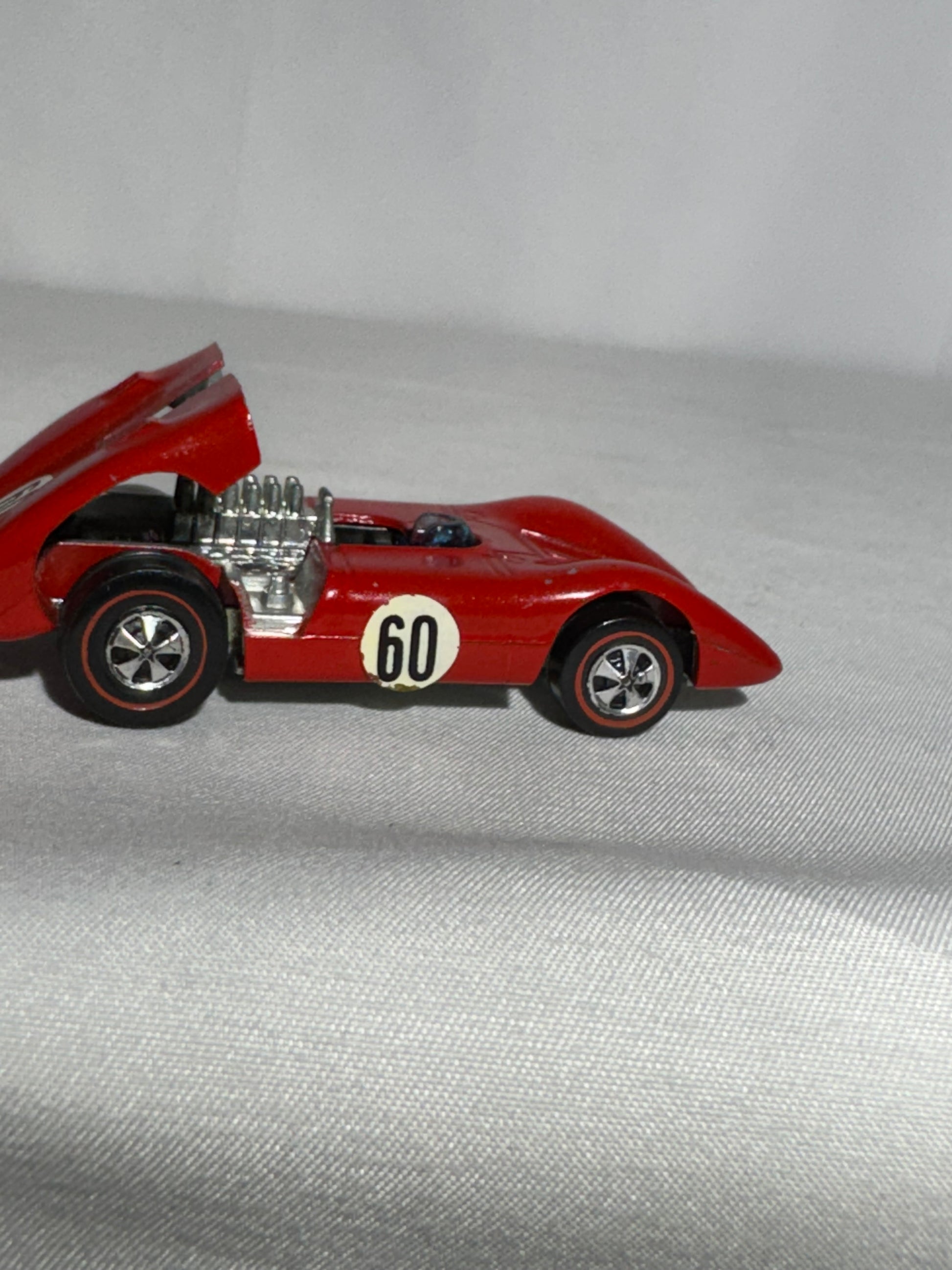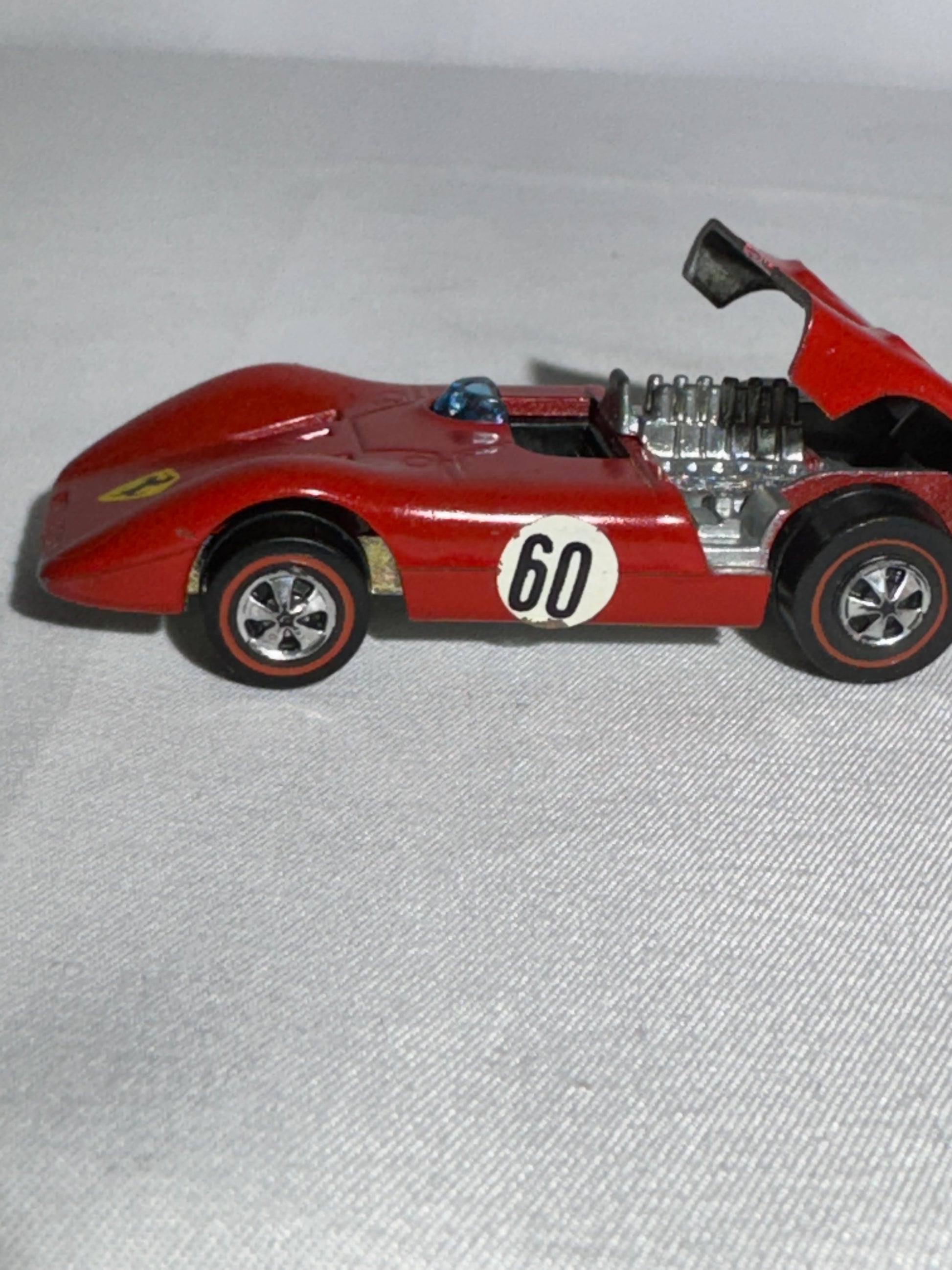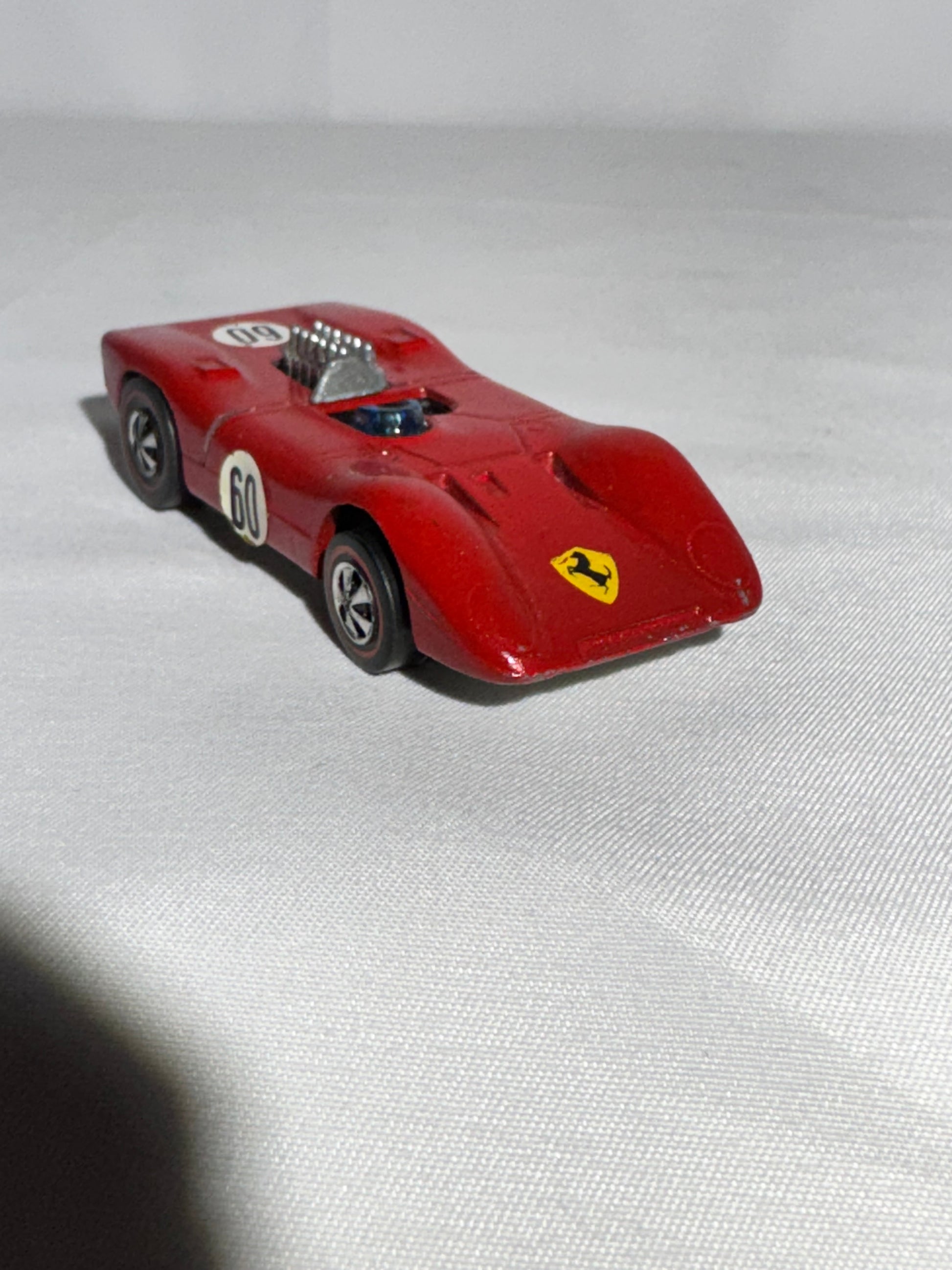This classic 1969 Hot Wheels Redline Ferrari is a standout piece for any vintage collection. It features a bright red Spectraflame body with three original white racing stickers, each displaying a bold black 60—one on each side and one on the rear. The front also showcases the Ferrari logo sticker.