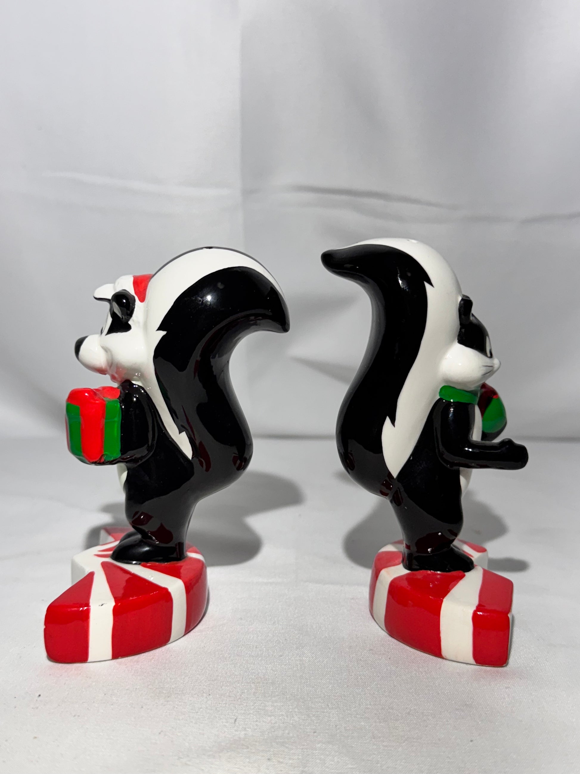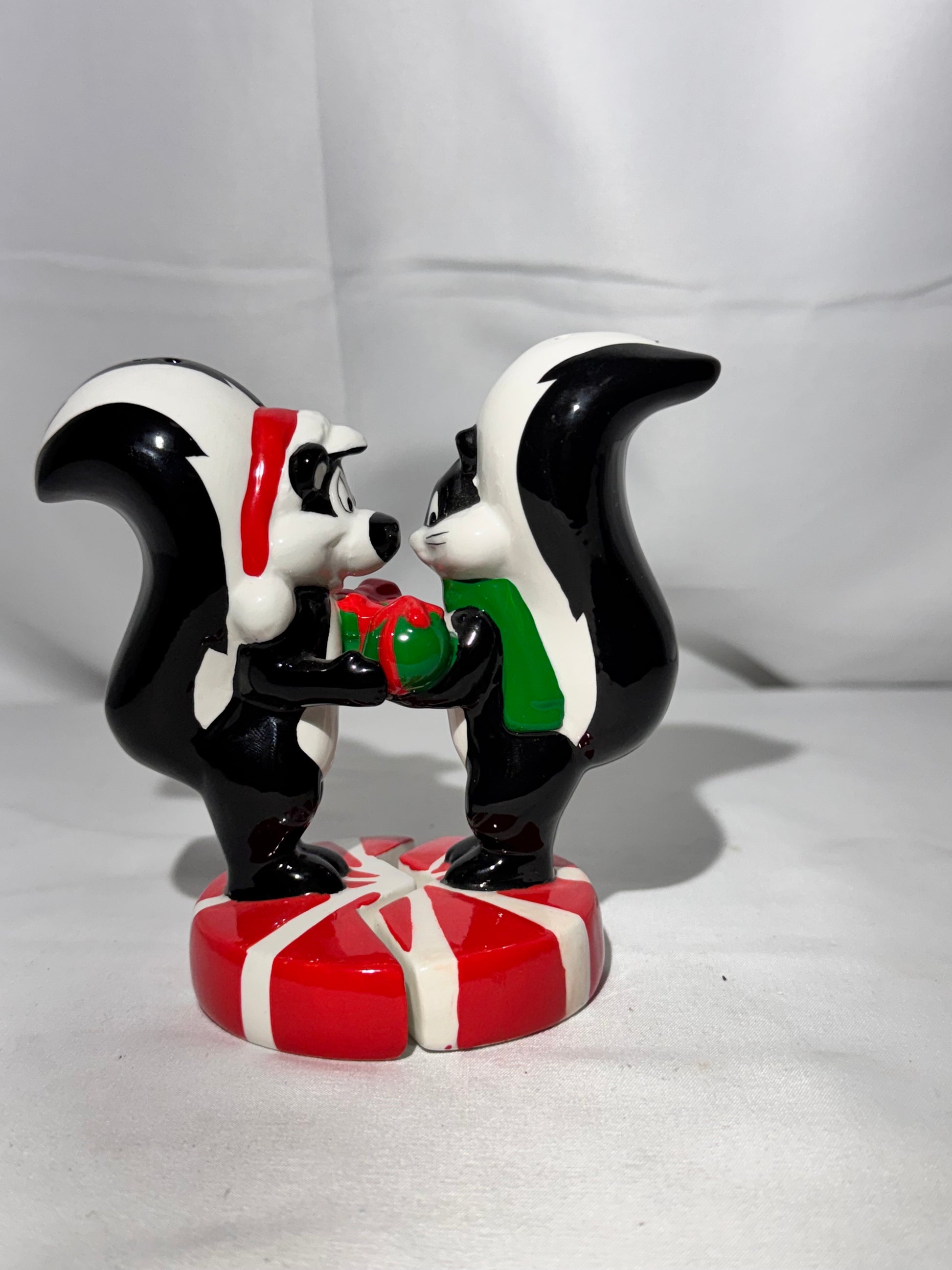Add some classic cartoon charm to your collection with this adorable Looney Tunes salt and pepper shaker set featuring Pepé Le Pew and Penelope exchanging gifts. Both characters stand atop festive peppermint candies, making this a perfect piece for holiday décor or any Looney Tunes fan display.