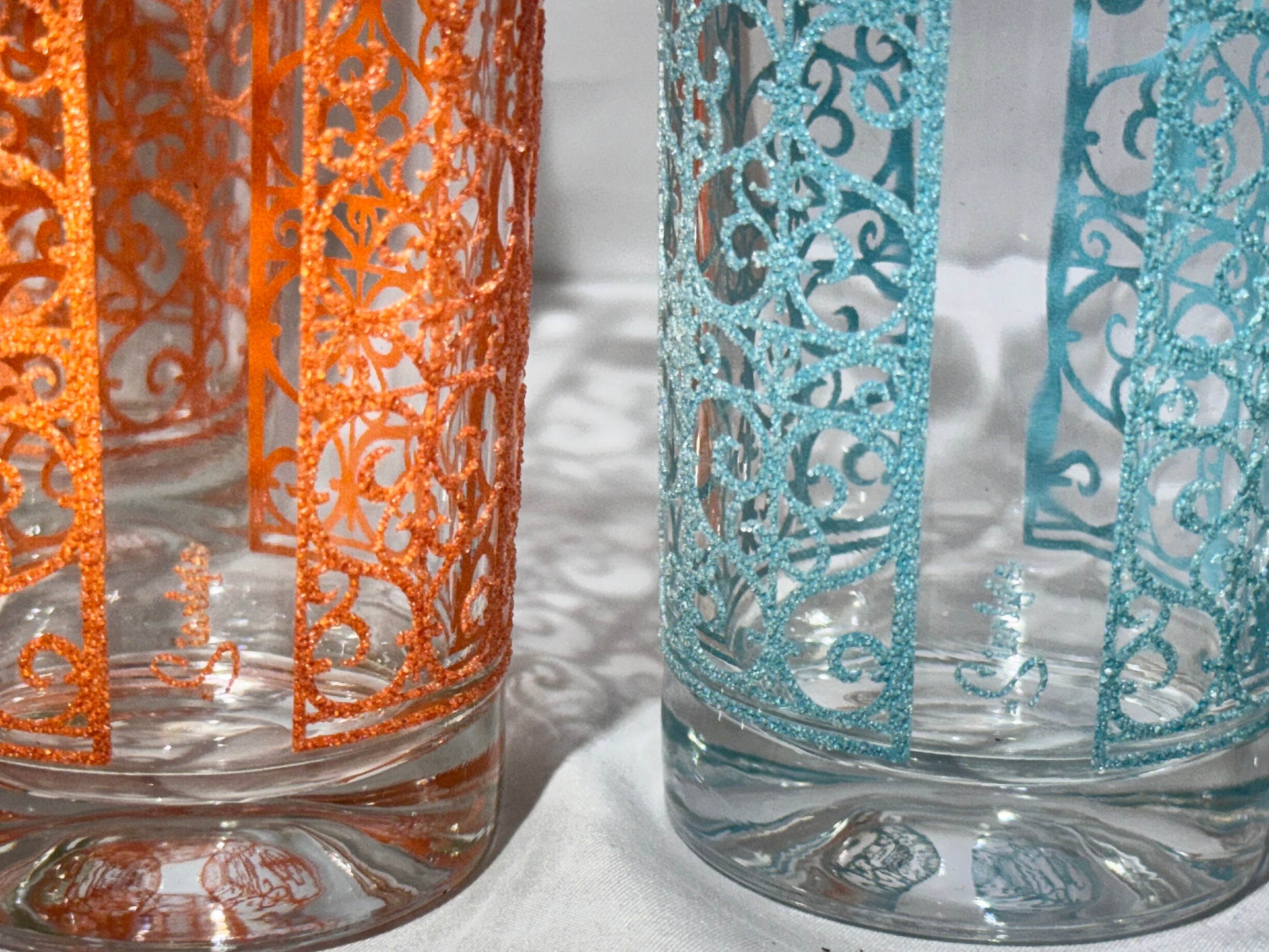 Vintage Libbey Starlyte Madrid Hi-Ball Glass Set of 8 with Original Box – Multicolor Raised Scroll Design