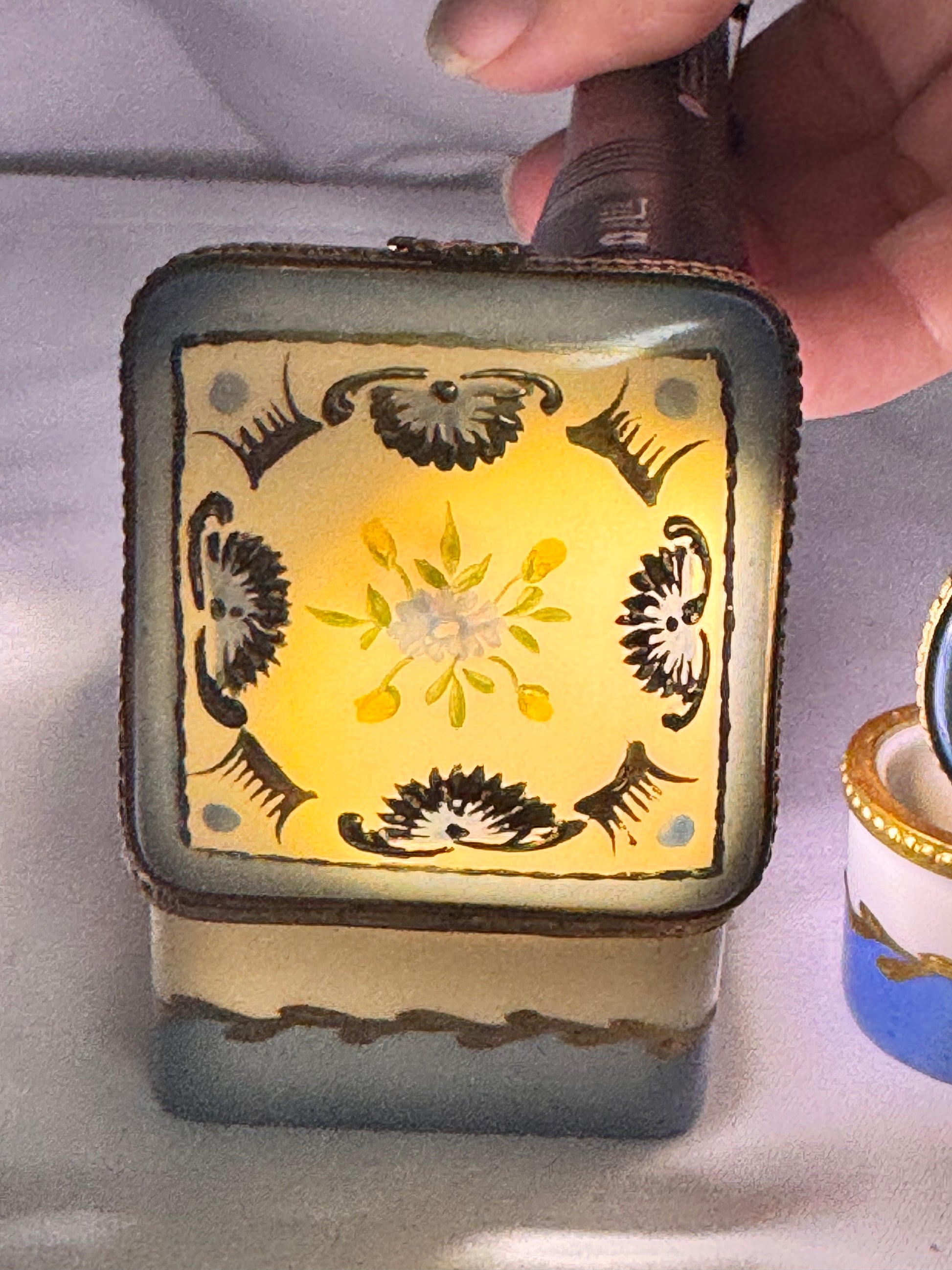 - Square Box: Elegant hand-painted pattern with translucent porcelain, finely accented in gold.