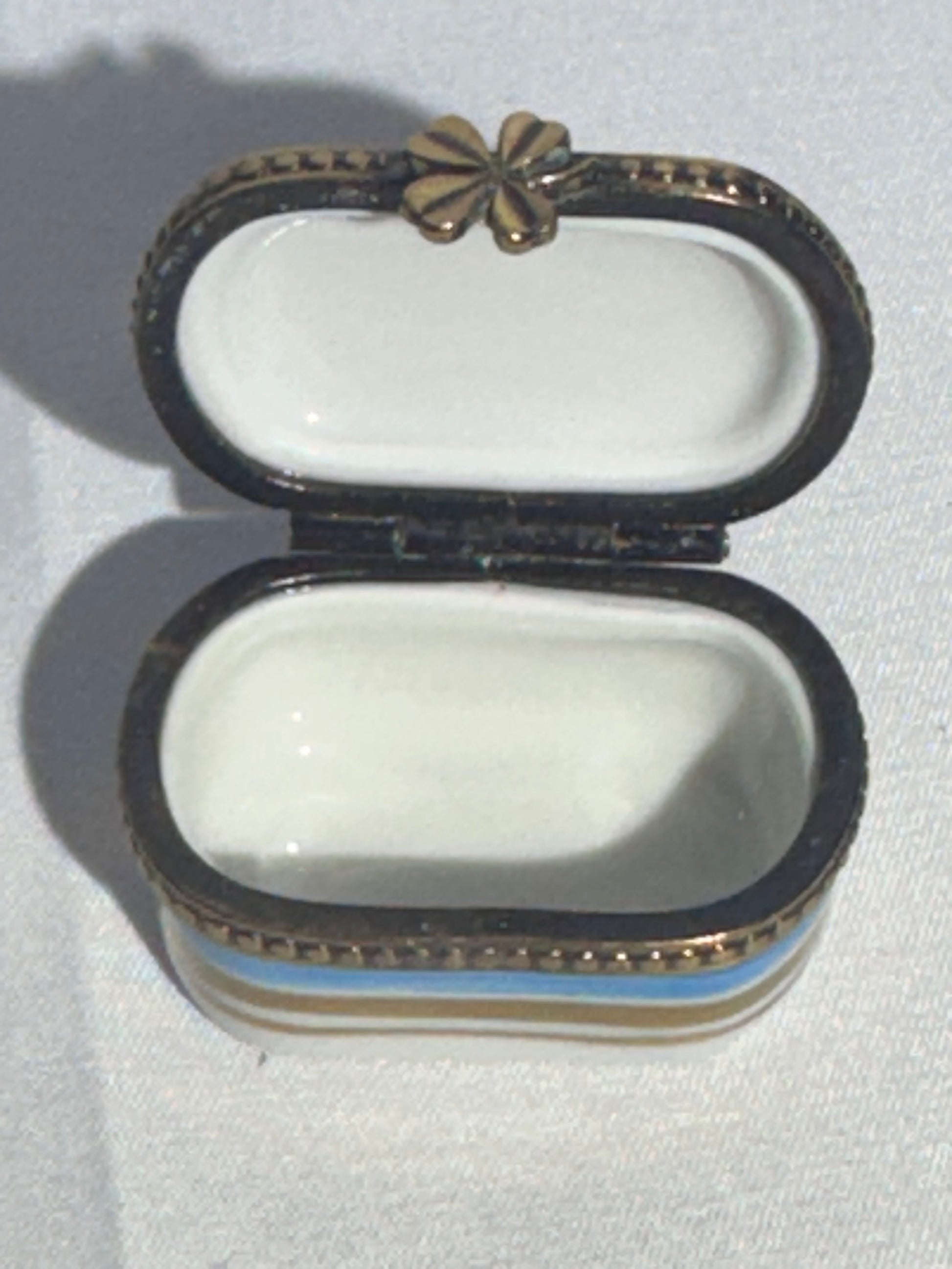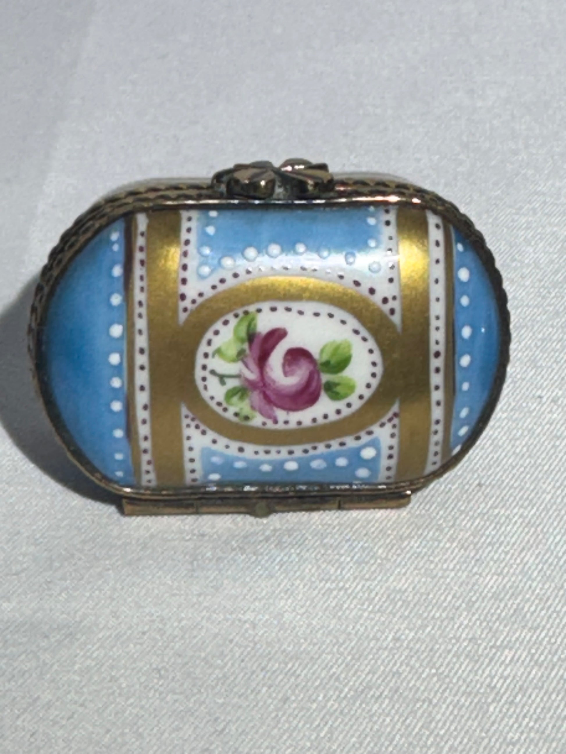 - Oval Box: Blue, white, and gold design with a floral clasp. Elegant and classic.