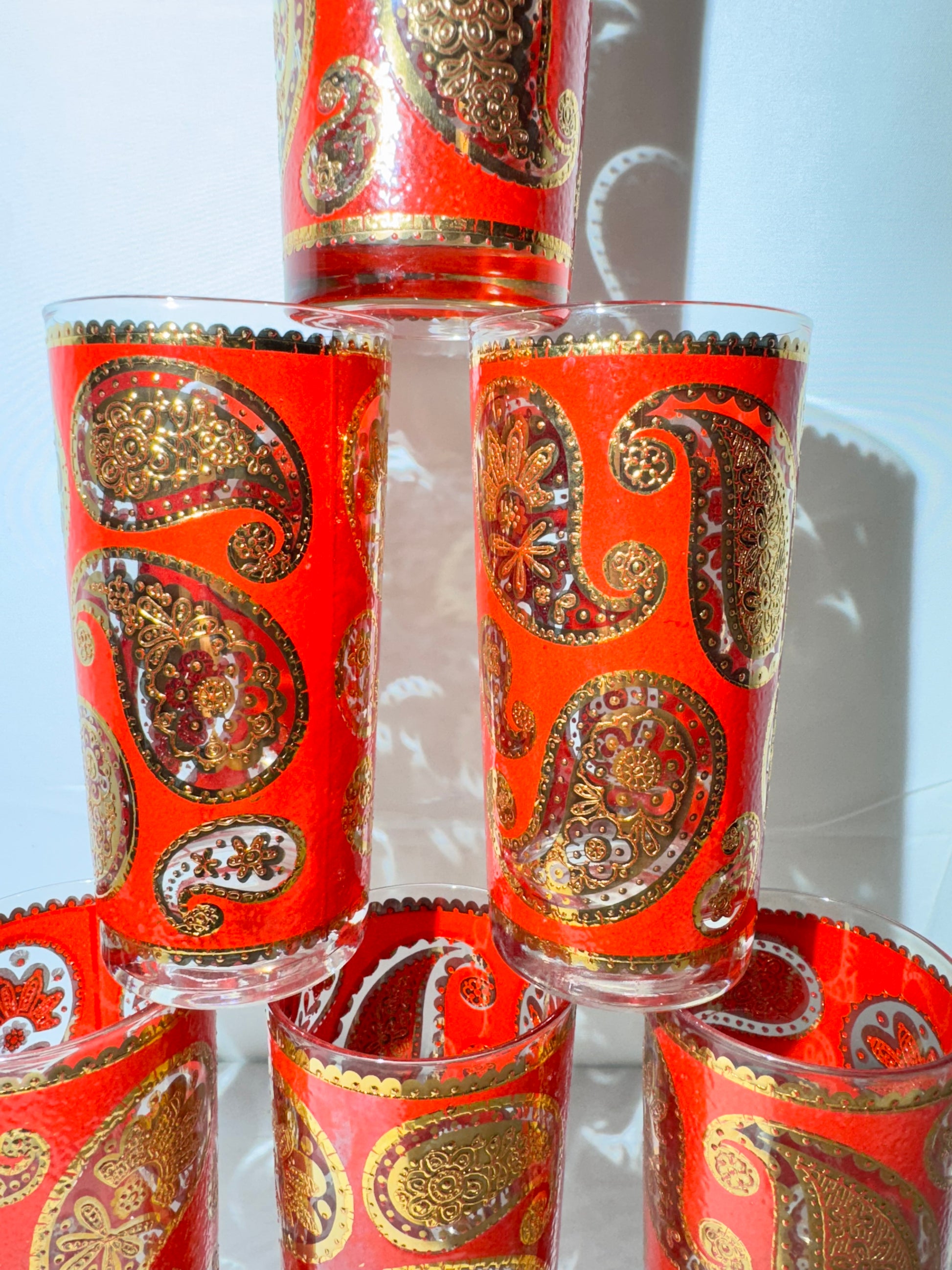 Set of 6 Vintage Culver LTD 22K Gold Red Paisley Highball Glasses – 5½” TalL