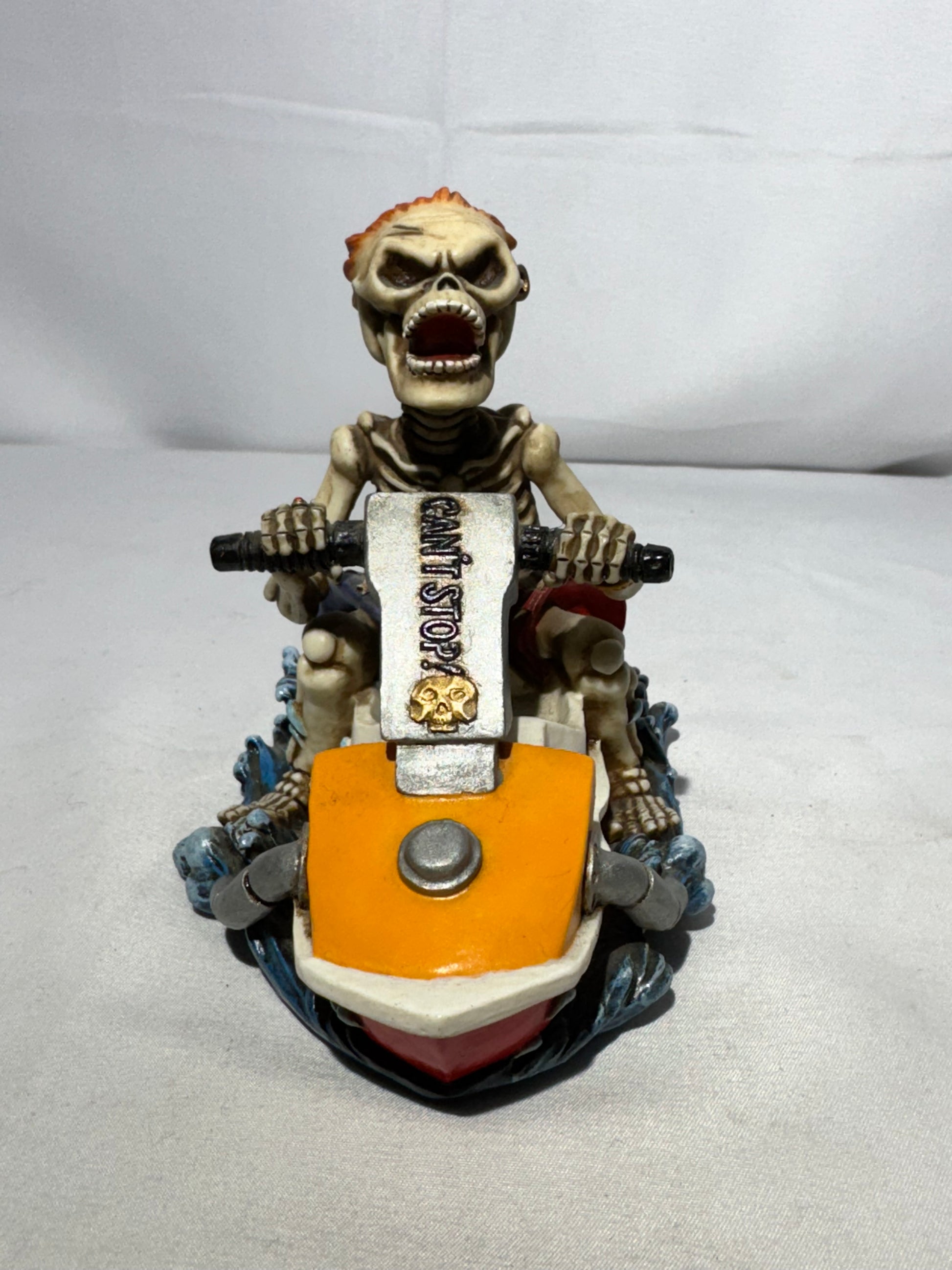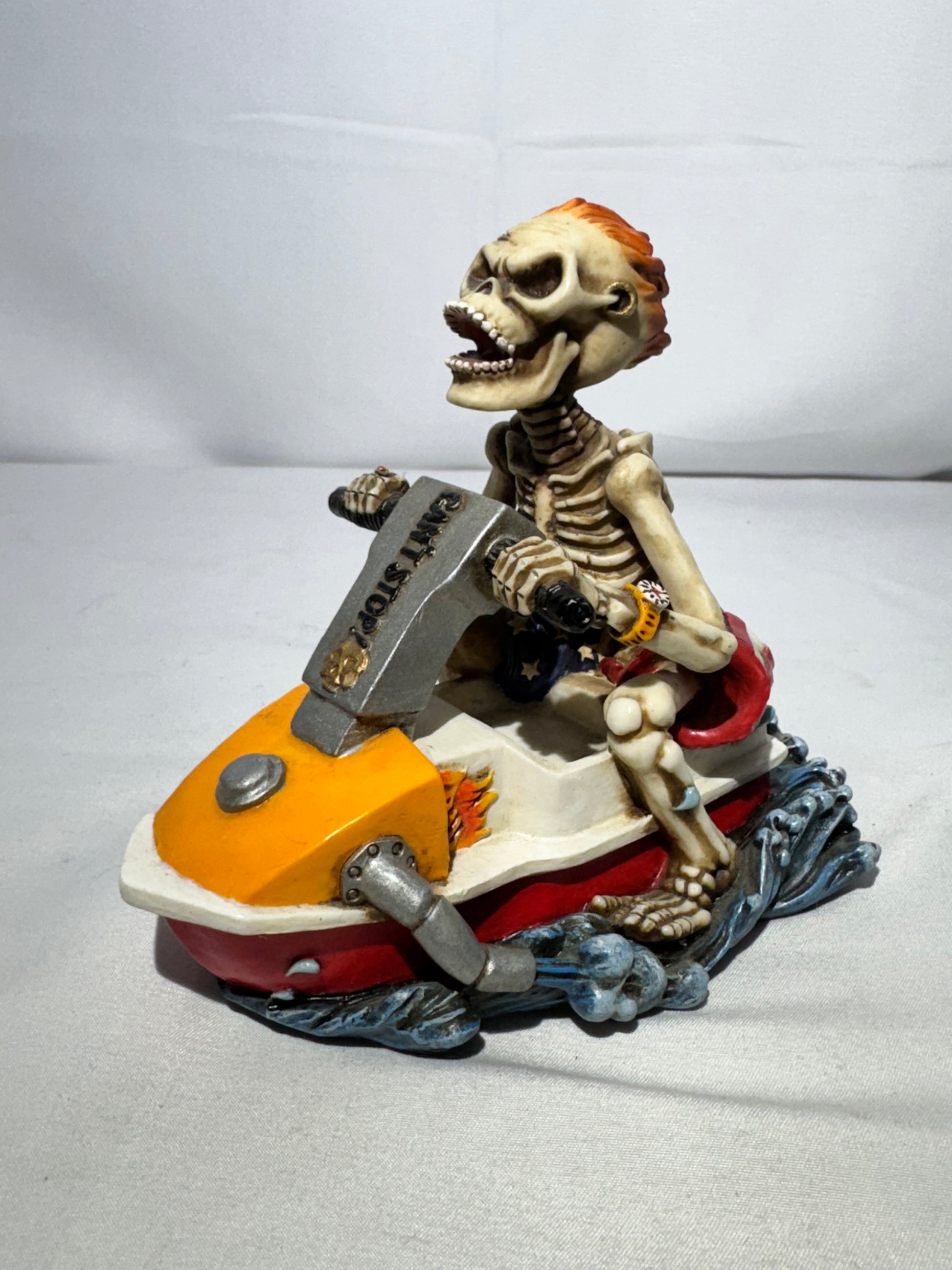 - Features a skeleton riding a jet ski, holding onto the handlebars with full action pose.