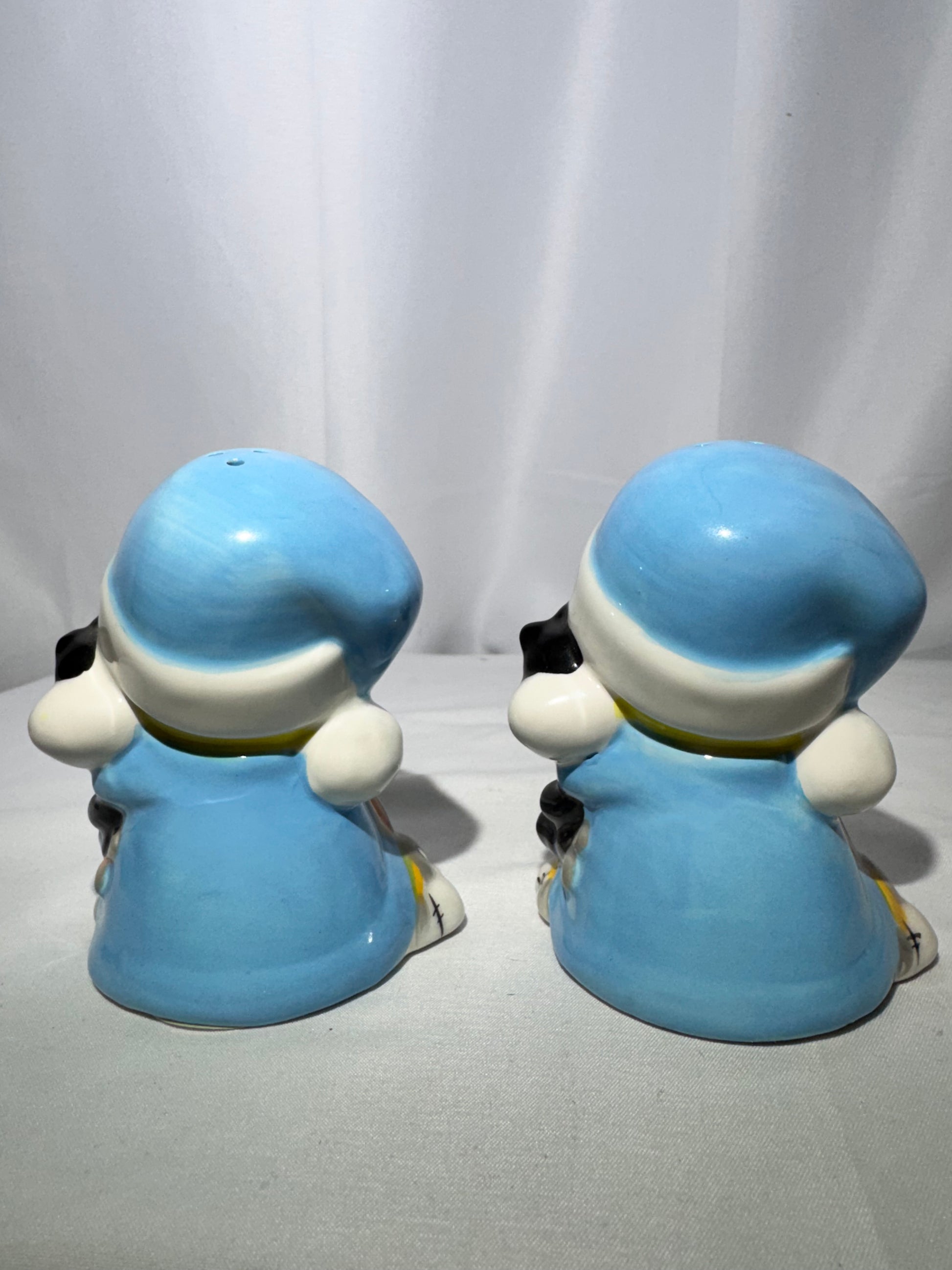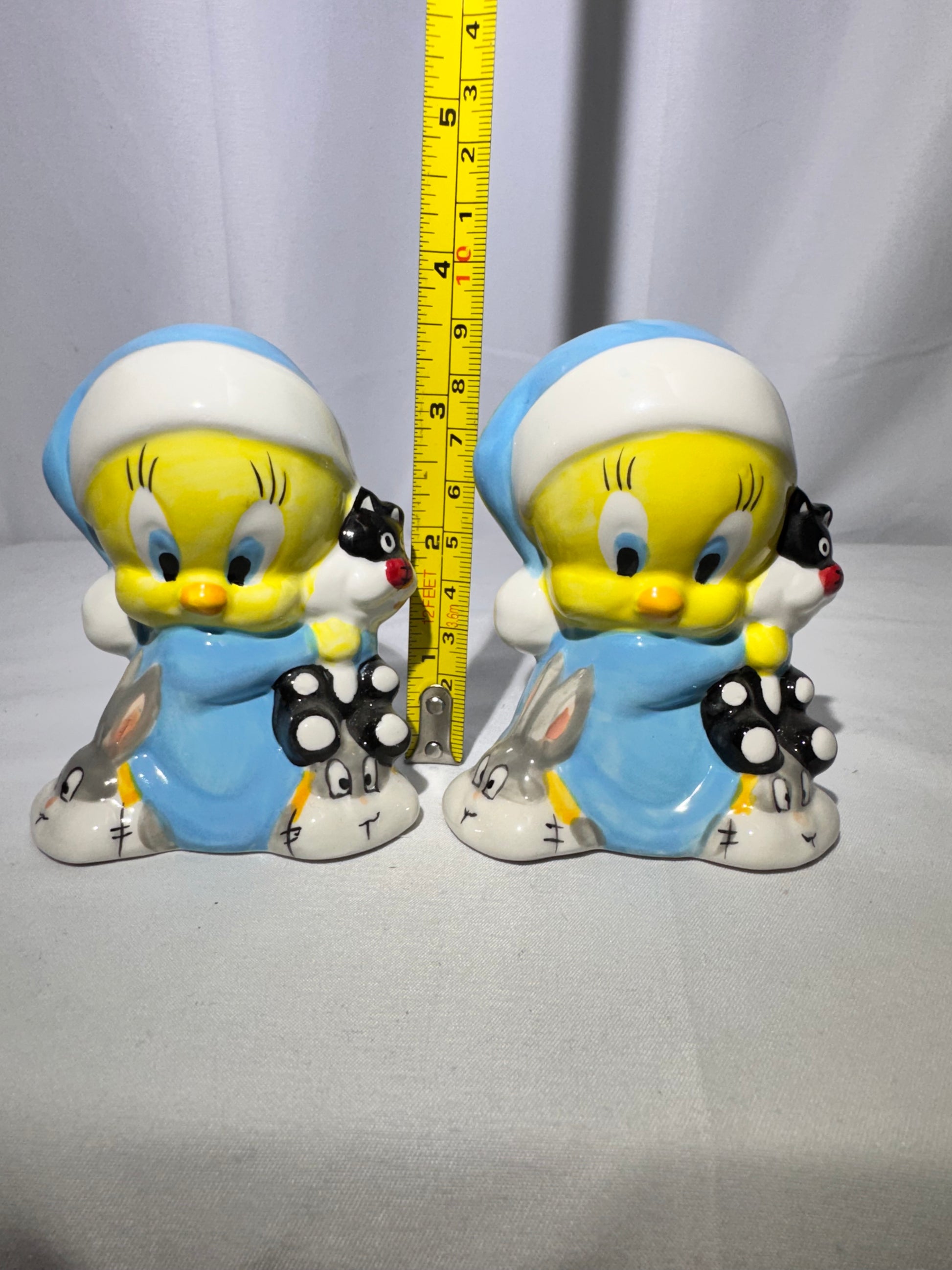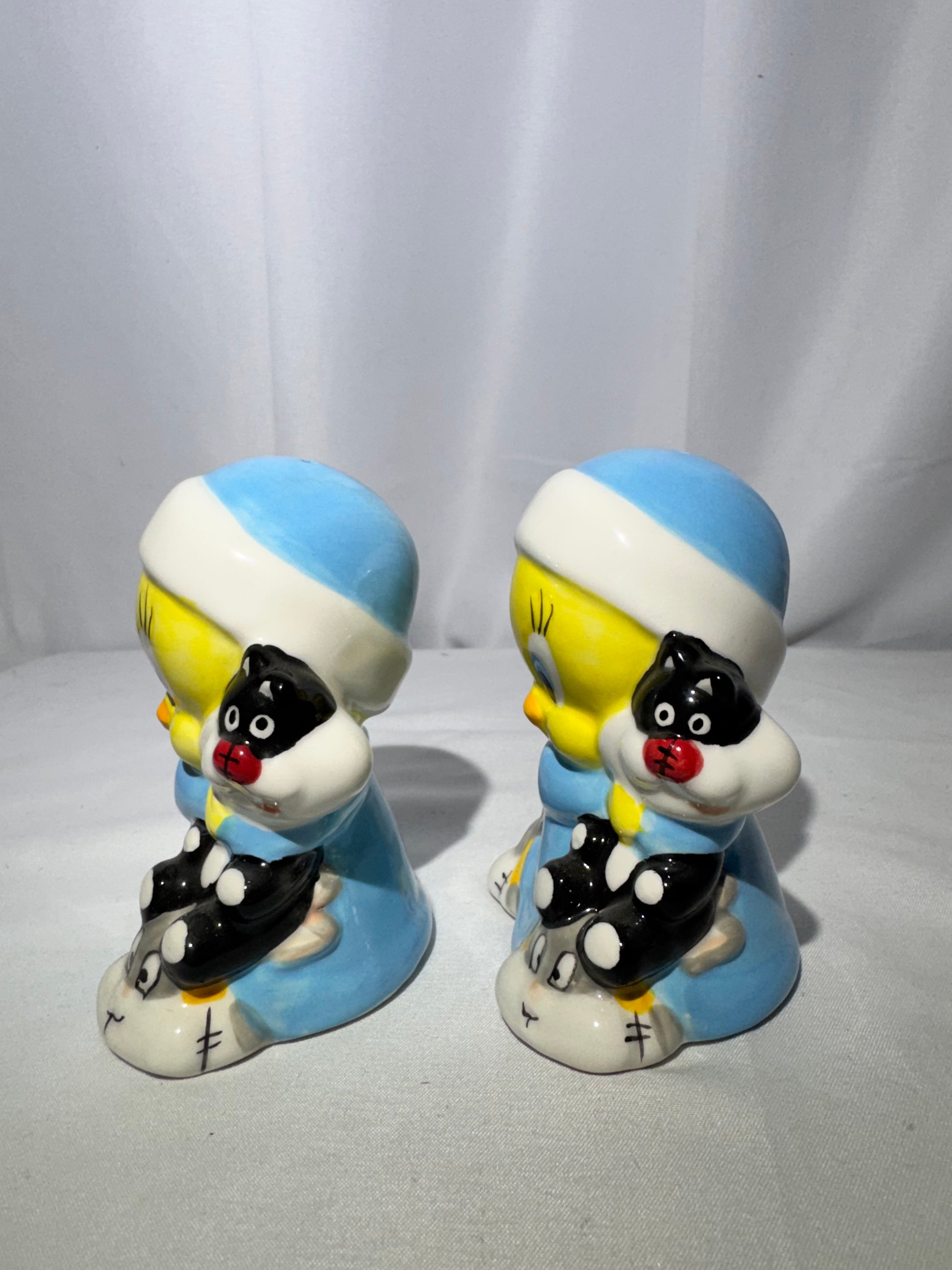 Add a charming and collectible touch to your kitchen or display with this vintage Looney Tunes Tweety Bird salt and pepper shaker set. This adorable set features Tweety dressed in blue pajamas, holding a small Sylvester cat toy, and wearing Bugs Bunny slippers—an iconic and playful design that Looney Tunes fans will love.