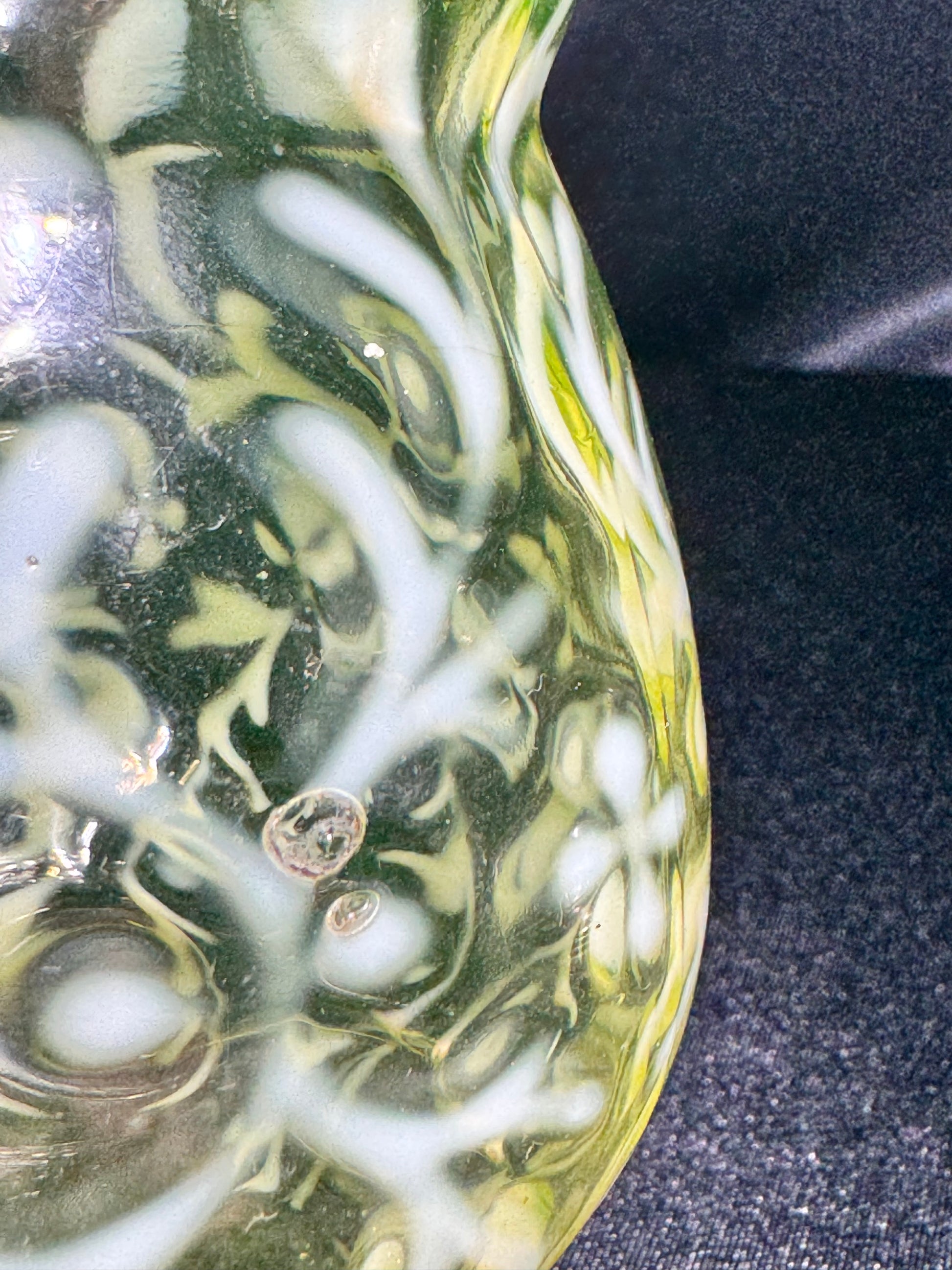 The glass displays the classic Spanish Lace pattern with elegant opalescent detailing. As common with vintage blown glass, there are blow bubbles present, noted clearly in the photos. One bubble appears to have burst, leaving a small indent, and the top rim feels slightly rugged, all documented in pictures for full transparency.