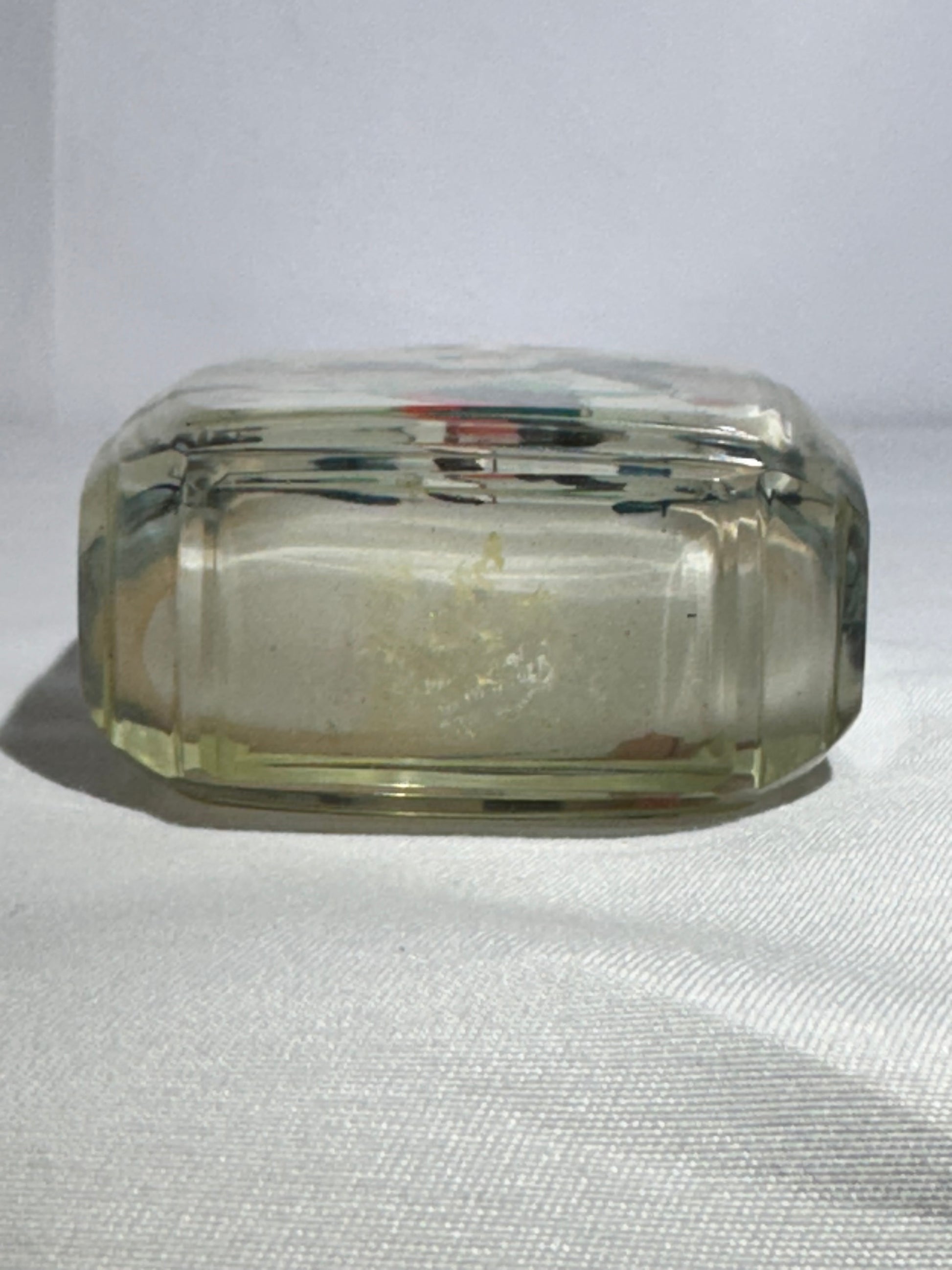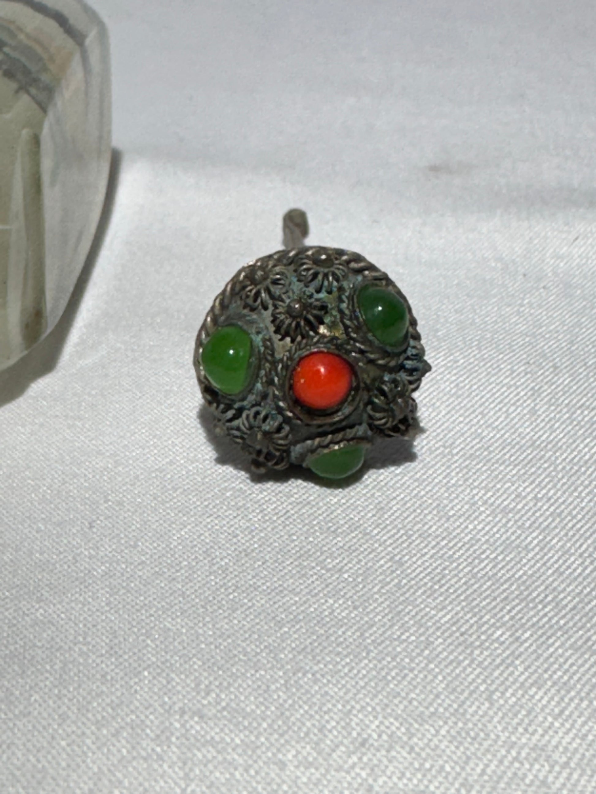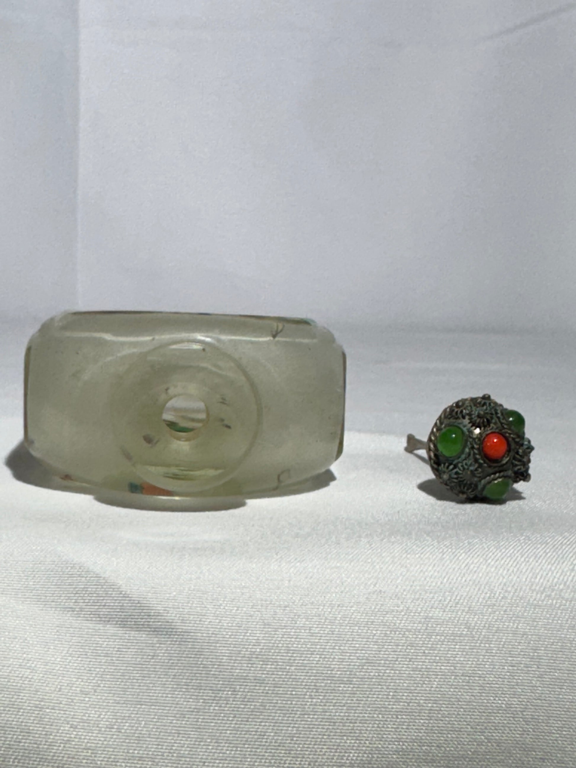 The bottle retains its original metal topper, which is beautifully decorated with possible jade and coral accents, adding elegance and authenticity to this rare collectible.
