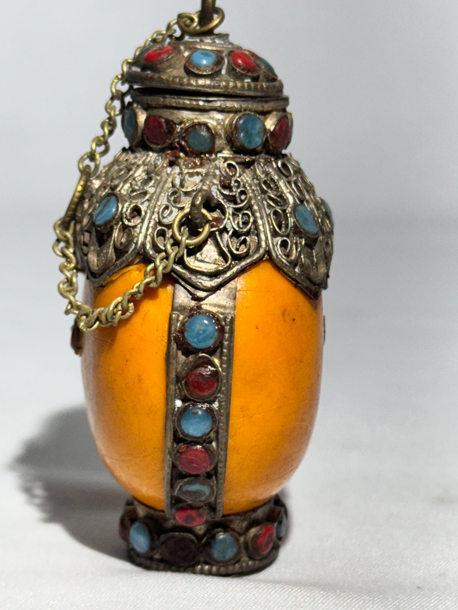 Antique Tibetan Snuff Bottle with jeweled Inlay – Ornate Metalwork & Chain Stopper