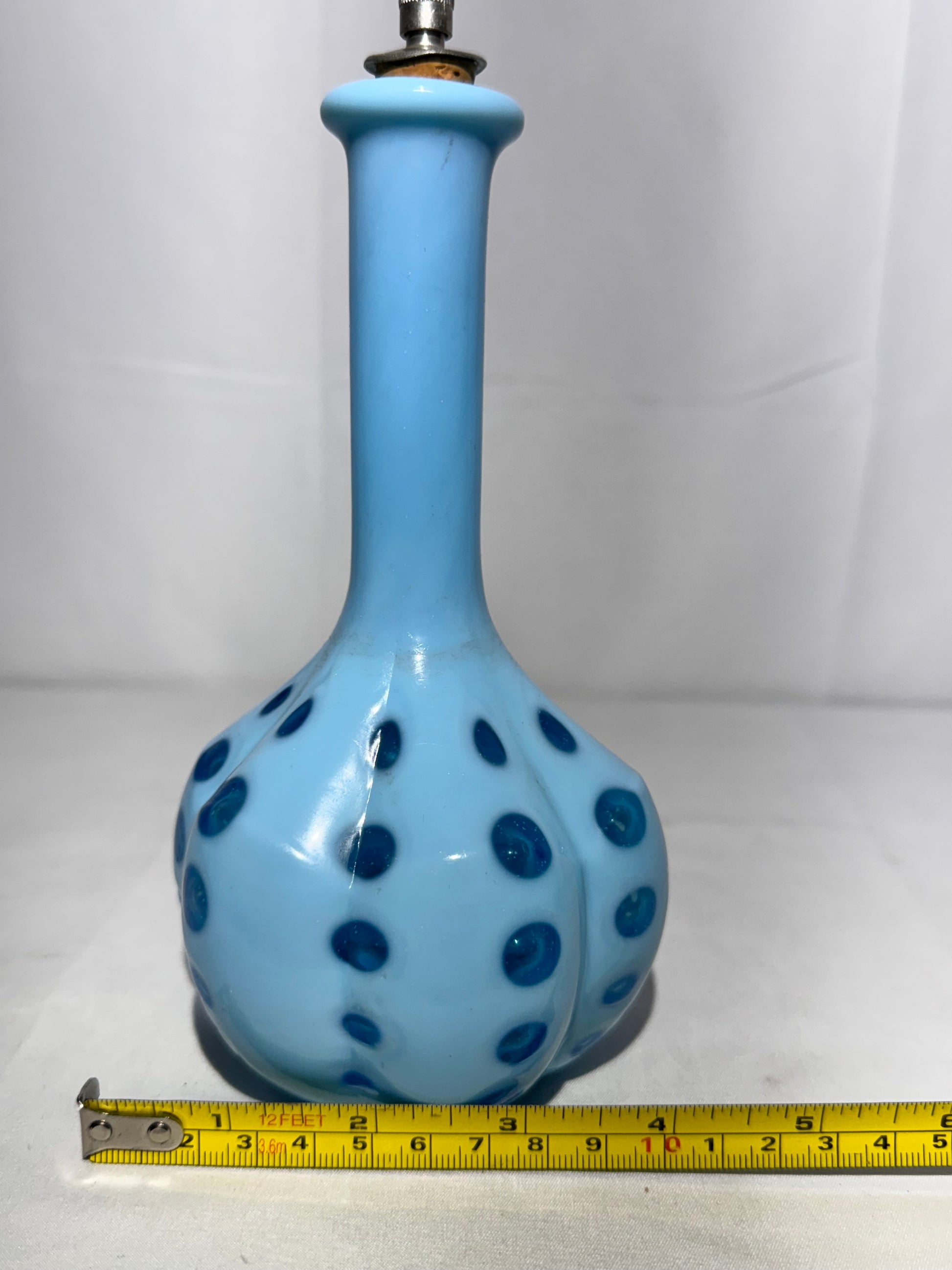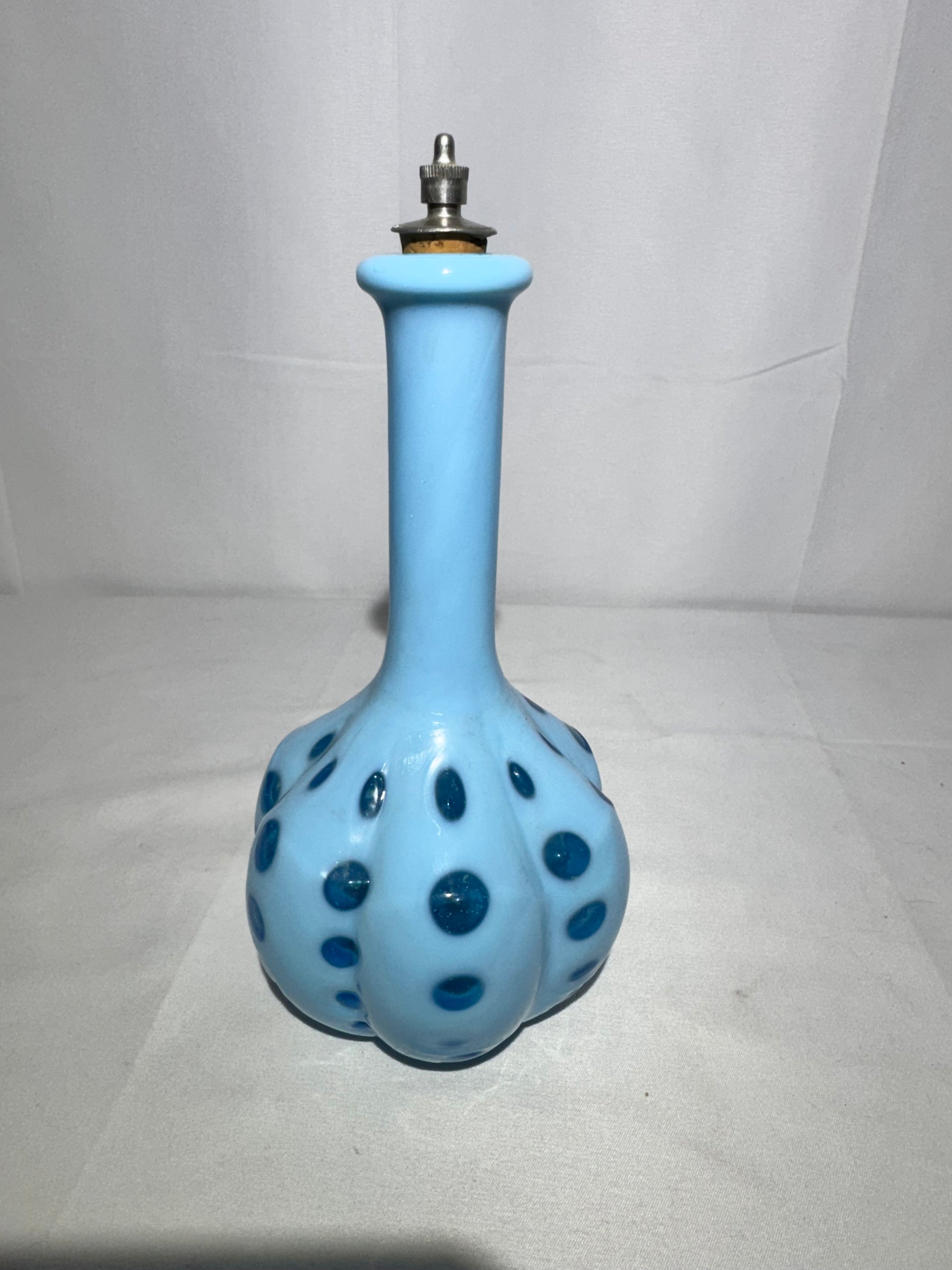 Add a classic touch to your collection with this vintage Coin Dot blue barber bottle. It stands approximately 8 inches tall and features the iconic raised dot pattern collectors love. The glass shows minor imperfections consistent with age and normal use, all shown clearly in the photos. There are no cracks or chips.