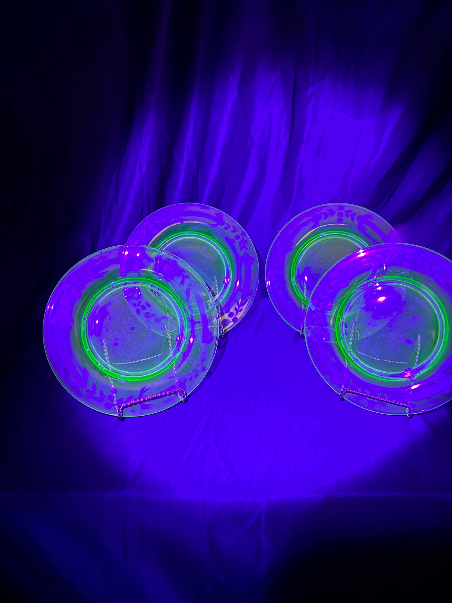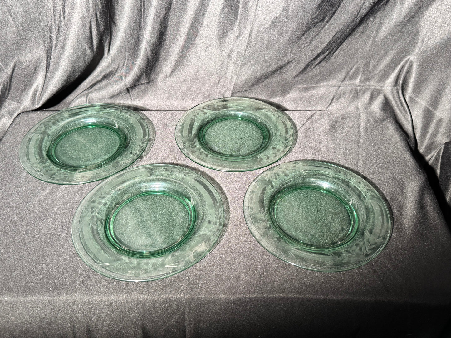 Uranium 7 1/4” plates -set of 4 - Blue Dolphin- Depression Glass - etched - one plate has glass bubble noted in pictures