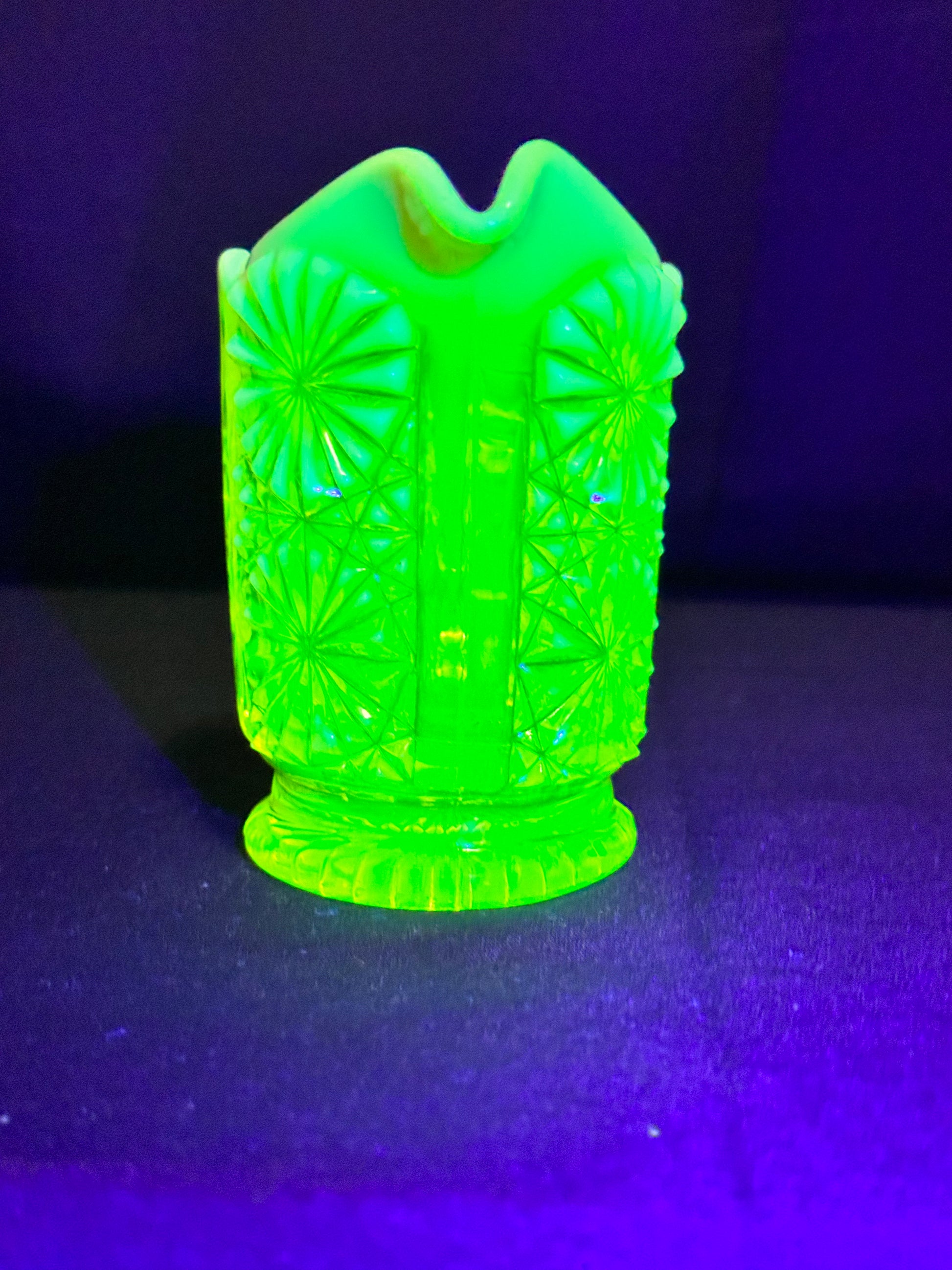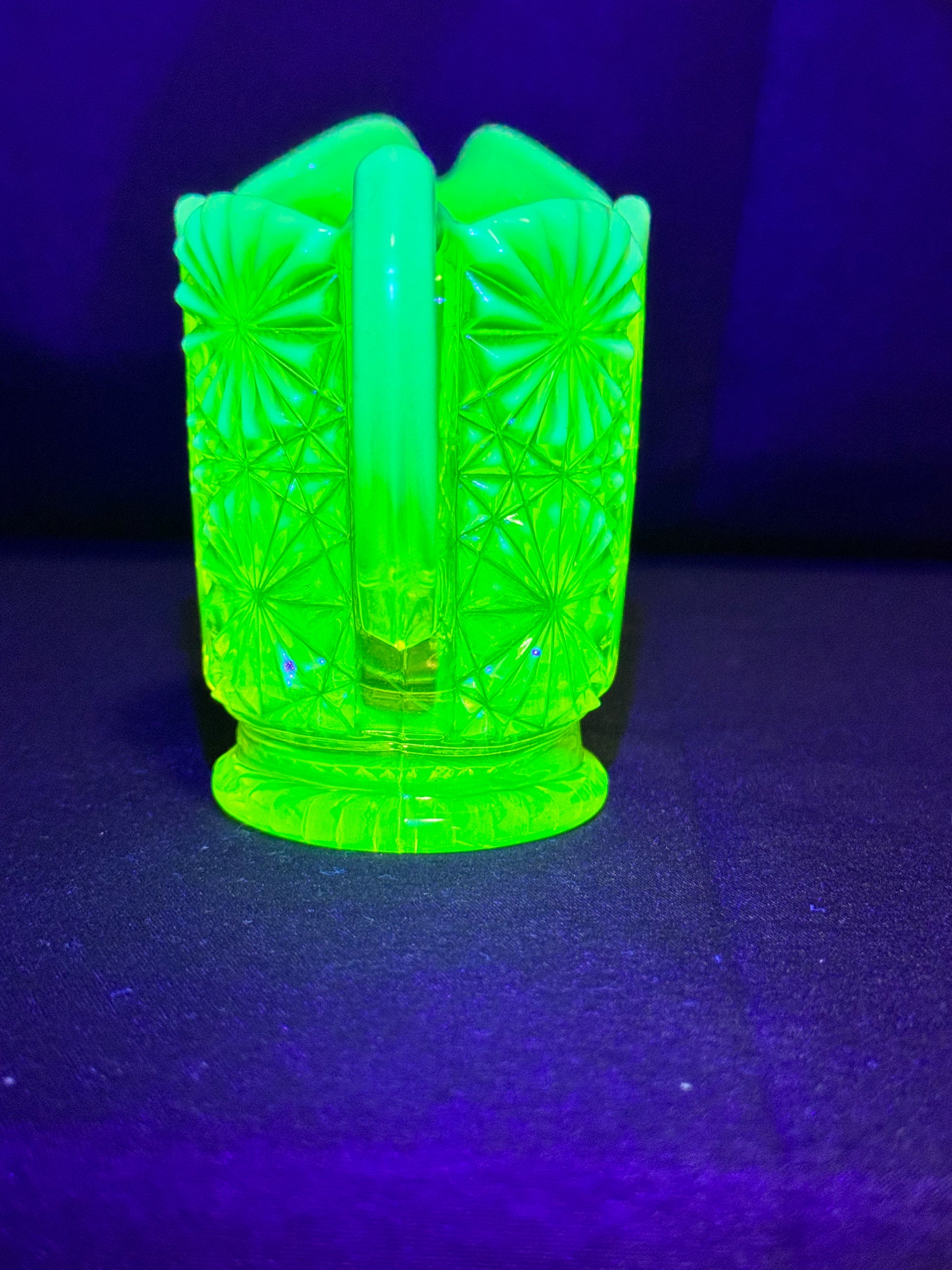 Crafted in England by Davidson Glass, this creamer contains uranium, causing it to glow a vivid green under UV/black light—a true collector favorite!