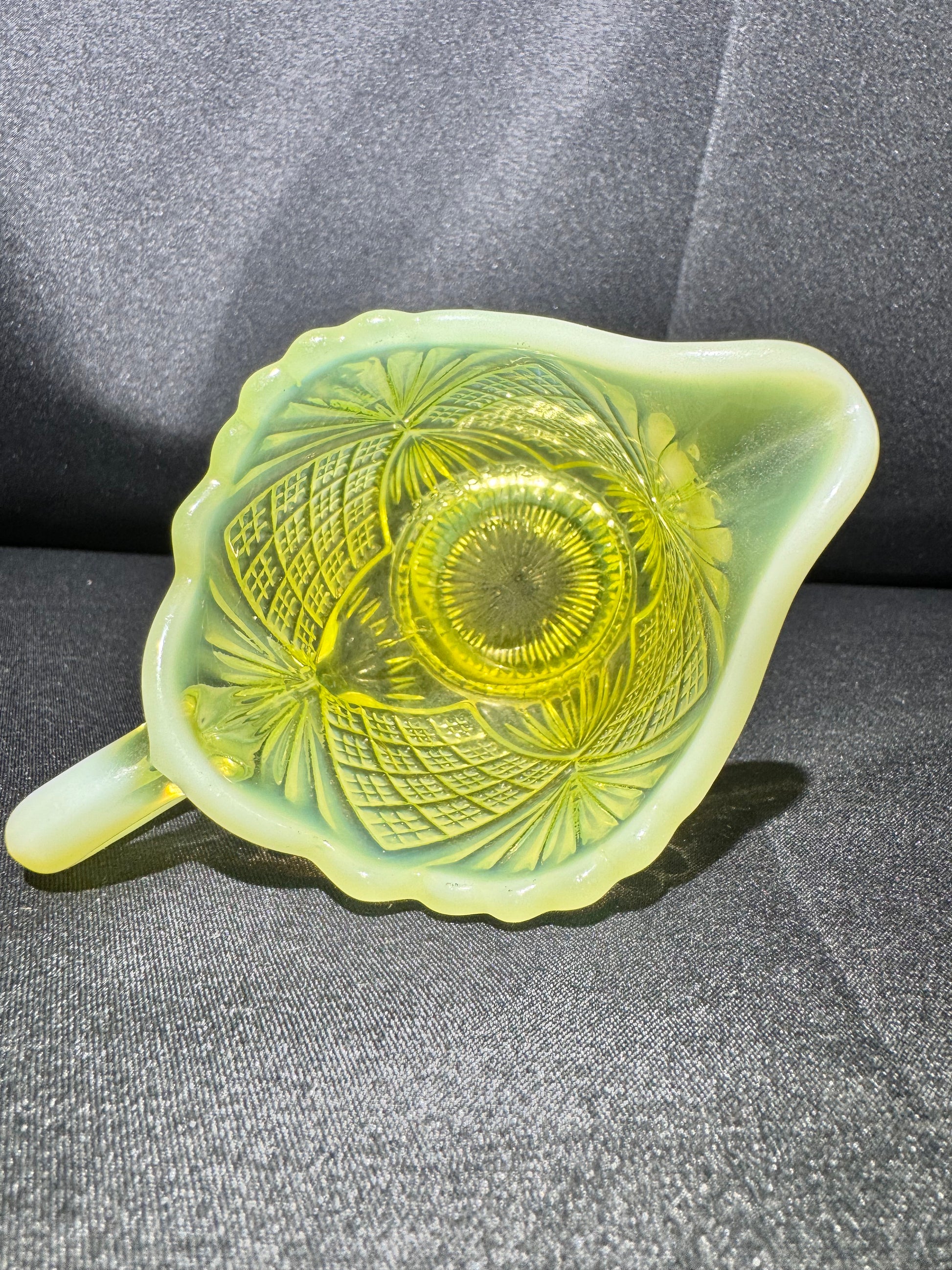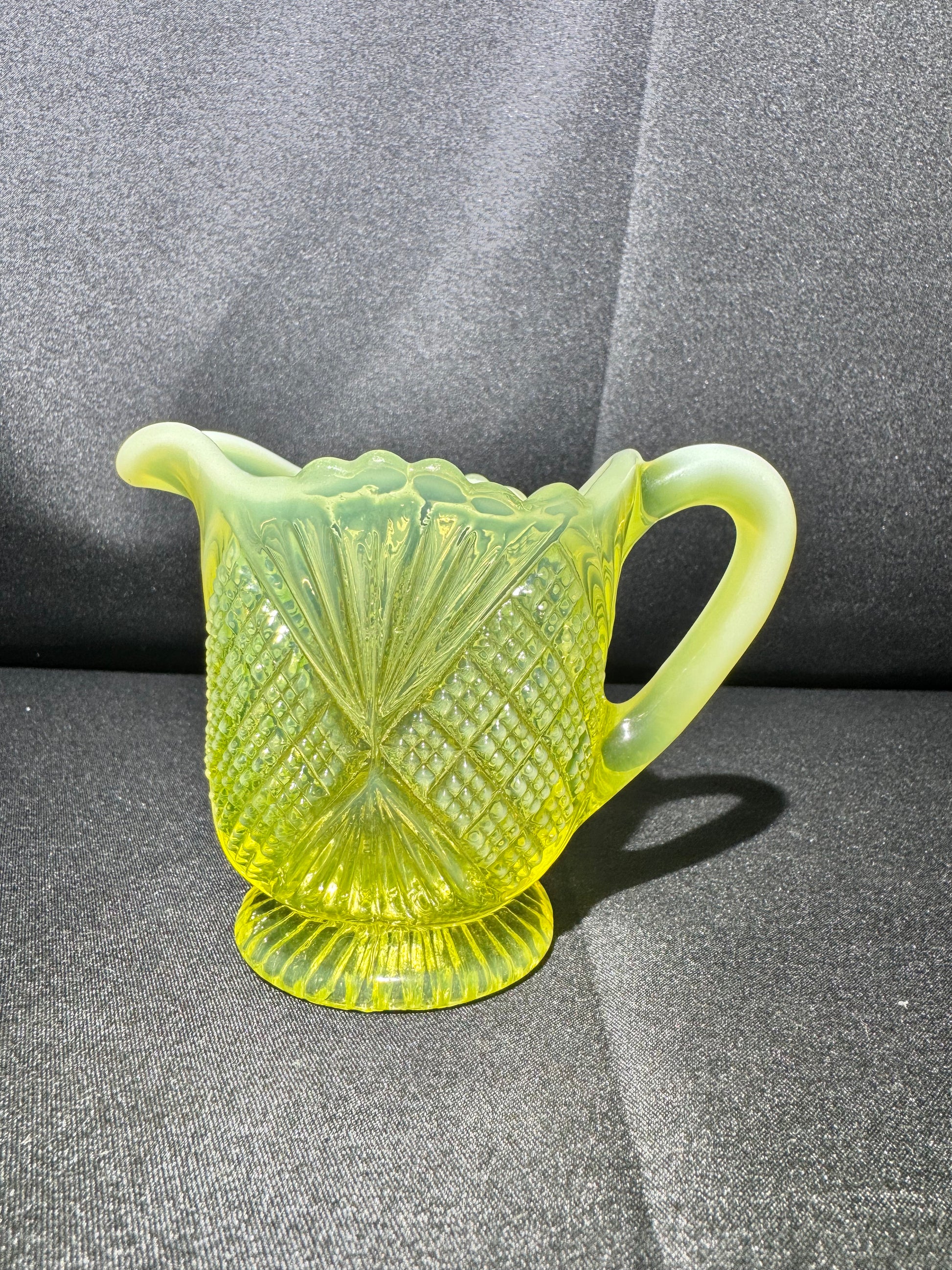 Perfect for collectors of Davidson glass, uranium glass, or Pearline pieces, this charming creamer adds vintage glow and historical beauty to any display or table setting.