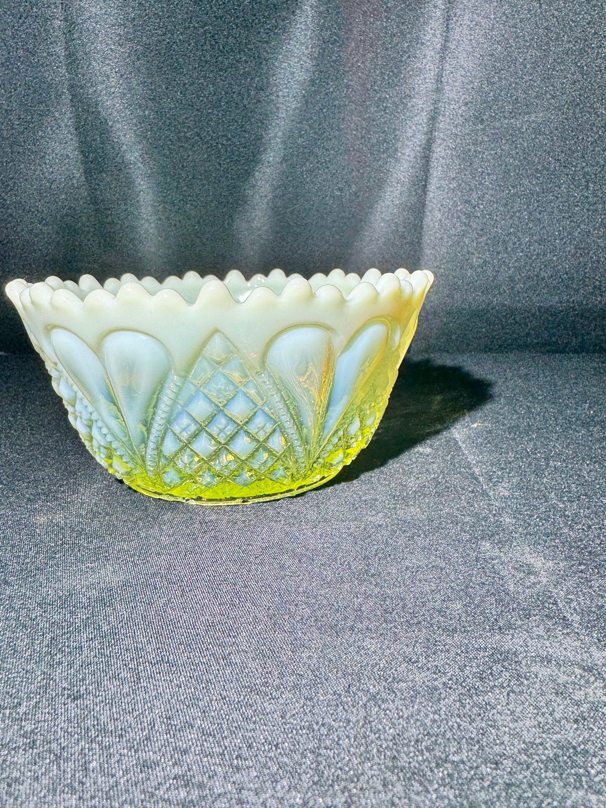 - Color: Primrose Pearline (Uranium Glass)