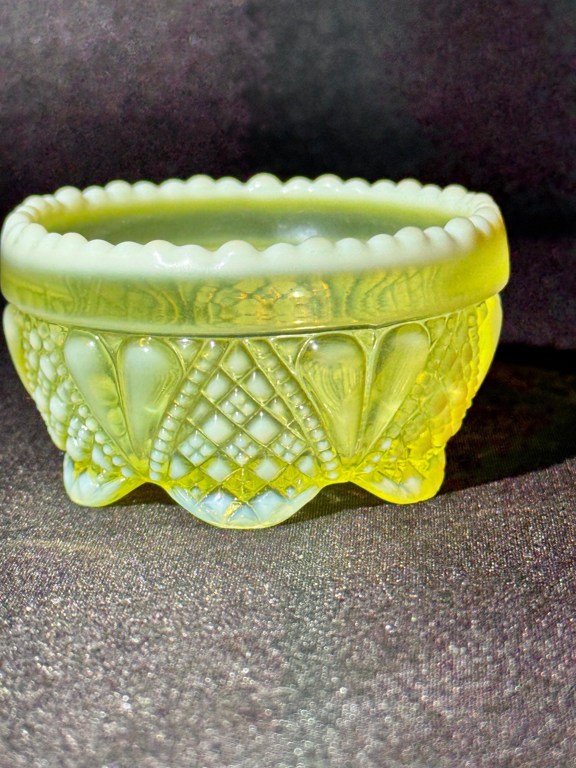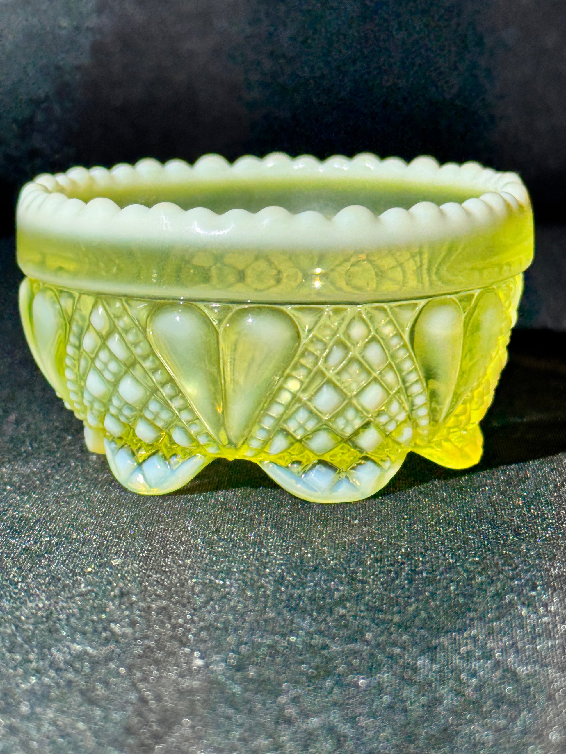 A charming small round salt cellar by George Davidson & Co., in their classic William and Mary pattern. Crafted from Uranium glass, this piece gives off a striking green glow under UV light, adding to its collectible appeal.