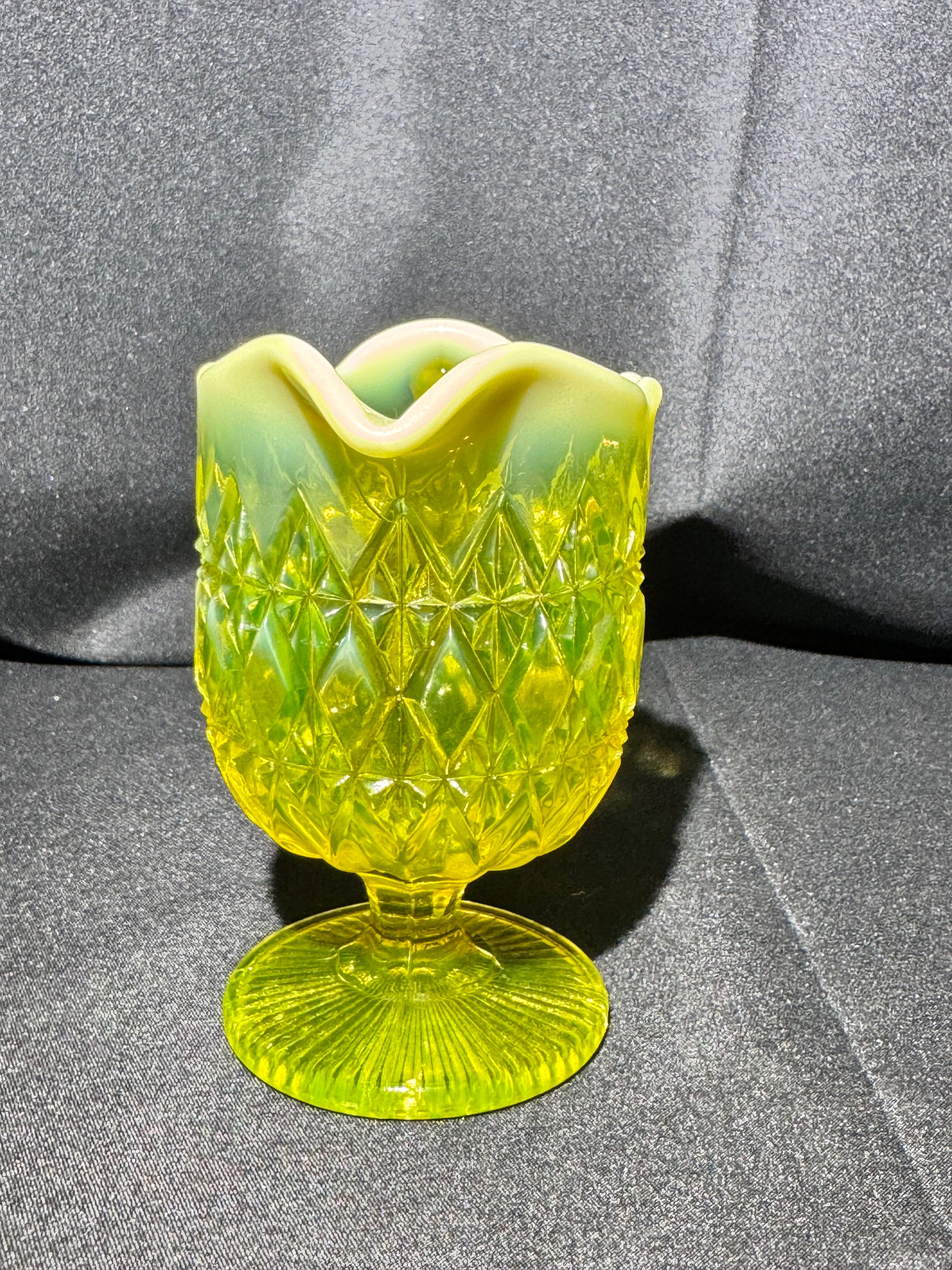Bring vintage charm and a radiant glow to your collection with this beautiful Davidson “Prince William” Primrose Pearline Pedestal Creamer. Crafted by George Davidson & Co. (England), this delicate creamer showcases the elegant primrose yellow uranium glass with the signature pearline opalescent edging, glowing vividly under UV light.