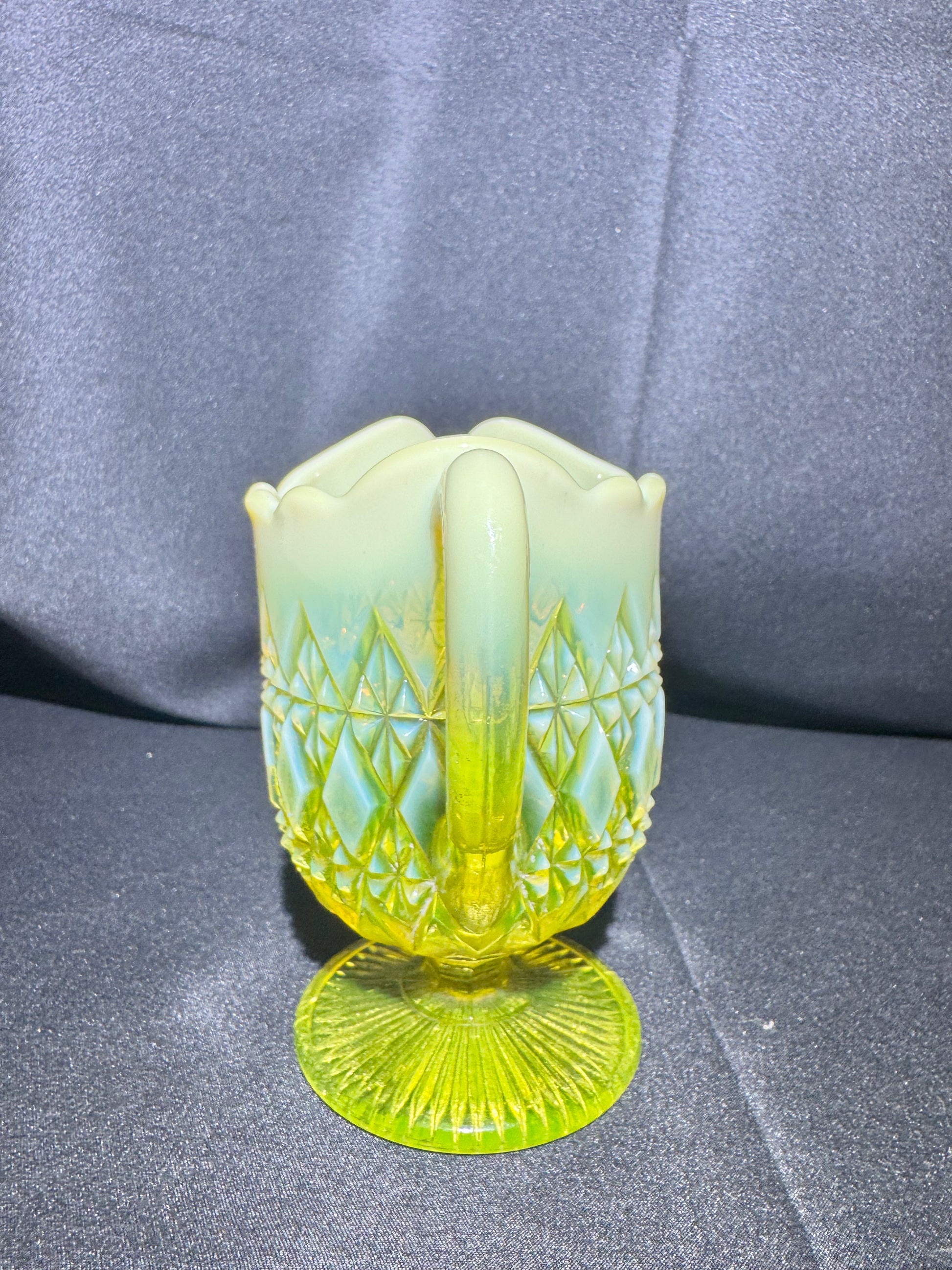 Add a glowing touch of vintage elegance to your collection with this beautiful Davidson “Prince William” Primrose Pearline Pedestal Creamer. This charming piece features the signature translucent yellow-green uranium glass with a delicate pearline opalescent edge, glowing beautifully under UV light.