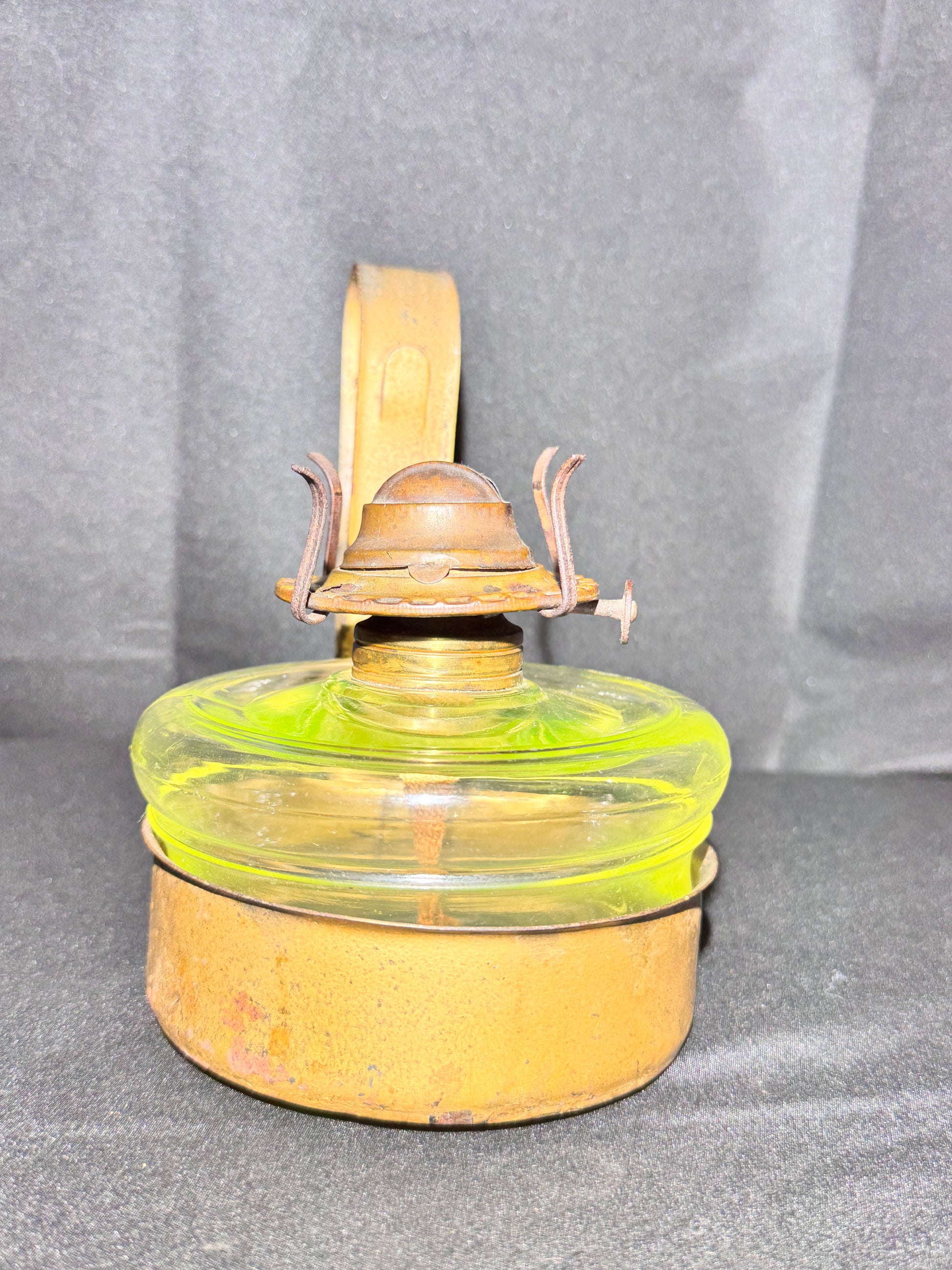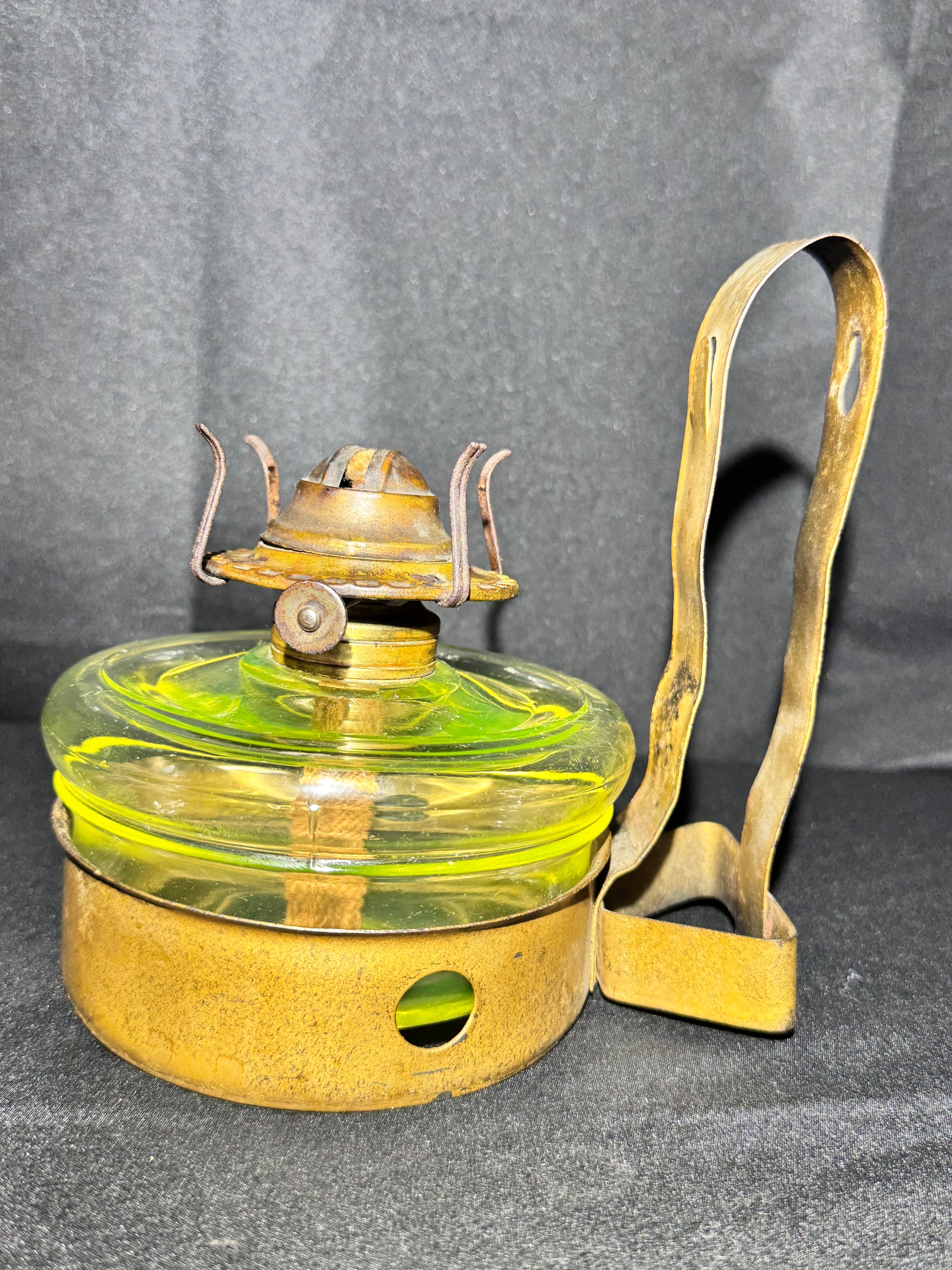 This is a beautiful and rare vintage oil lamp featuring a glowing Uranium glass font paired with a sturdy metal base and hanger, allowing it to be carried or hung on the wall. A great collectible piece that combines both function and charm.