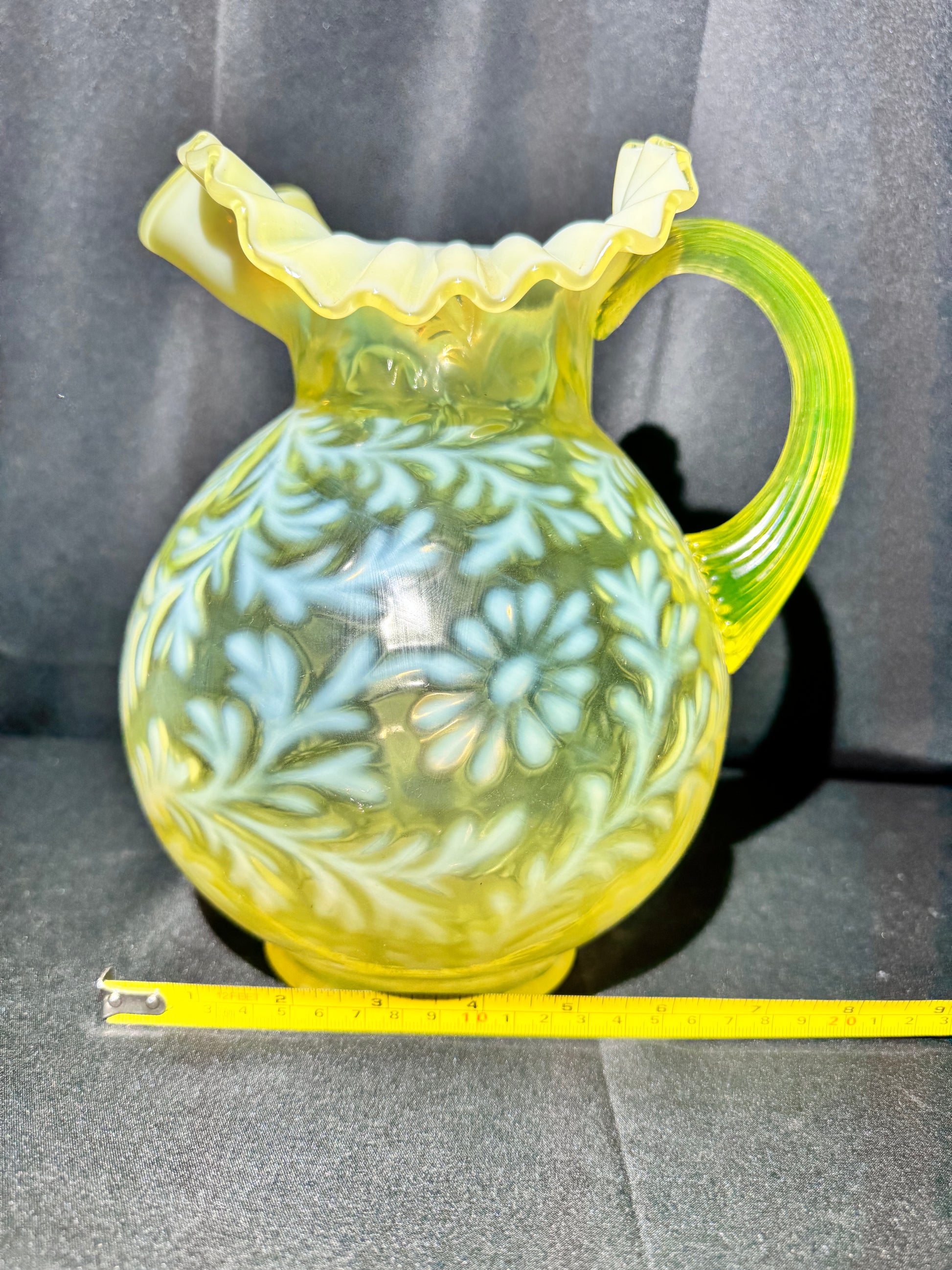 Vintage Uranium Glass Fern & Daisy Pitcher – Glows Under UV Light – 9.5” Tall x 7” Wide