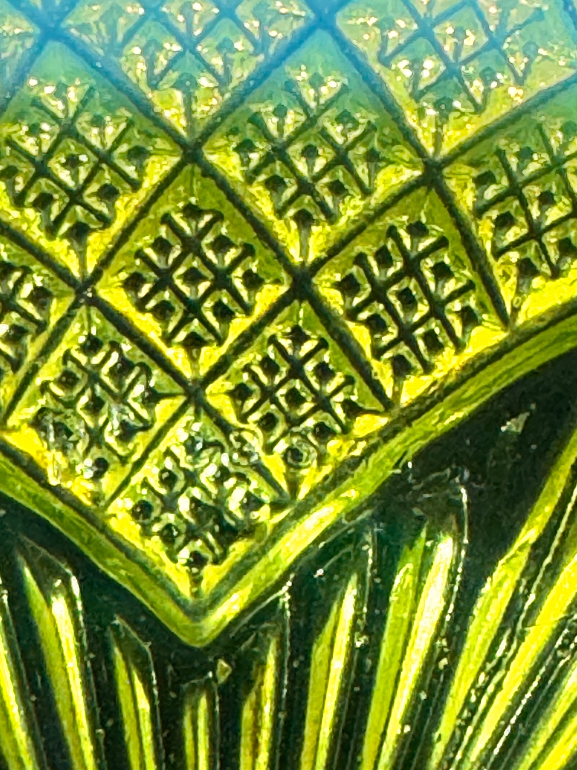The glass displays a lovely yellow Vaseline hue that glows brilliantly under UV light, complemented by a delicate white opalescent rim. The pattern, commonly referred to by collectors as “Queen’s Crown,” features an elegant diamond lattice pressed design with a softly scalloped edge, showcasing classic Victorian craftsmanship.