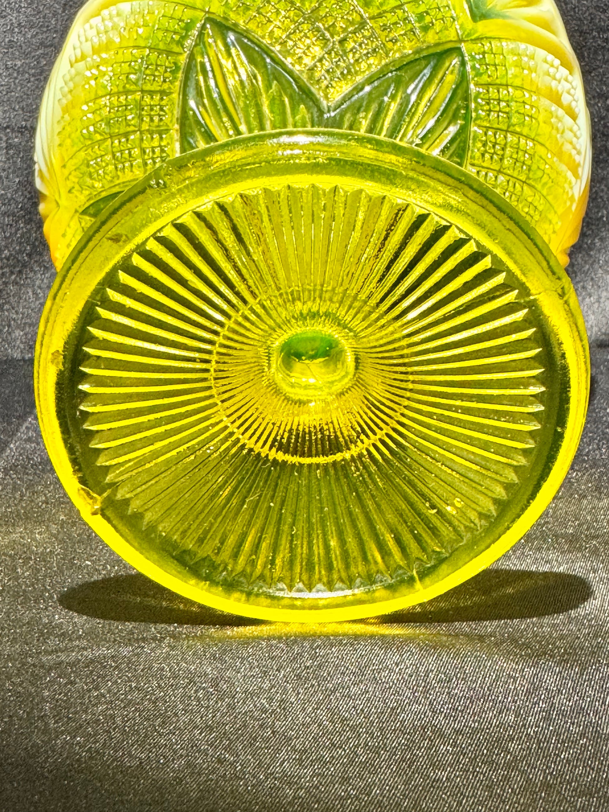 This compote is a wonderful example of late-19th-century British pressed glass and would make an excellent addition to any uranium glass, Vaseline glass, or Victorian art glass collection. Ideal for display, cabinet lighting, or as a standout centerpiece.