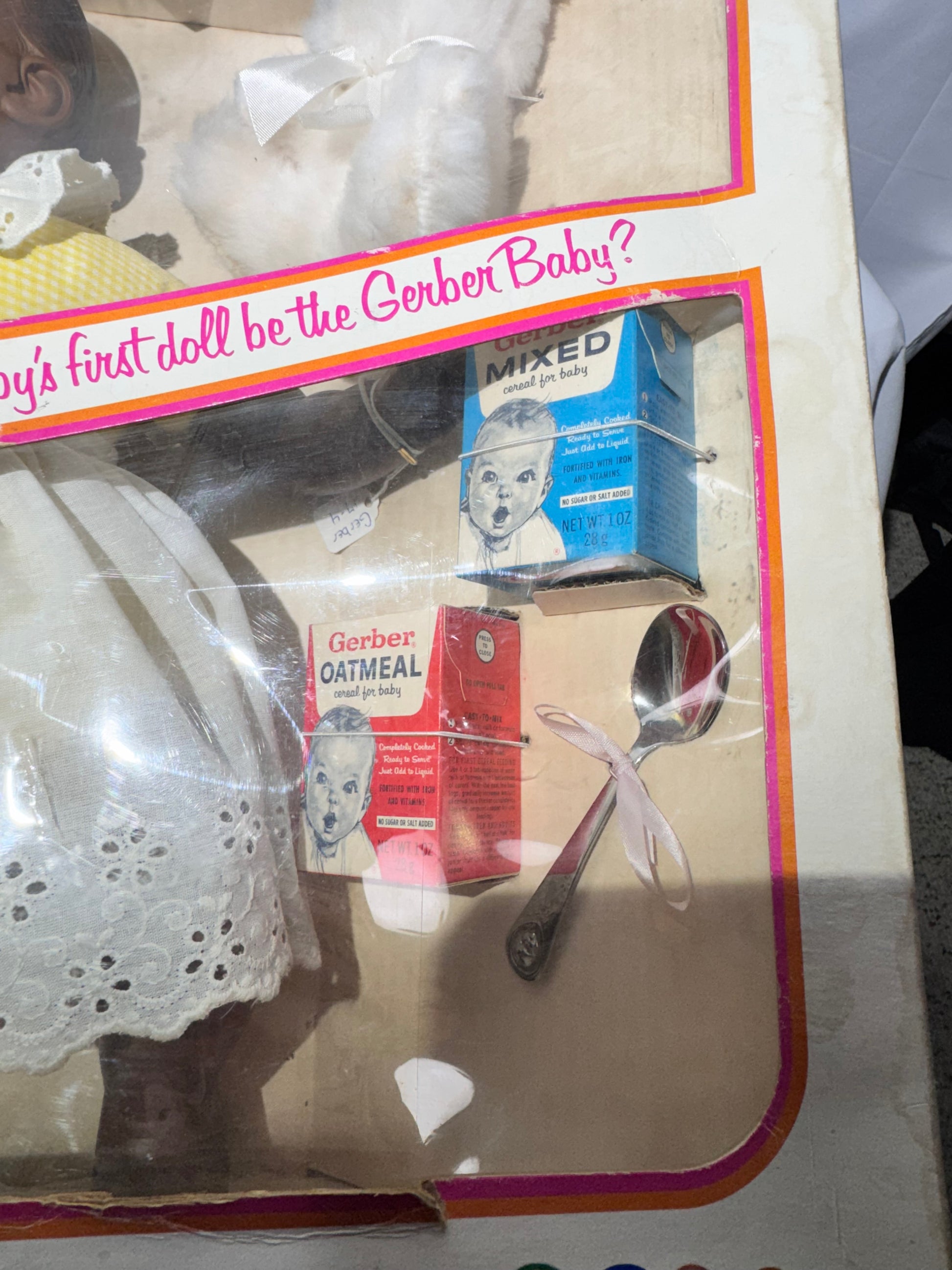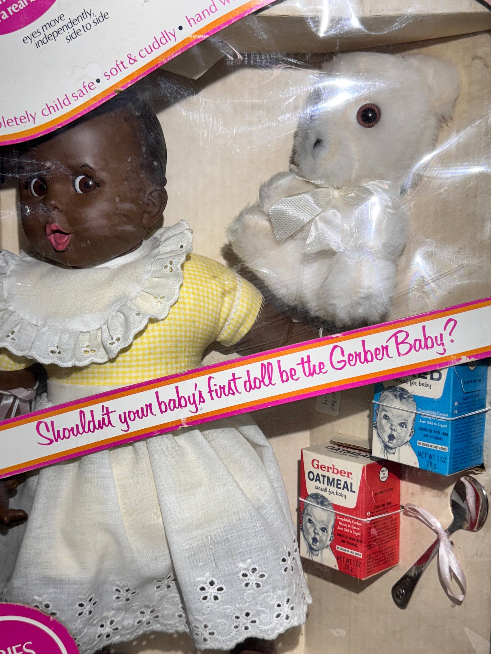 This adorable vintage 1979 African American Gerber Baby Doll comes complete in the original box with all accessories — including the Gerber bear, two mini boxes (Gerber Oatmeal & Gerber Cereal), and a baby spoon.