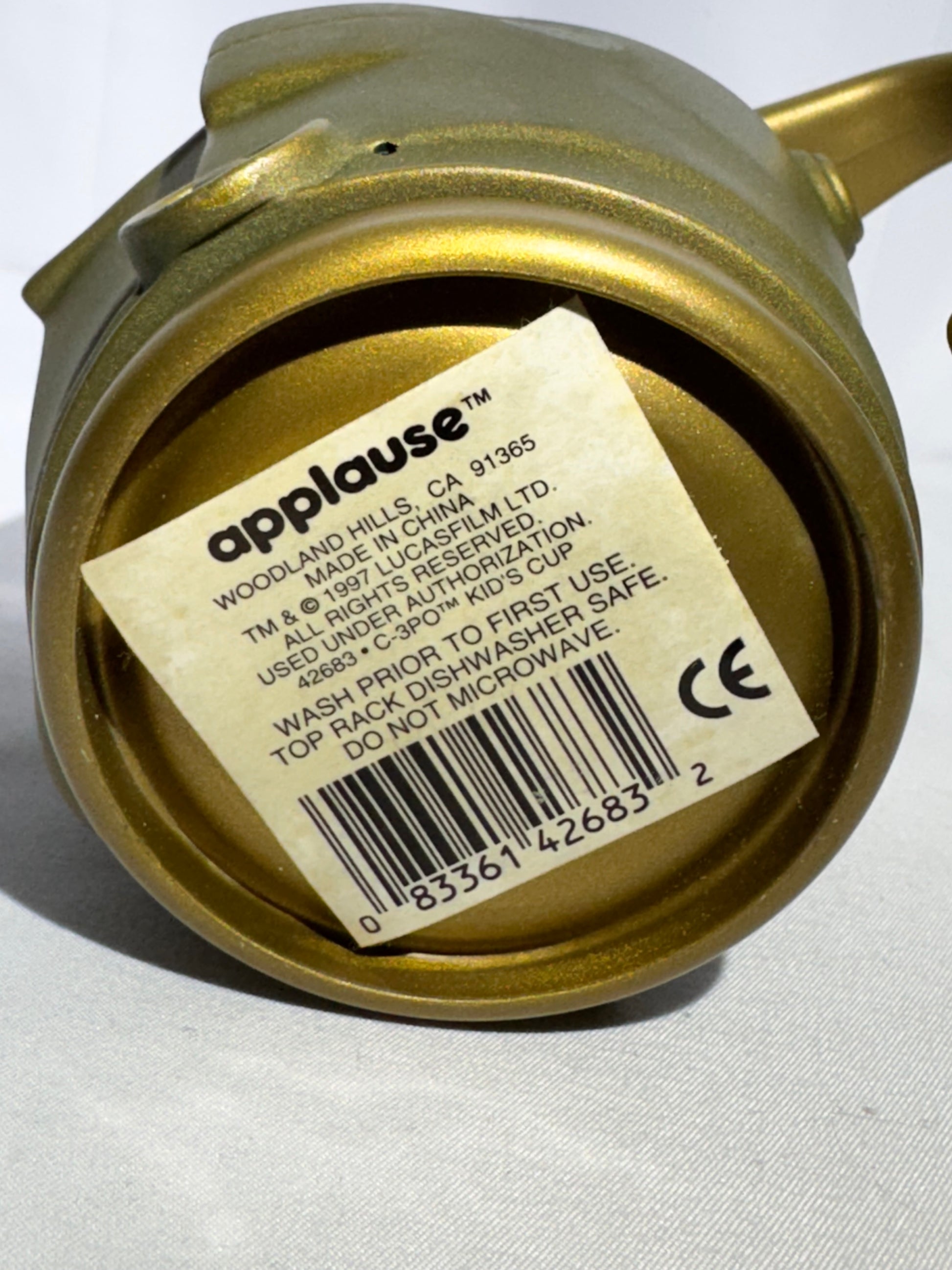 Add a classic piece of Star Wars memorabilia to your collection with this vintage 1997 C-3PO 3D mug produced by Applause. Featuring the iconic protocol droid C-3PO from Star Wars, this mug is a fun and nostalgic collectible from the late 1990s.